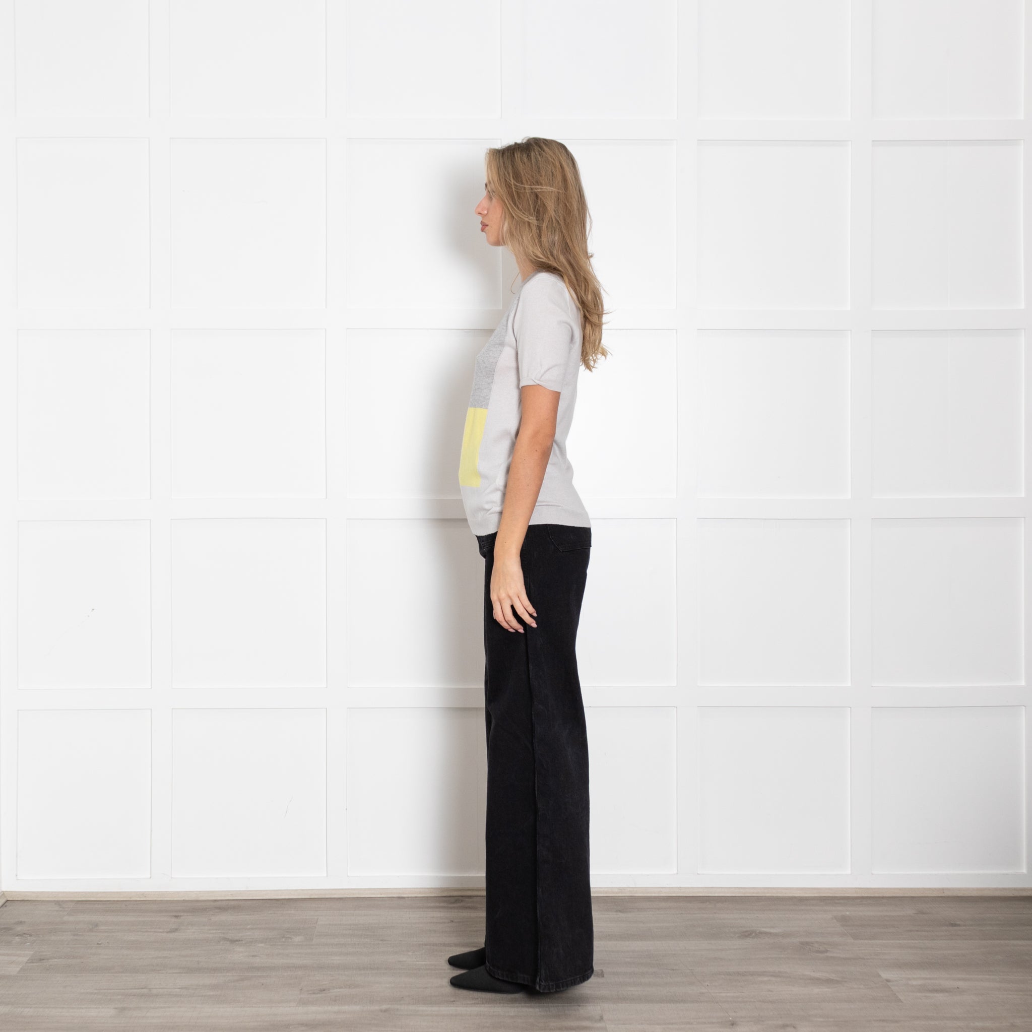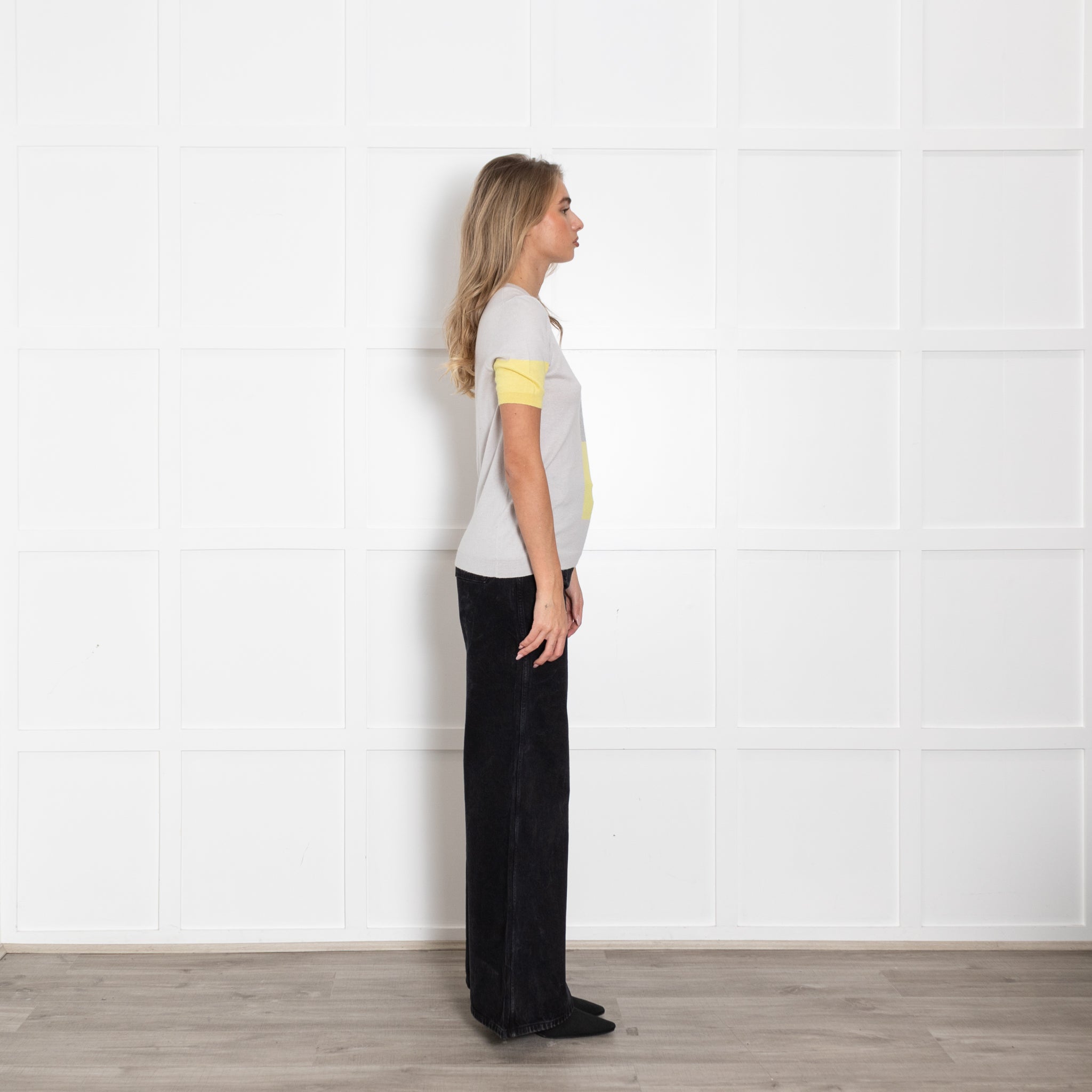 Allude Pale Grey Yellow Detail Short Sleeved Knit Top