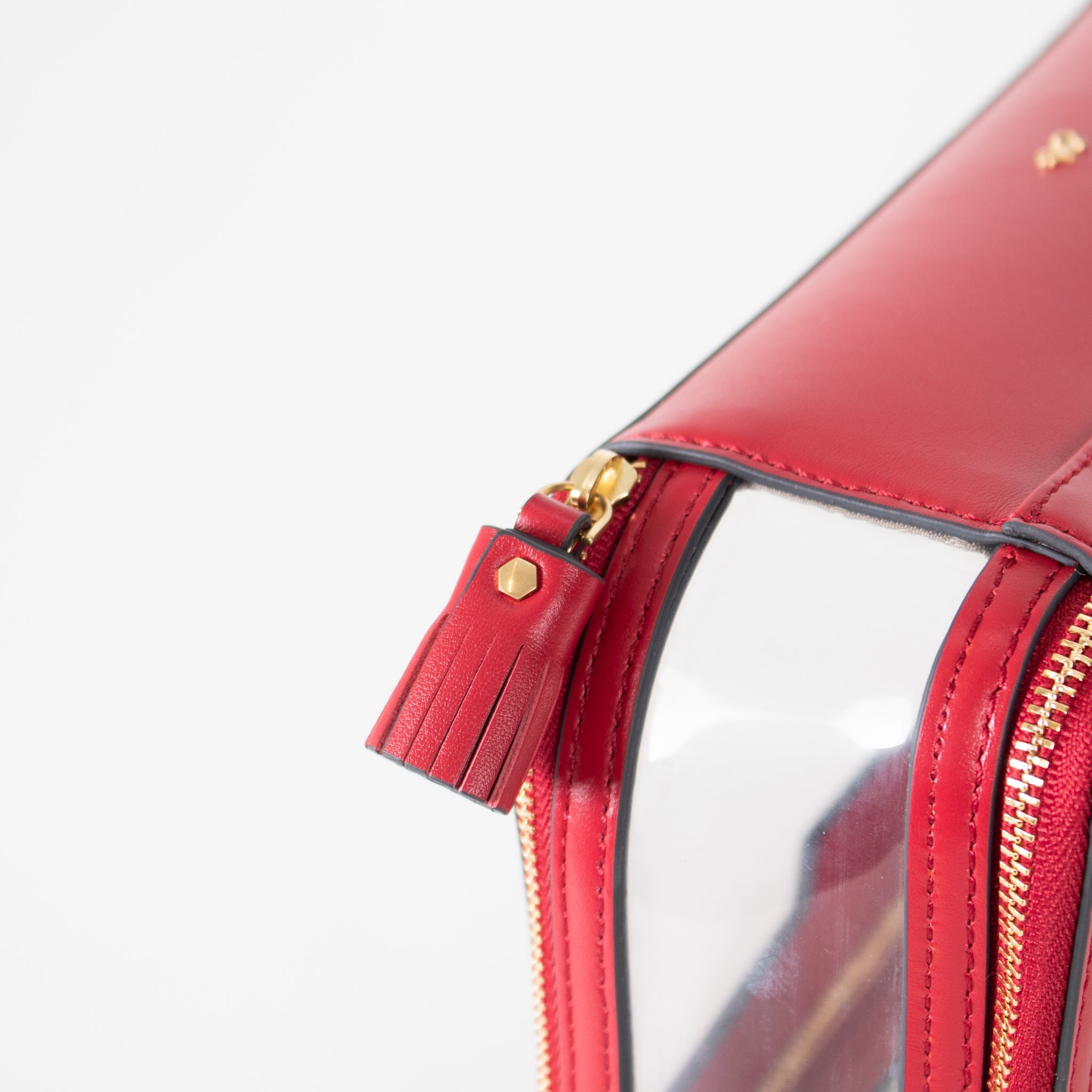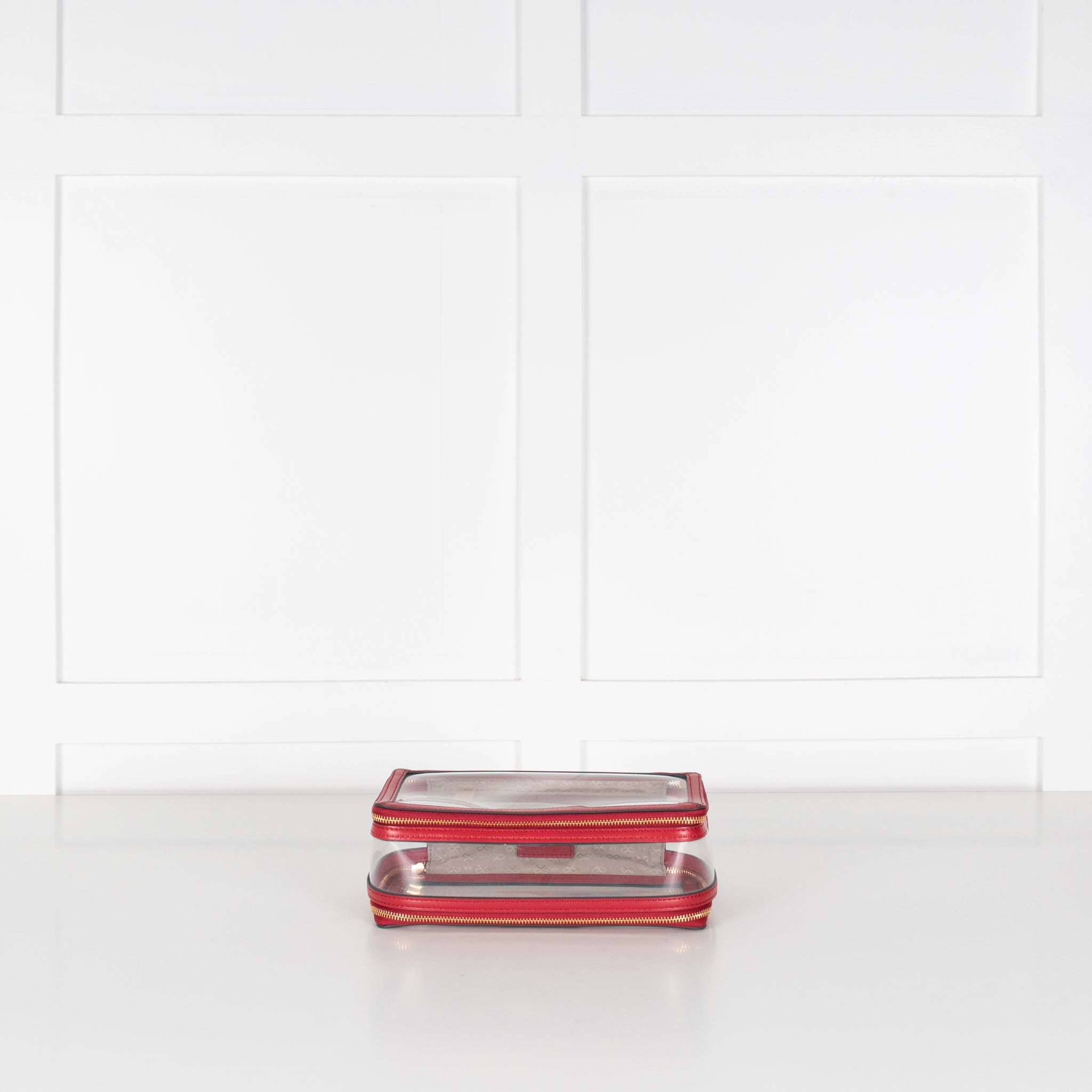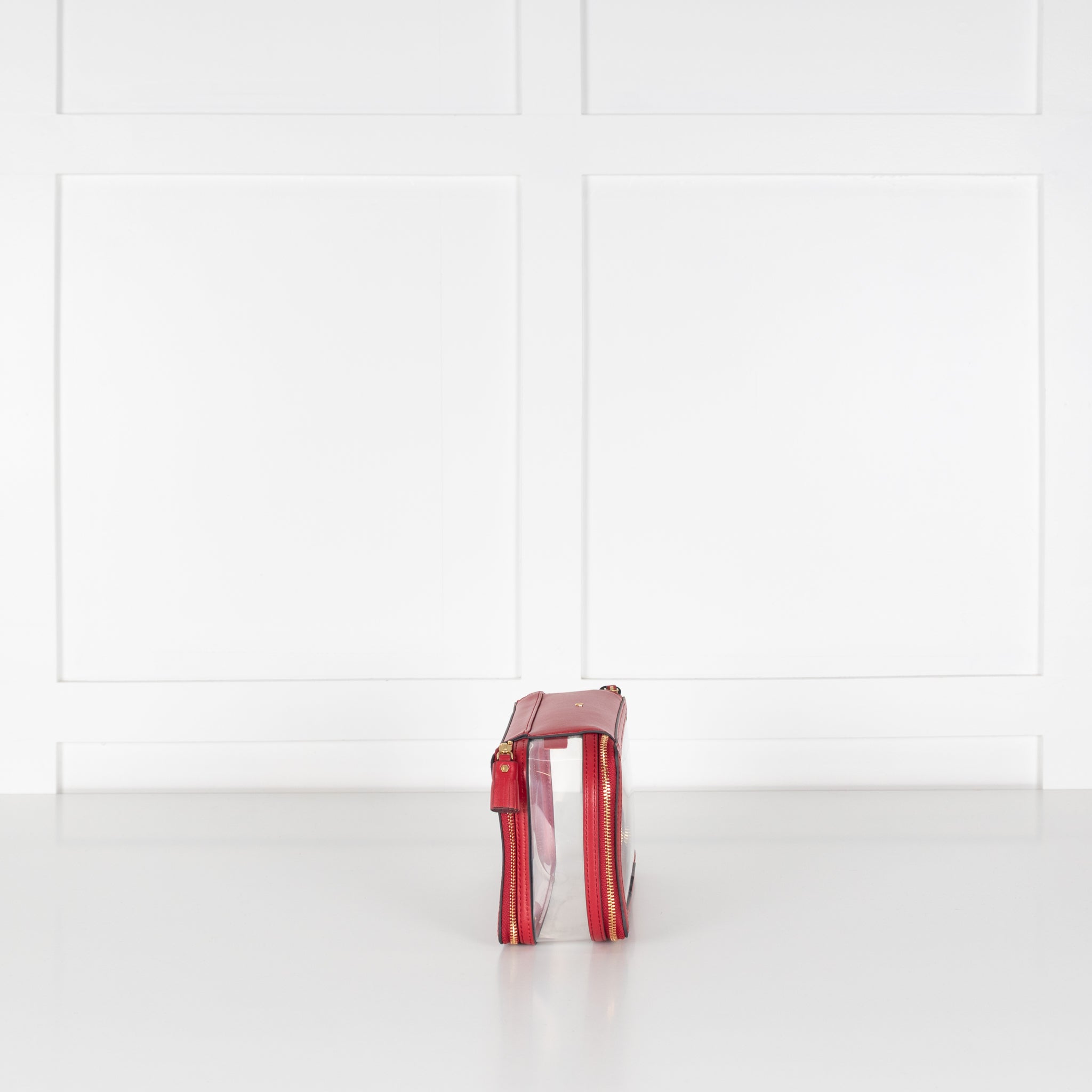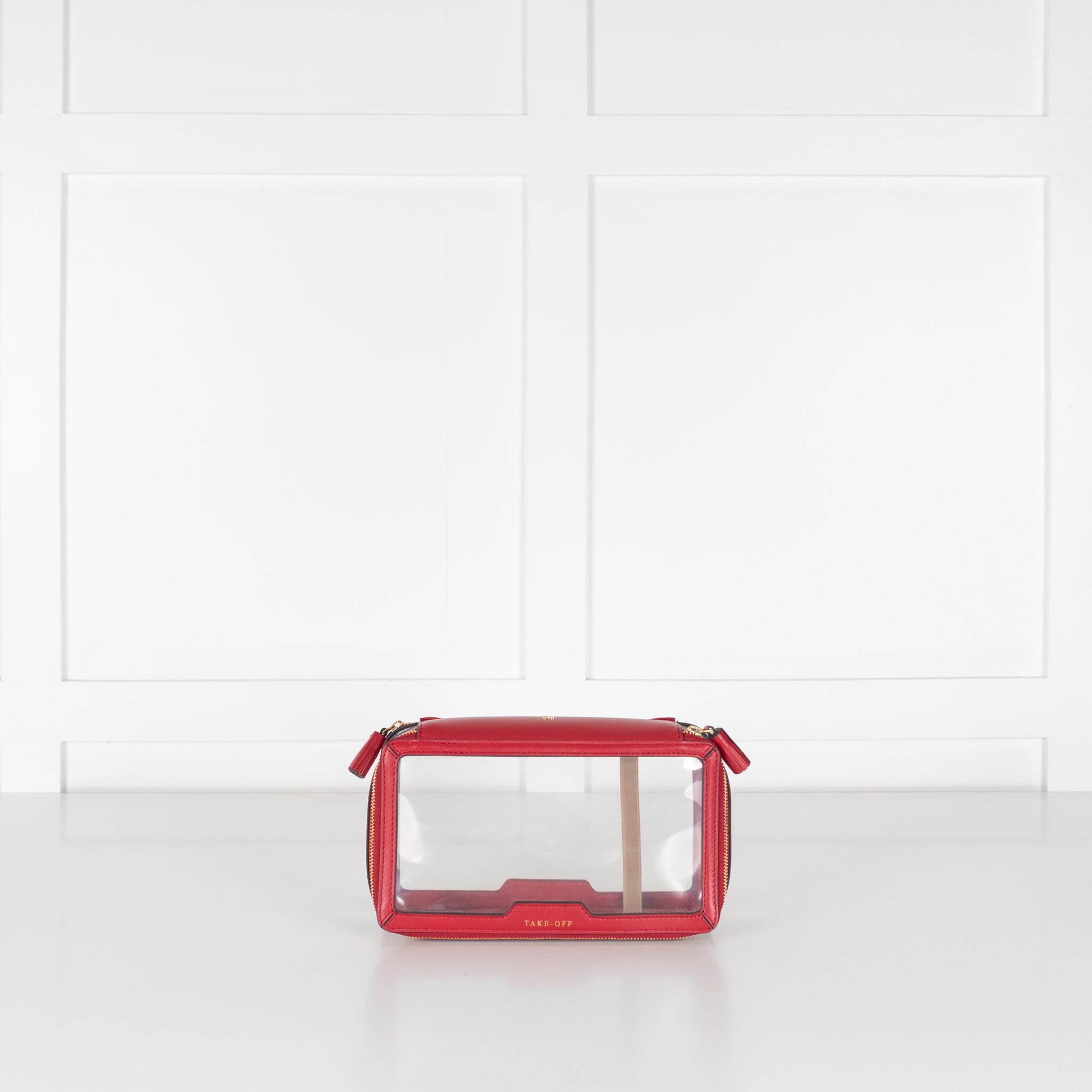 Anya Hindmarch red make-up bag, crafted with leather trims, a transparent main body, featuring a touch-down design, with two separate compartments, and gold hardware. The front of the bag features a written 'Take Off', and the back features 'Touch Down'. This bag is accompanied by the original dust bag.