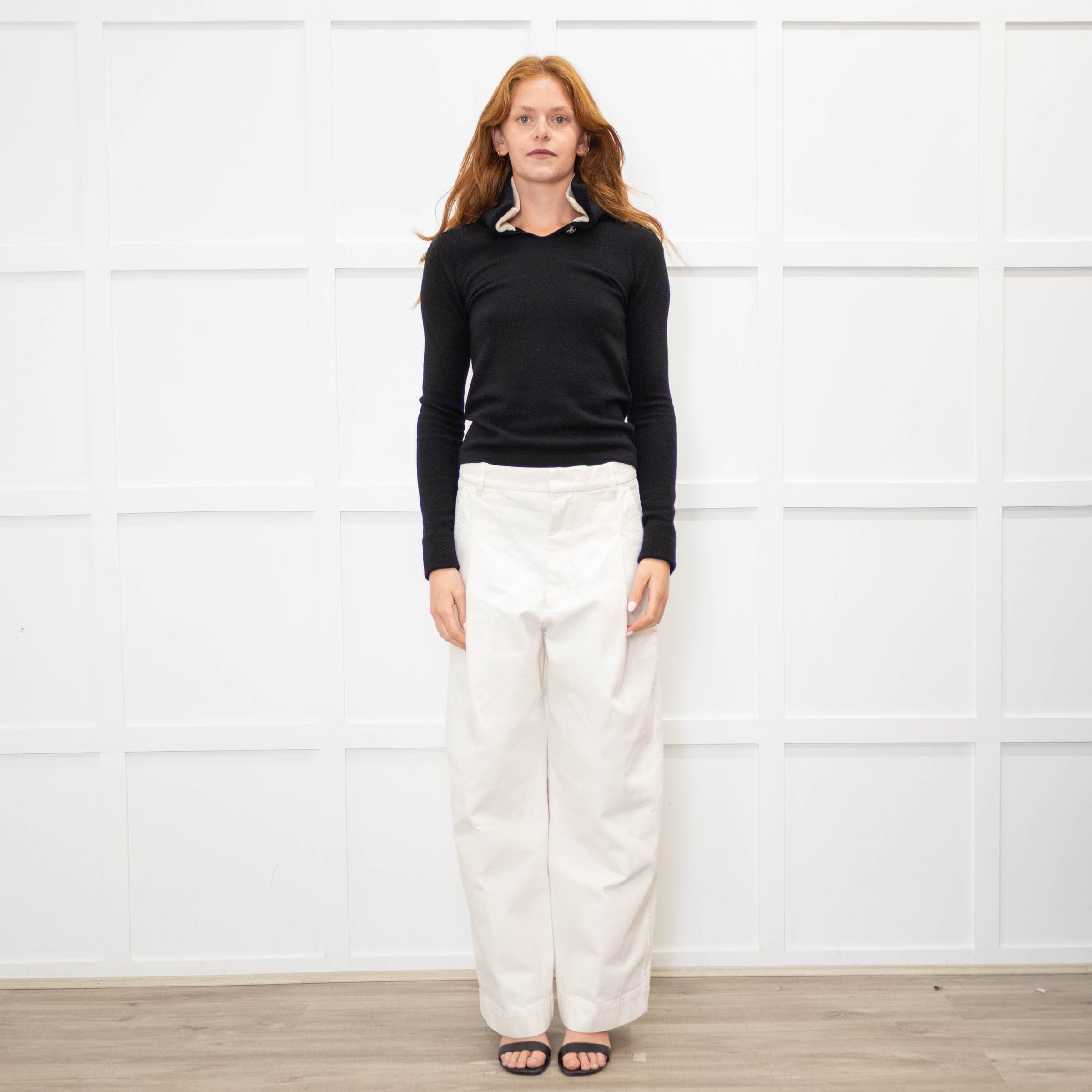 Chanel black cashmere sweater with a double-up collar with a cream insert, a CC logo button at the neck, long sleeves, and branded knit-covered buttons at the cuff.