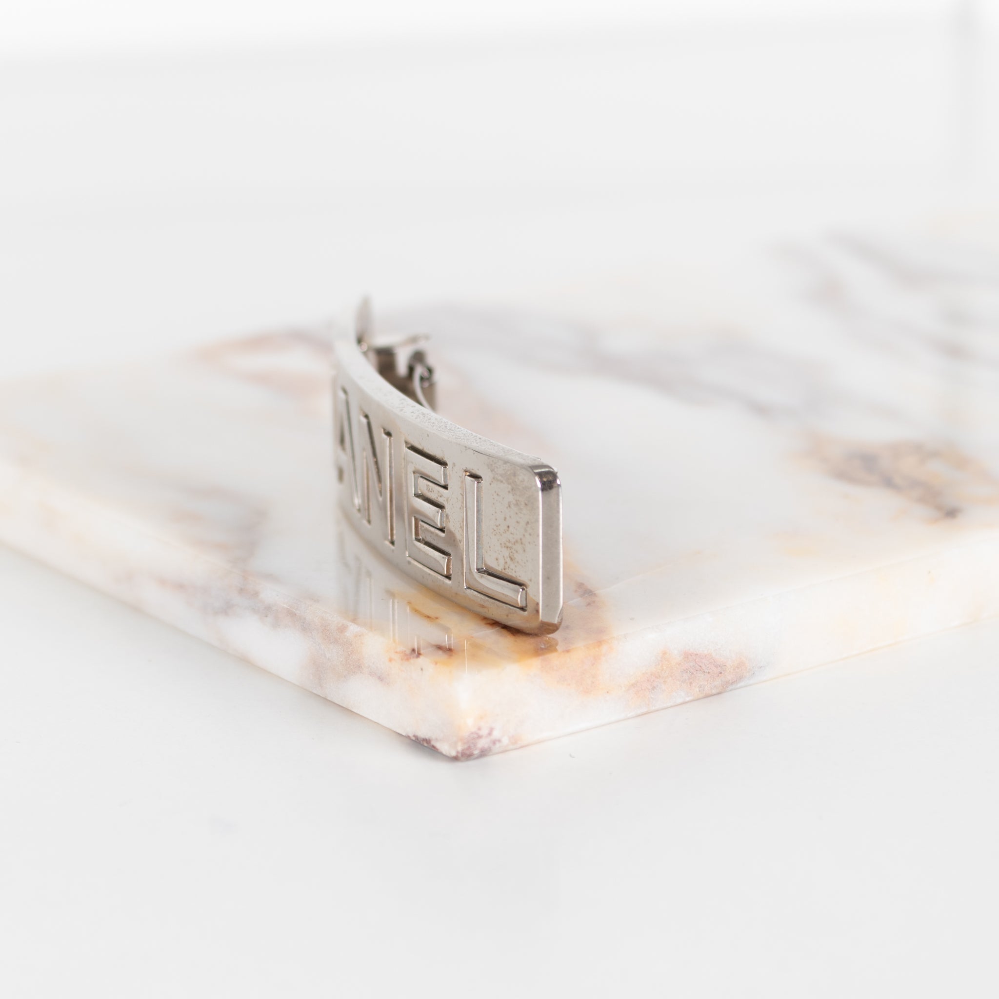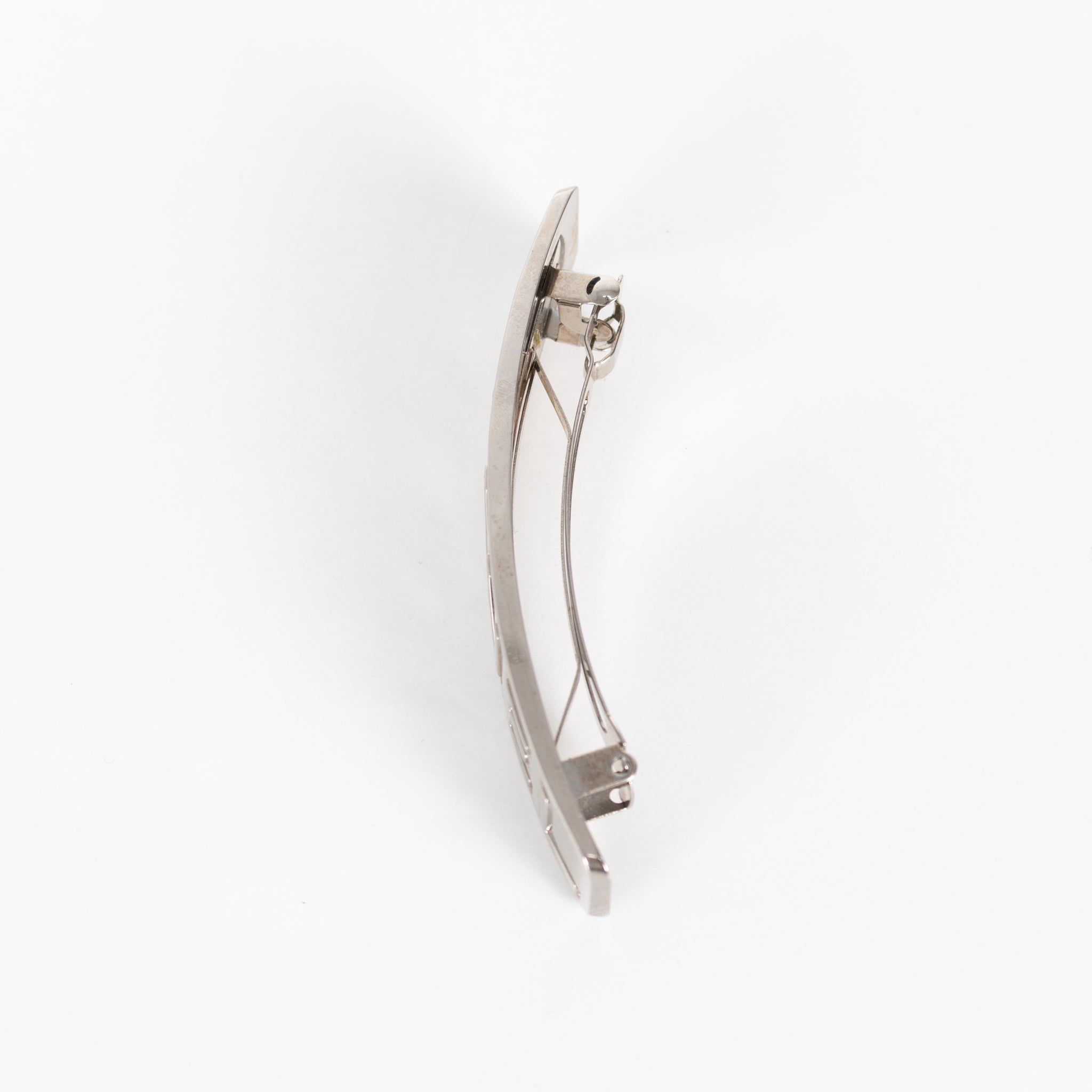 Chanel silver tone barrette. Made in France, this beautiful hair clip features a bold Chanel logo.