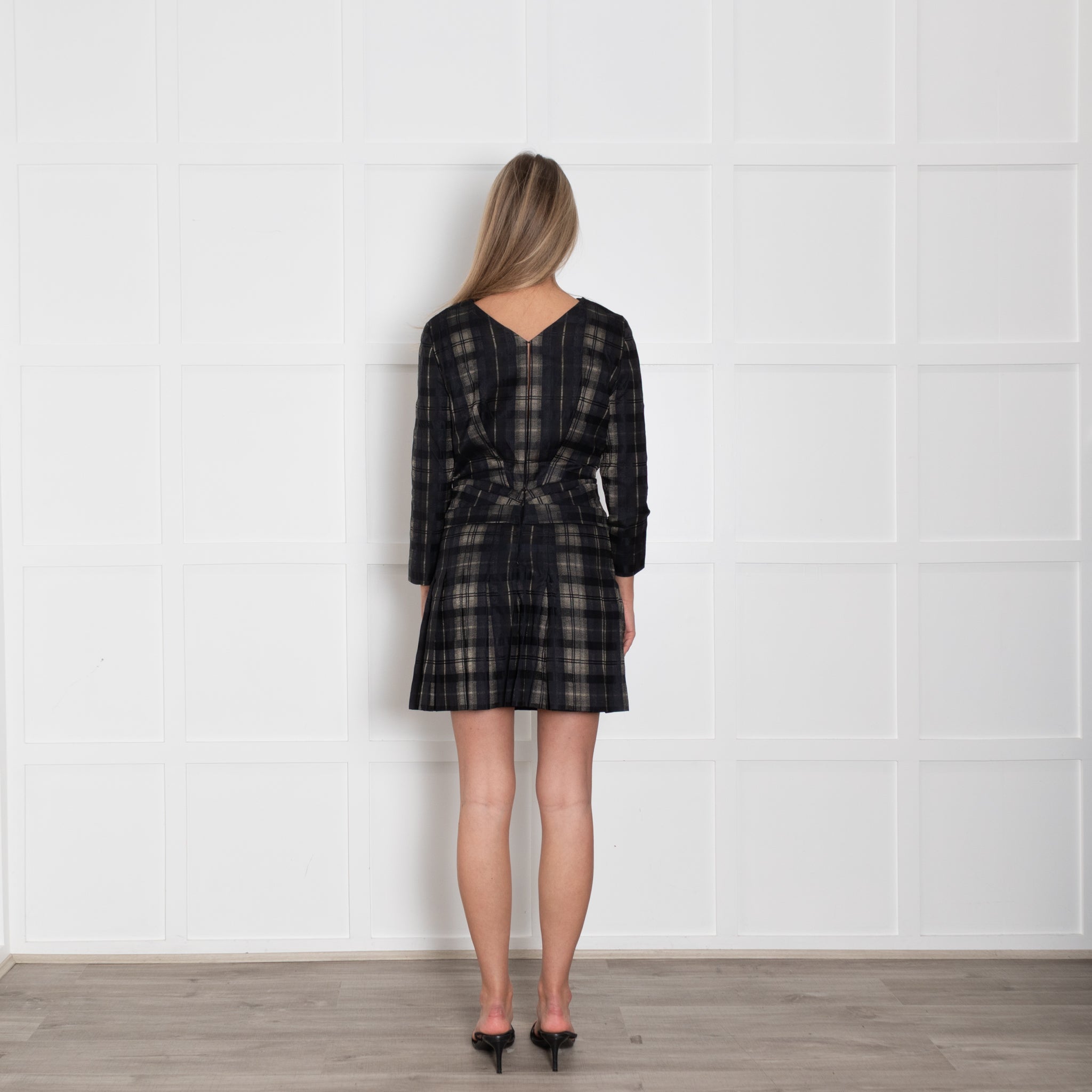 Chloe black long-sleeve mini dress, featuring a stunning gold checked exterior deisgn, with a wool and silk blend fabric and a subtle pointed neckline, a single front clasp with a zip-up front, the skirt features a pleated fabric, with a folded belt.