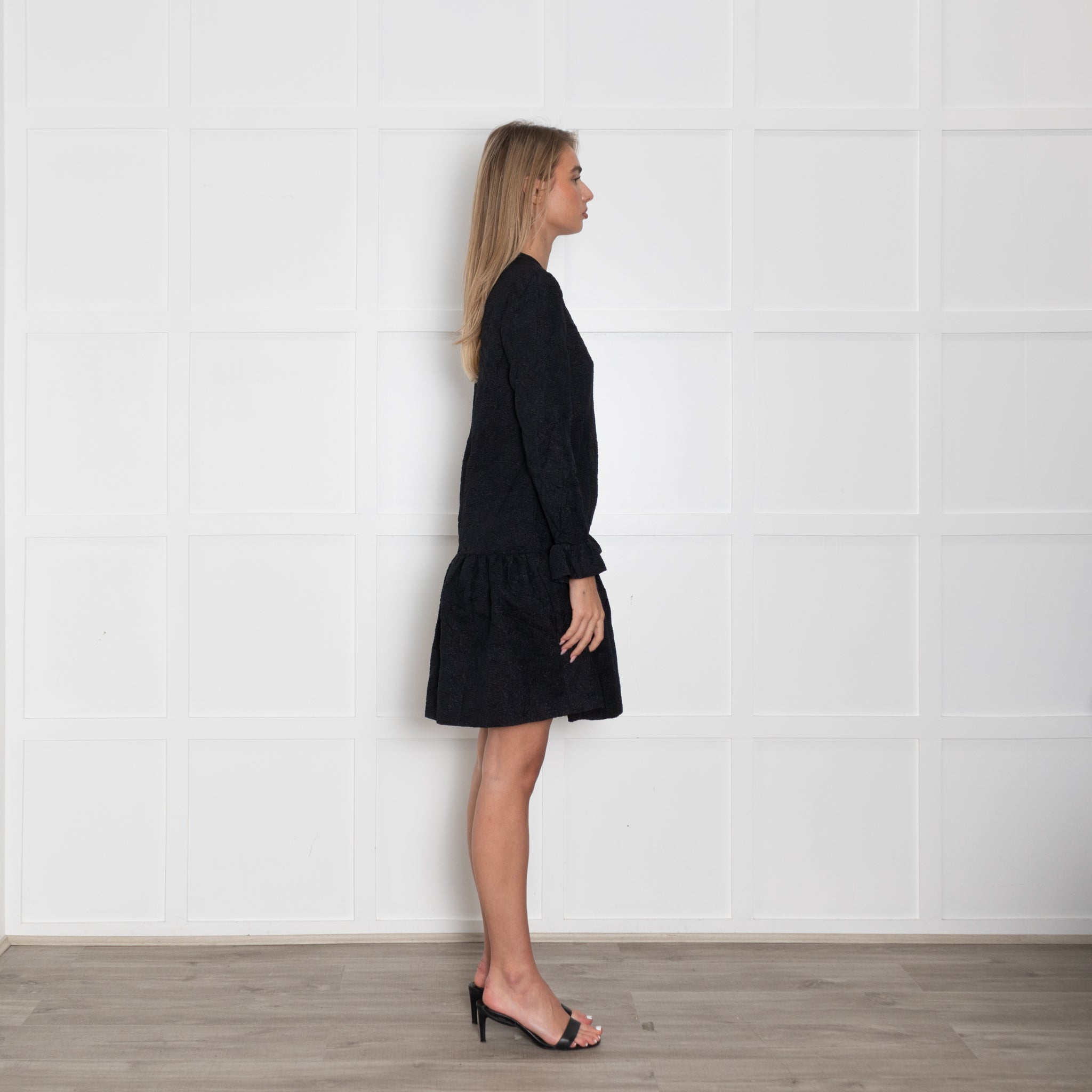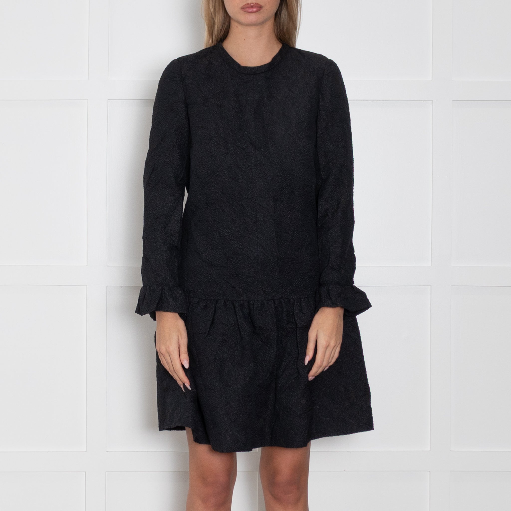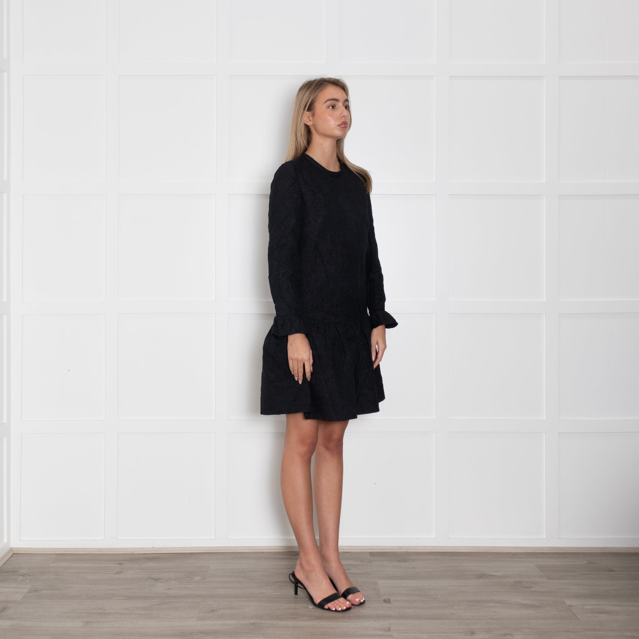 Chloe black mini dress, crafted with a silk blend fabric, featruing a textured design, with a rounded neckline, a zip-up back closure, and a pinched pleated skirt.