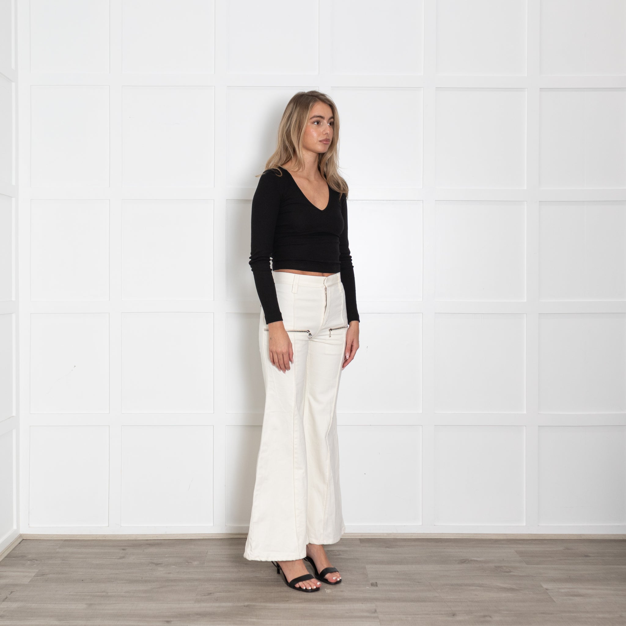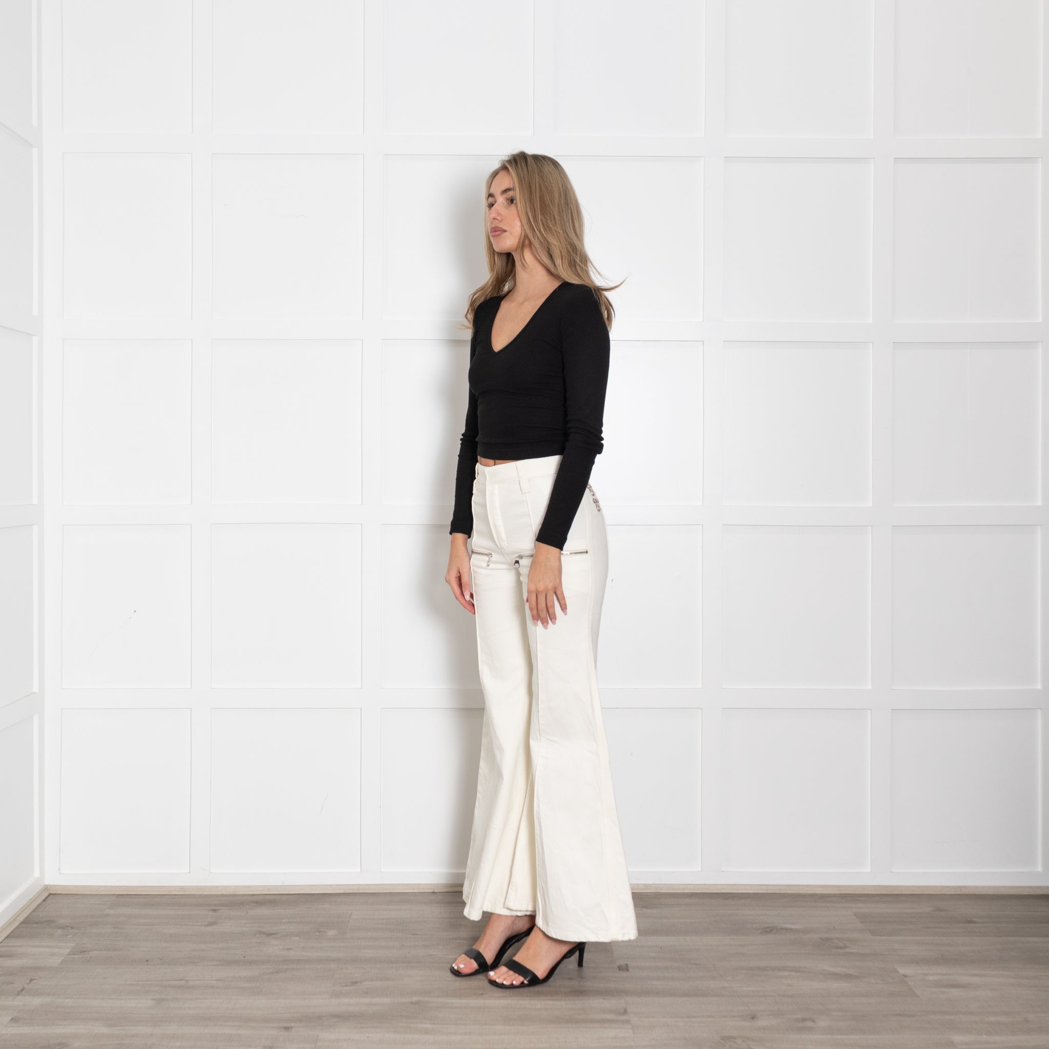 Chloe White Denim Flared Jeans with Silver Zip Details