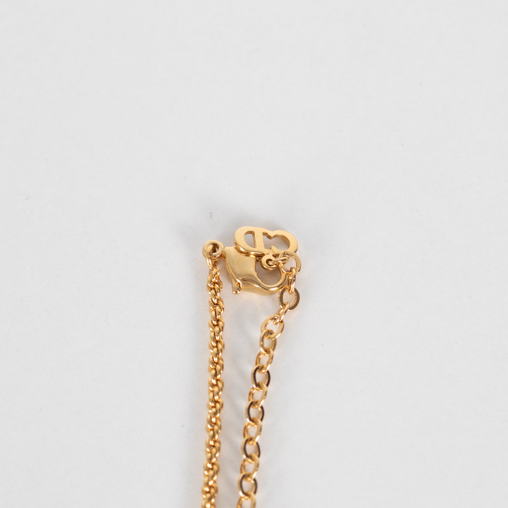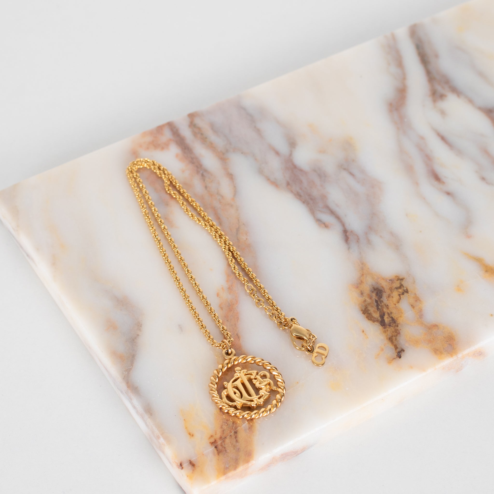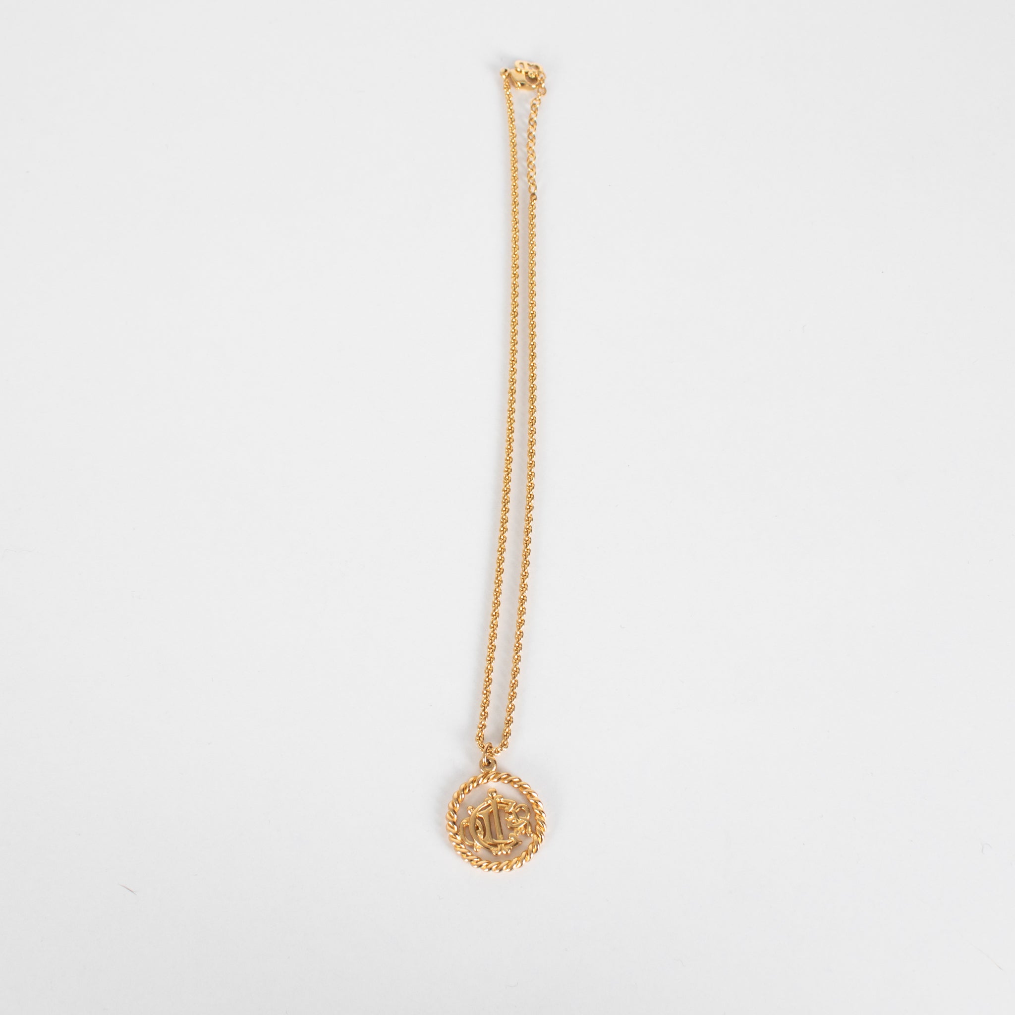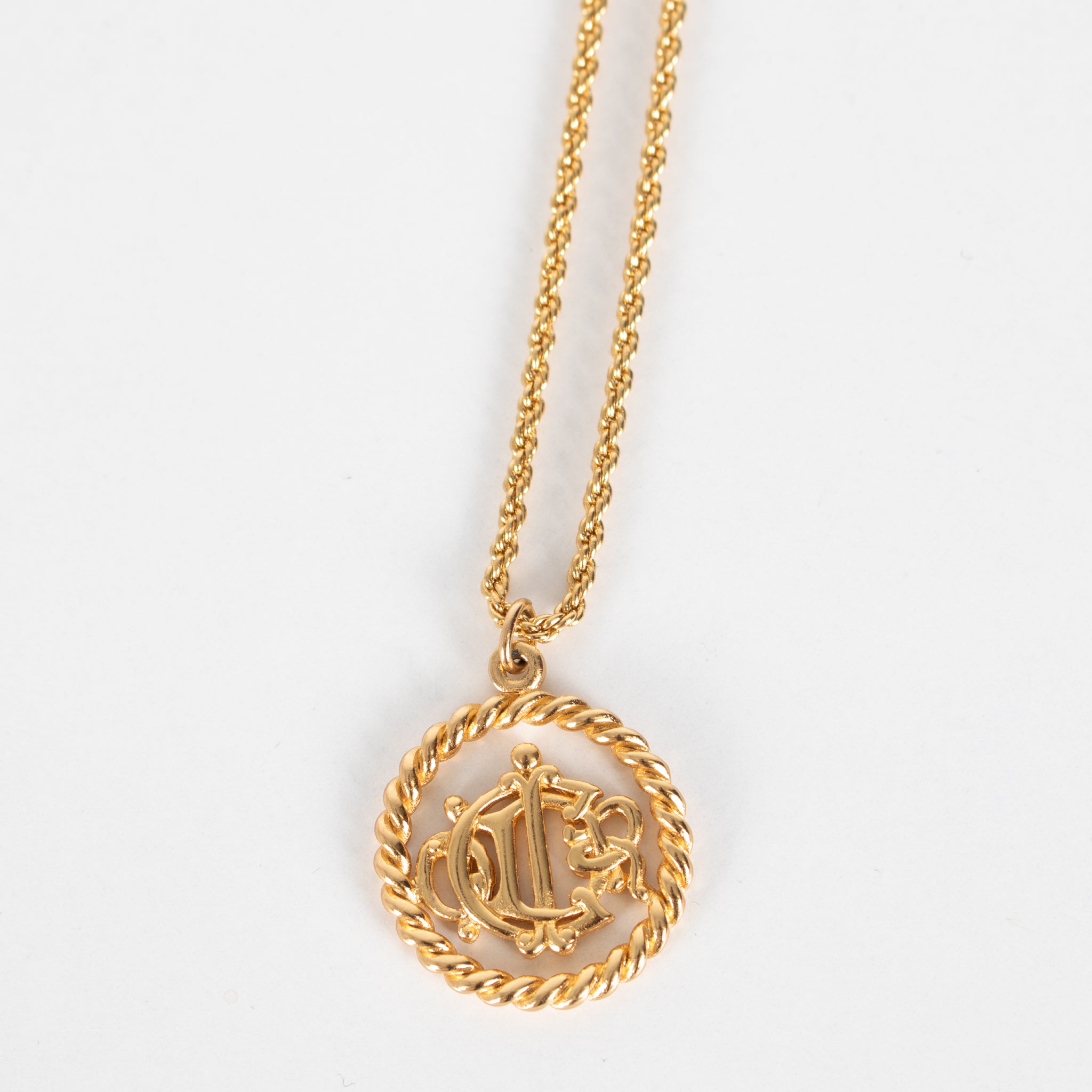 Christian Dior gold tone logo medallion necklace featuring the Christian Dior monogram of intertwined letters.