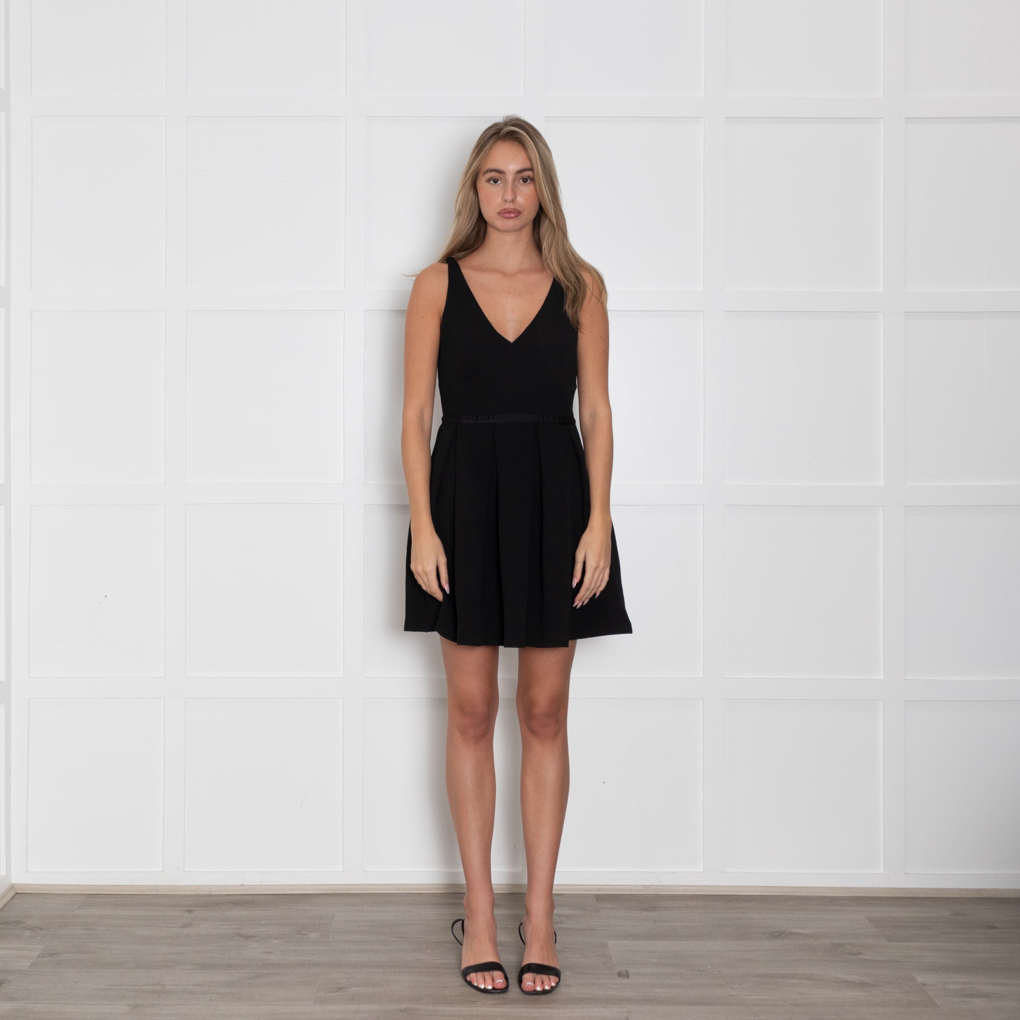 Claudie Pierlot black sleeveless mini dress, featuring a textured exterior design, with a flare skirt, a black on black waist tie, and a single side zip closure