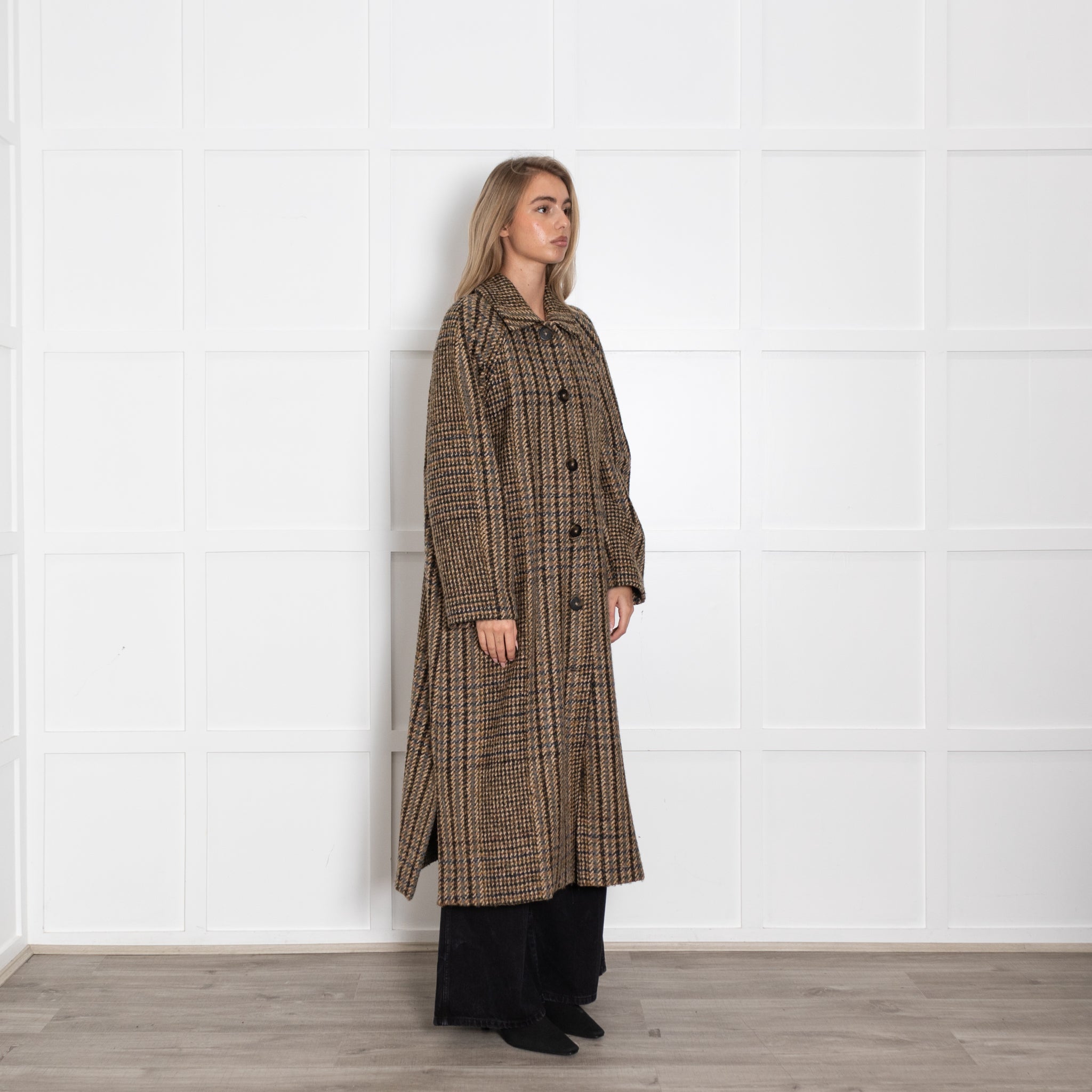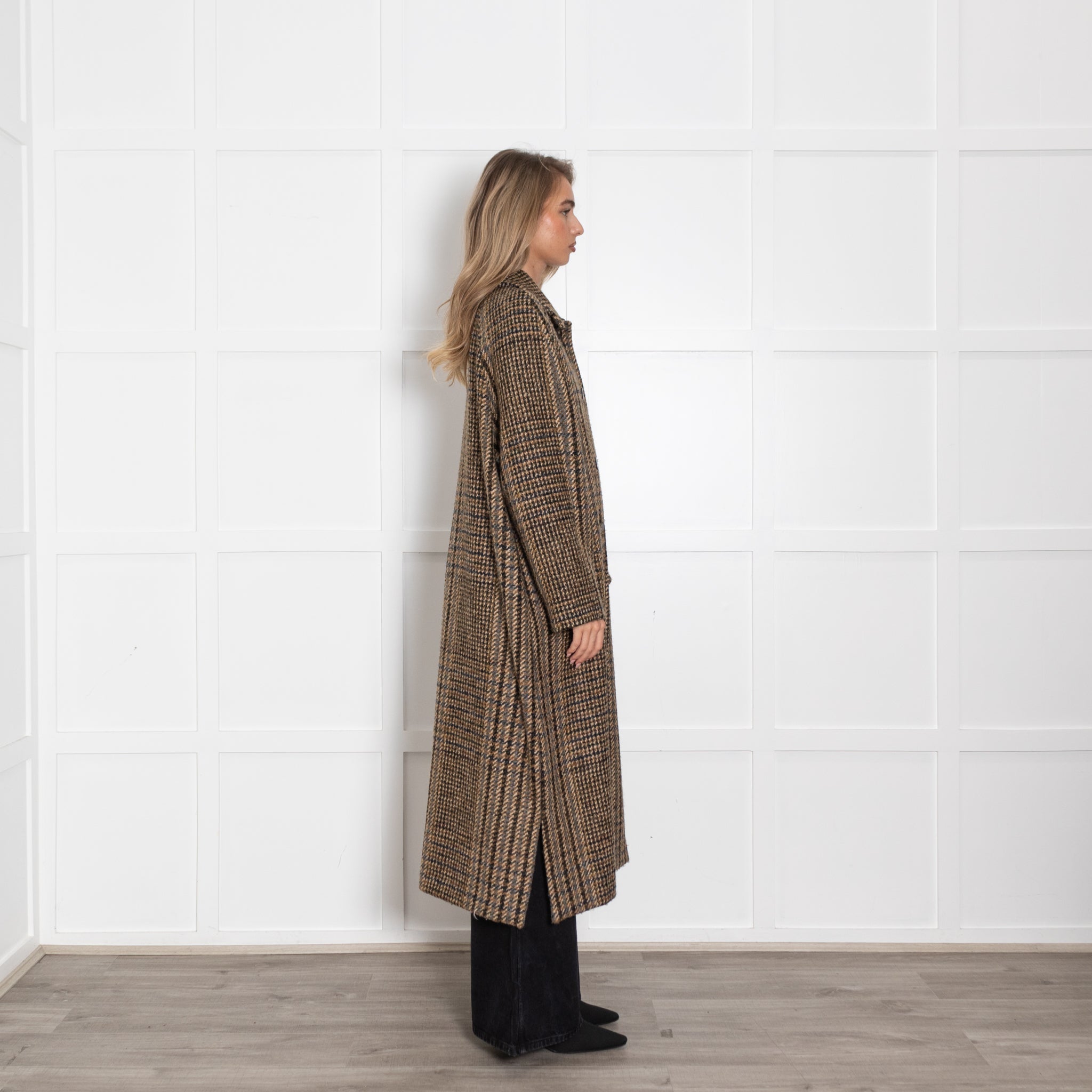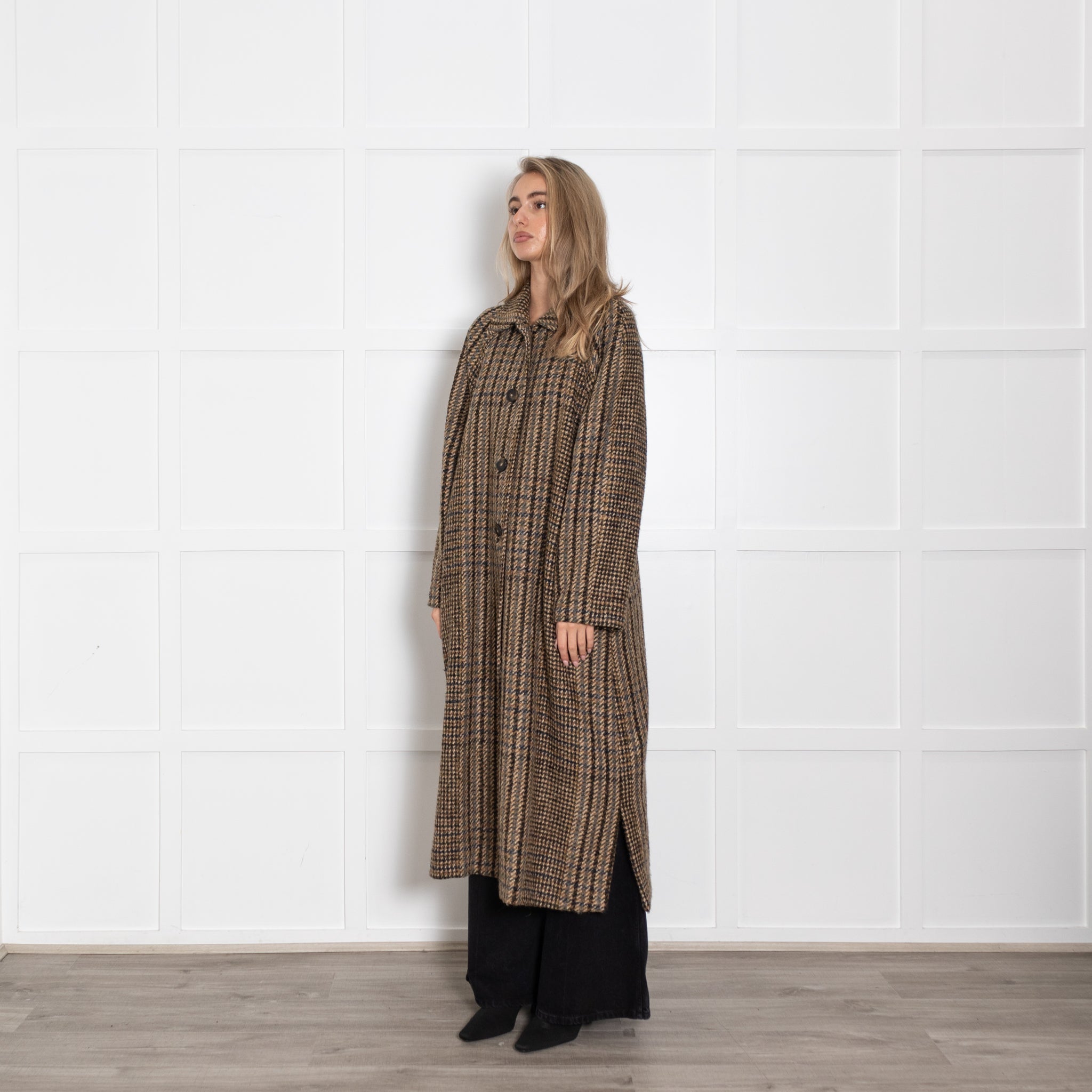 Diega brown long sleeve coat, featuring a checked design, with an unlined design, with a classic collar, two front pockets, and a button-up front closure.