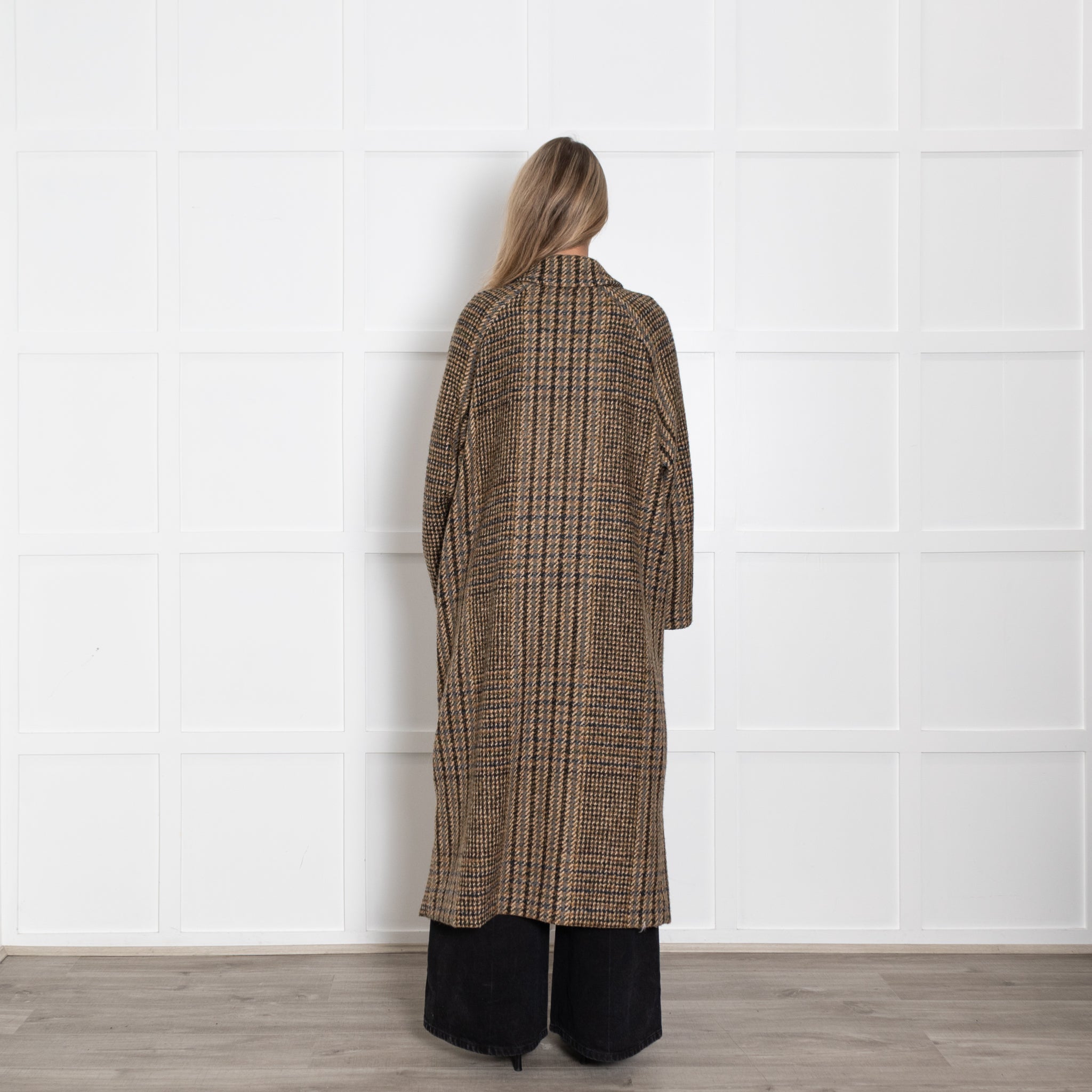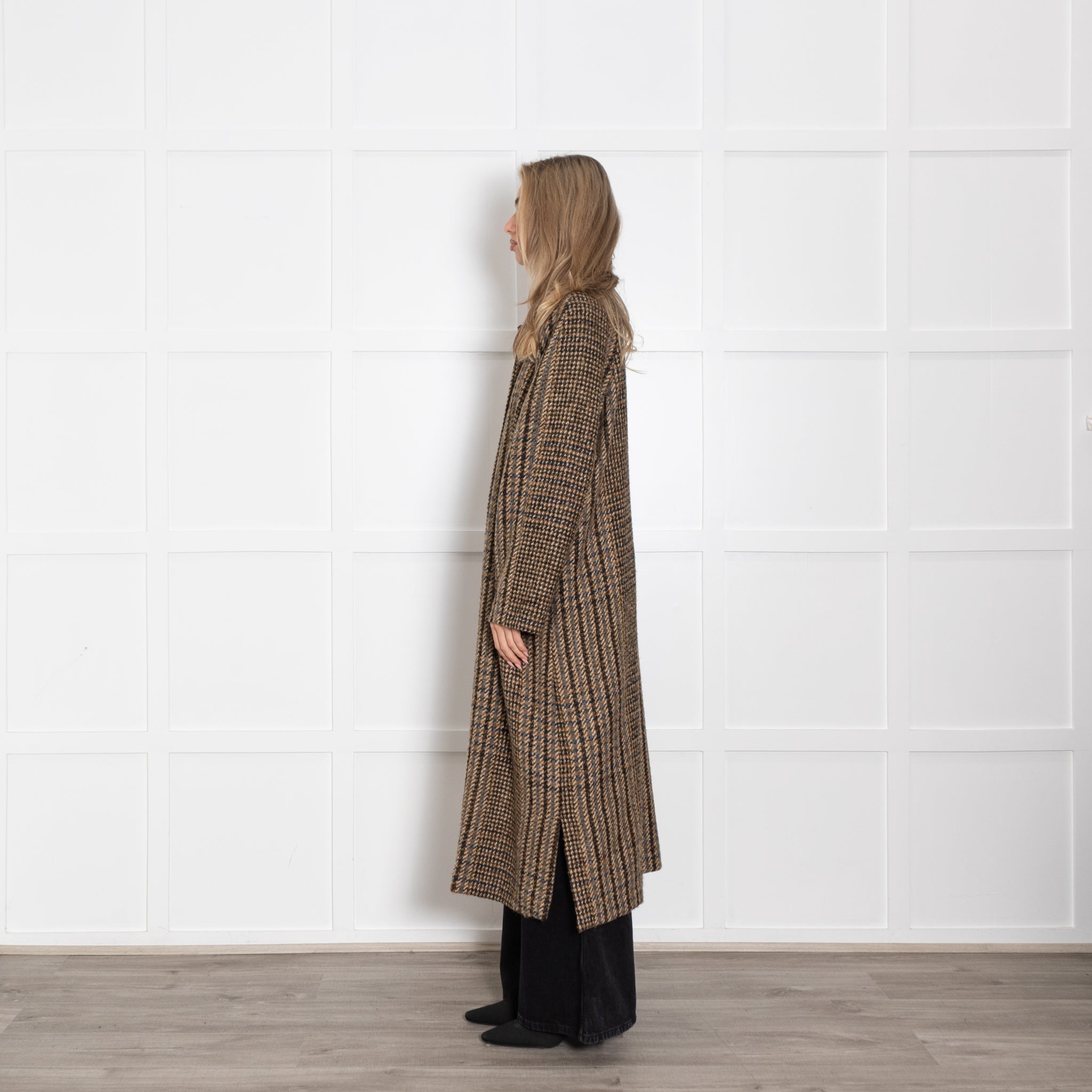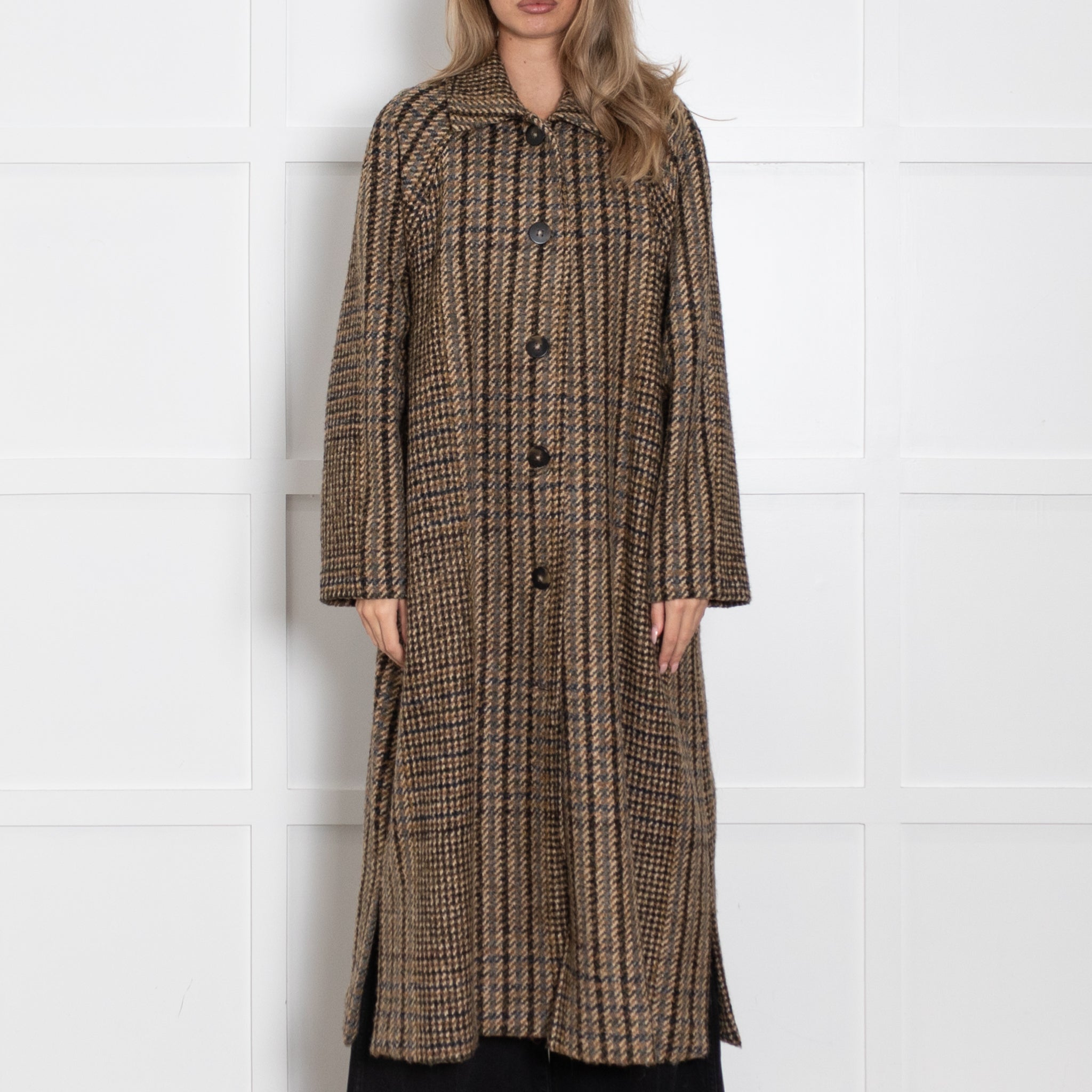 Diega brown long sleeve coat, featuring a checked design, with an unlined design, with a classic collar, two front pockets, and a button-up front closure.