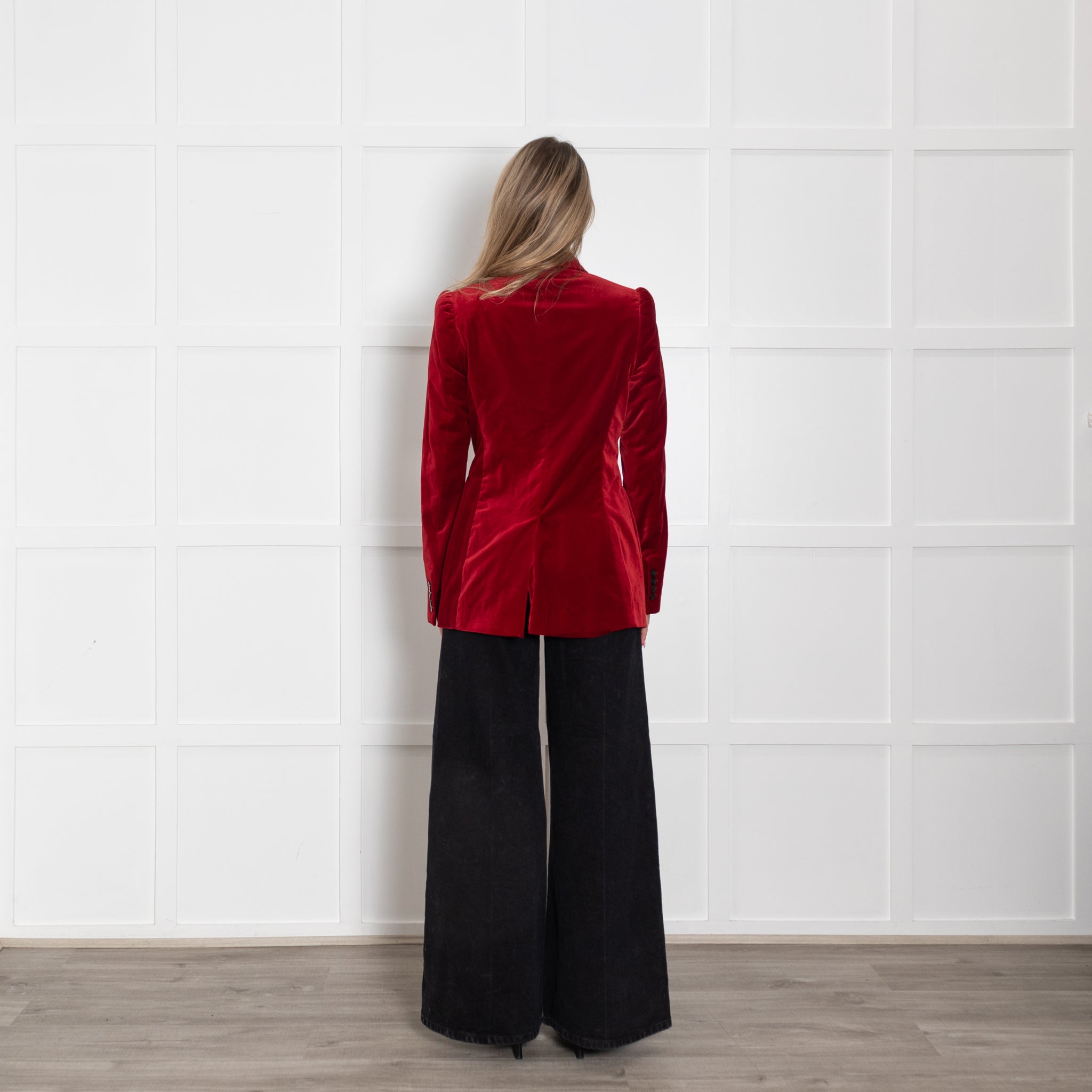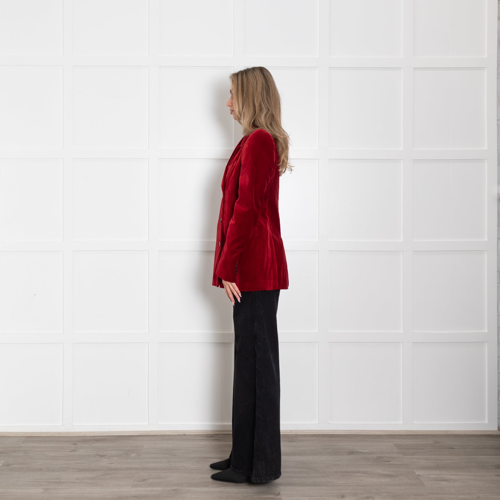 Dries Van Noten dark long-sleeve red blazer, featuring a velvet exterior lining, with puffed shoulders, a button-up front closure, and two front side pockets.