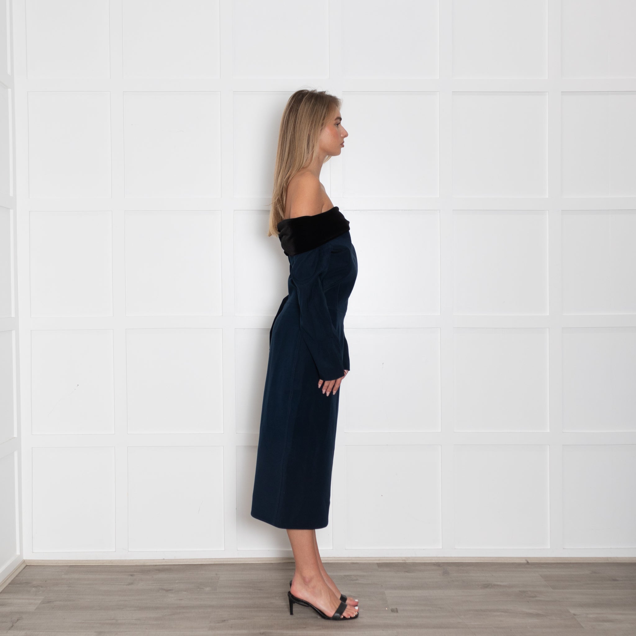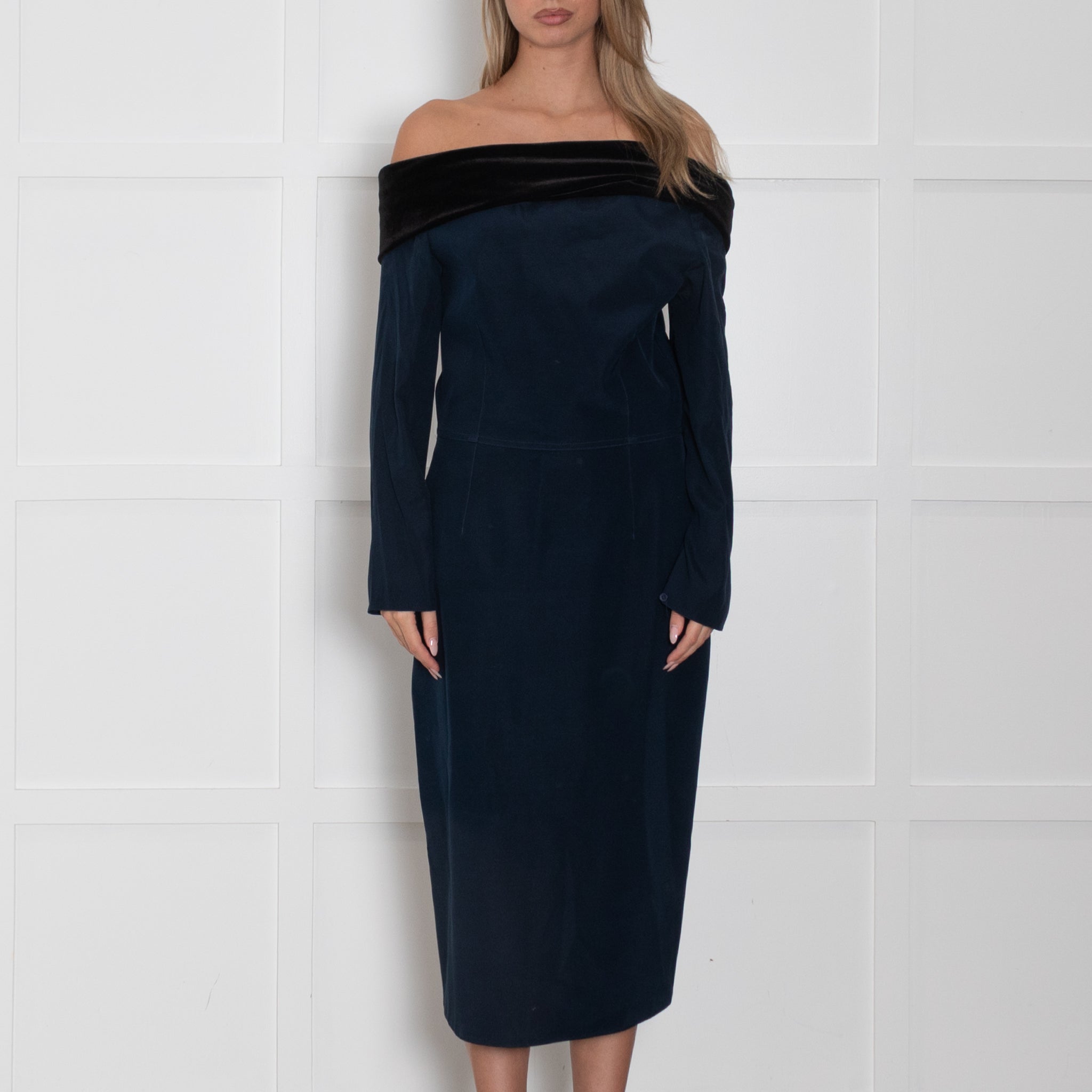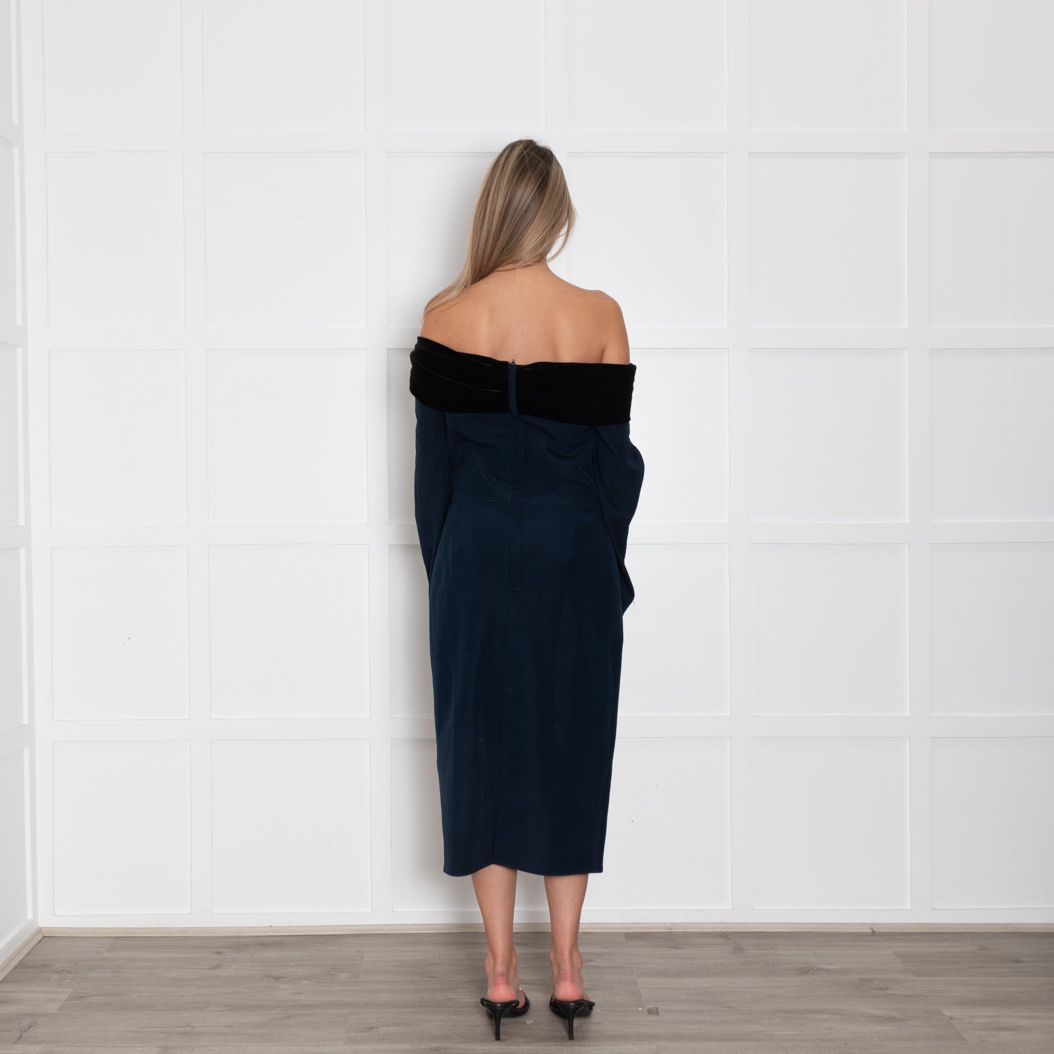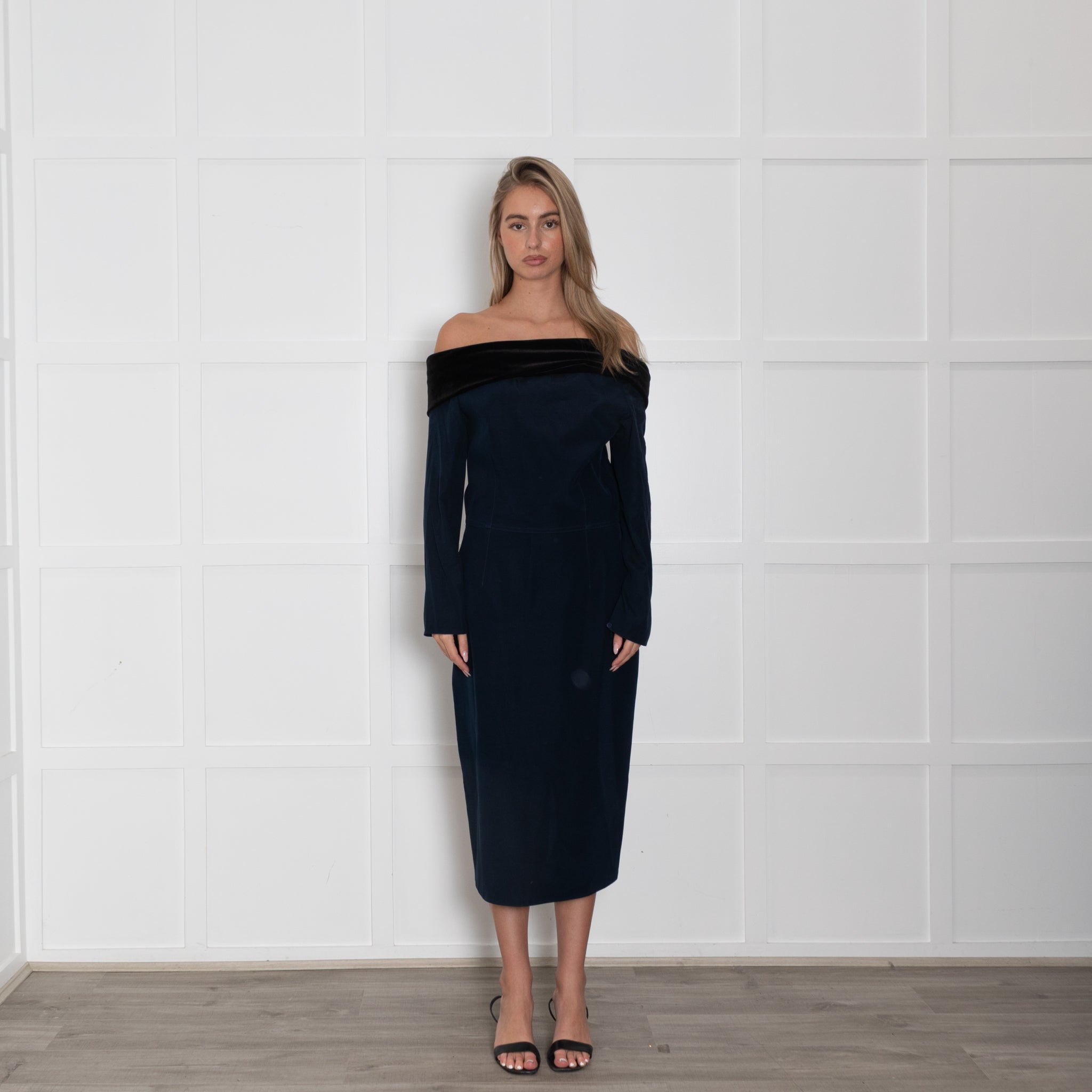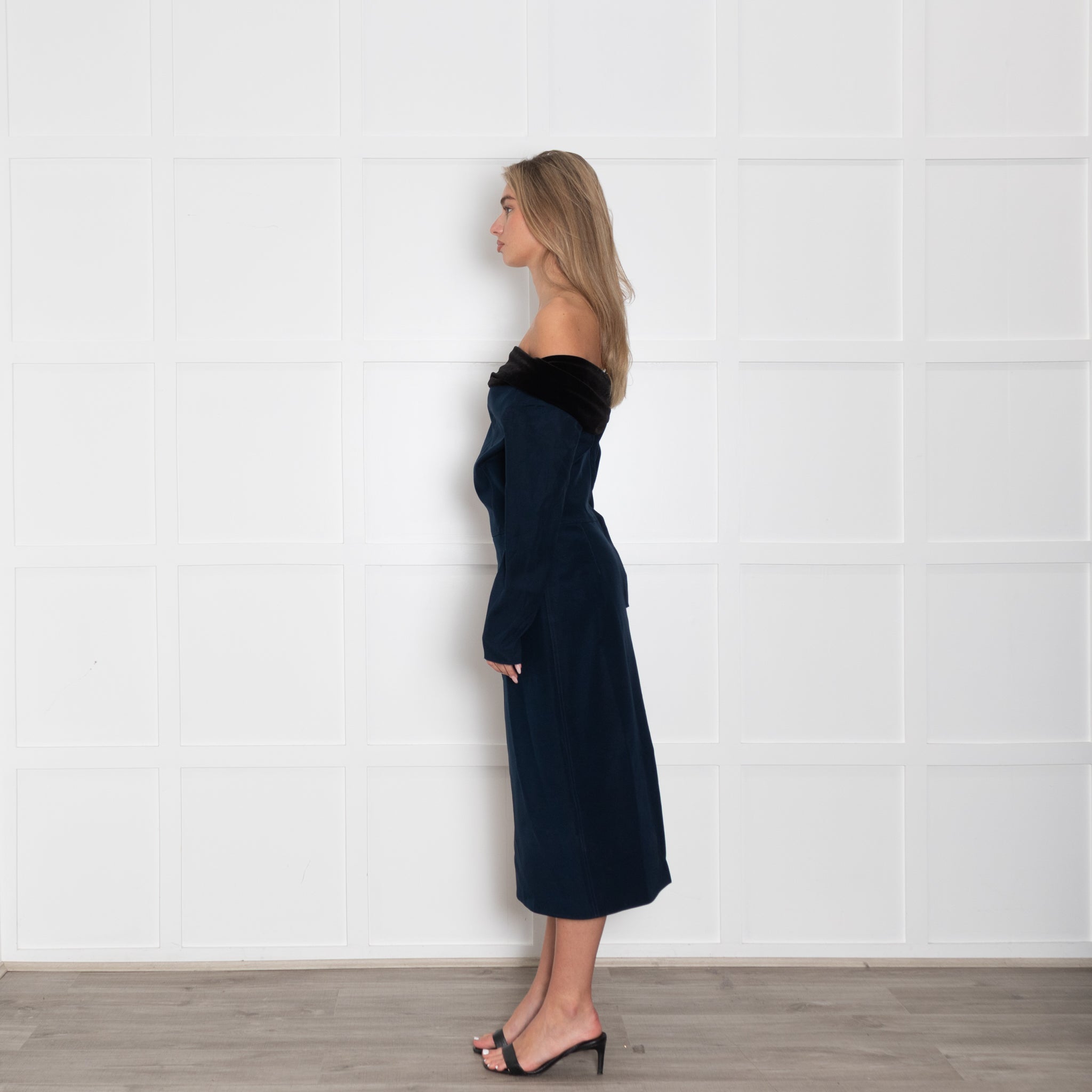 Emilio De La Morena navy blue long sleeve dress, featruing a stunning black velvet trim, with a back zip-up closure.