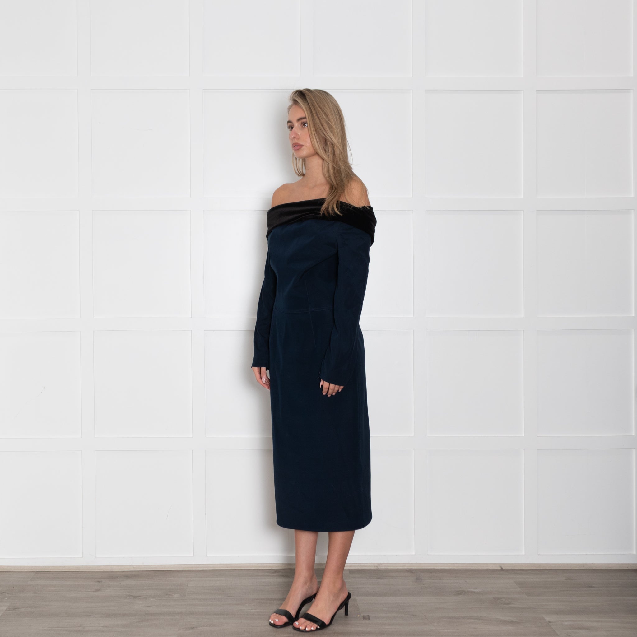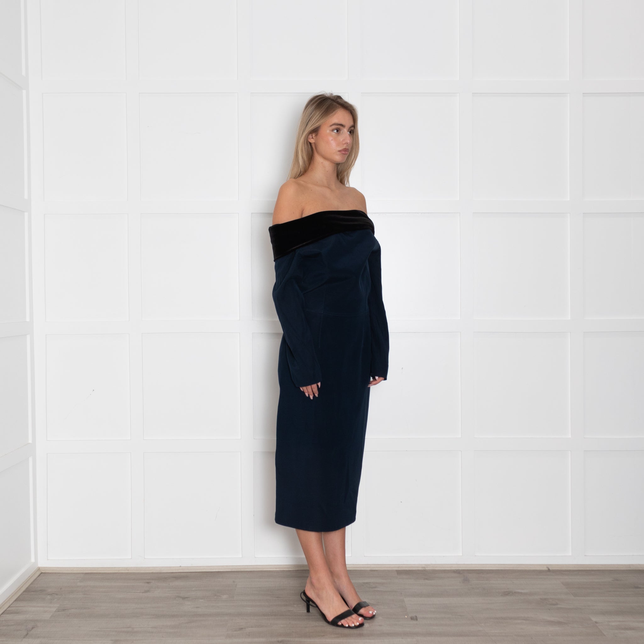 Emilio De La Morena Navy Blue Black Velvet Trim Sleeved Dress