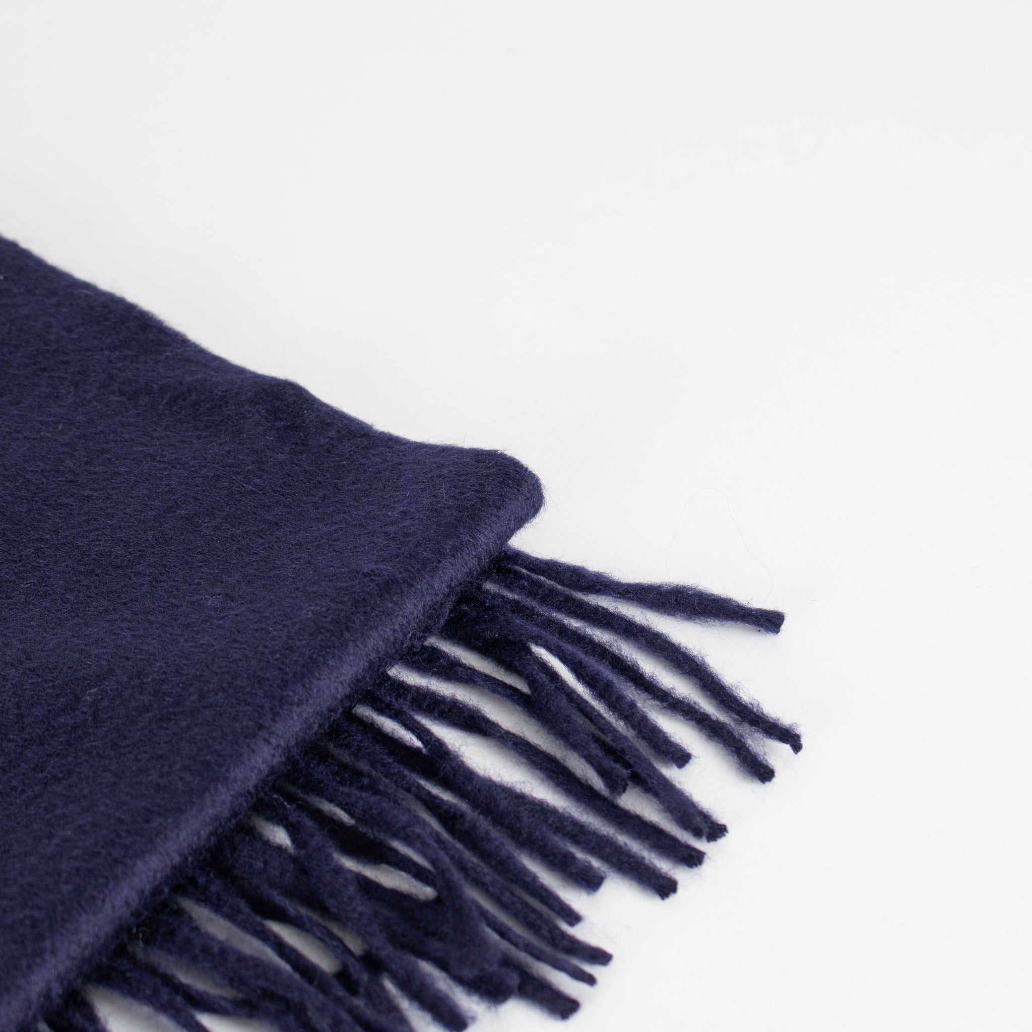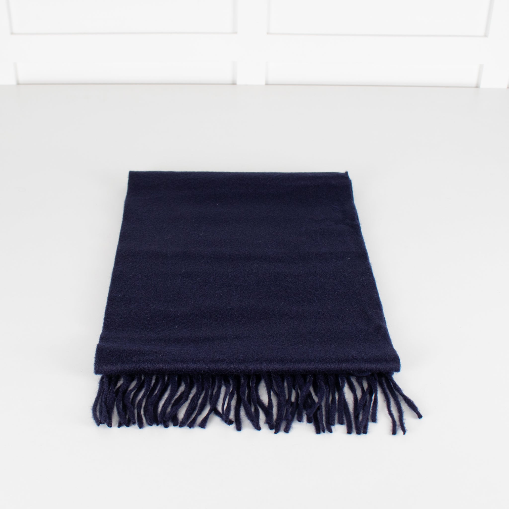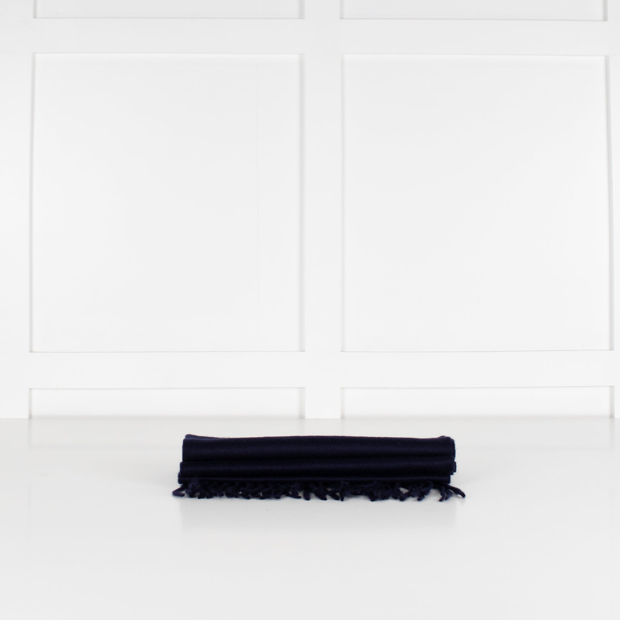 Fortnum and Mason navy scarf, crafted with a soft cashmere fabric, featuring deep navy fringed edges.