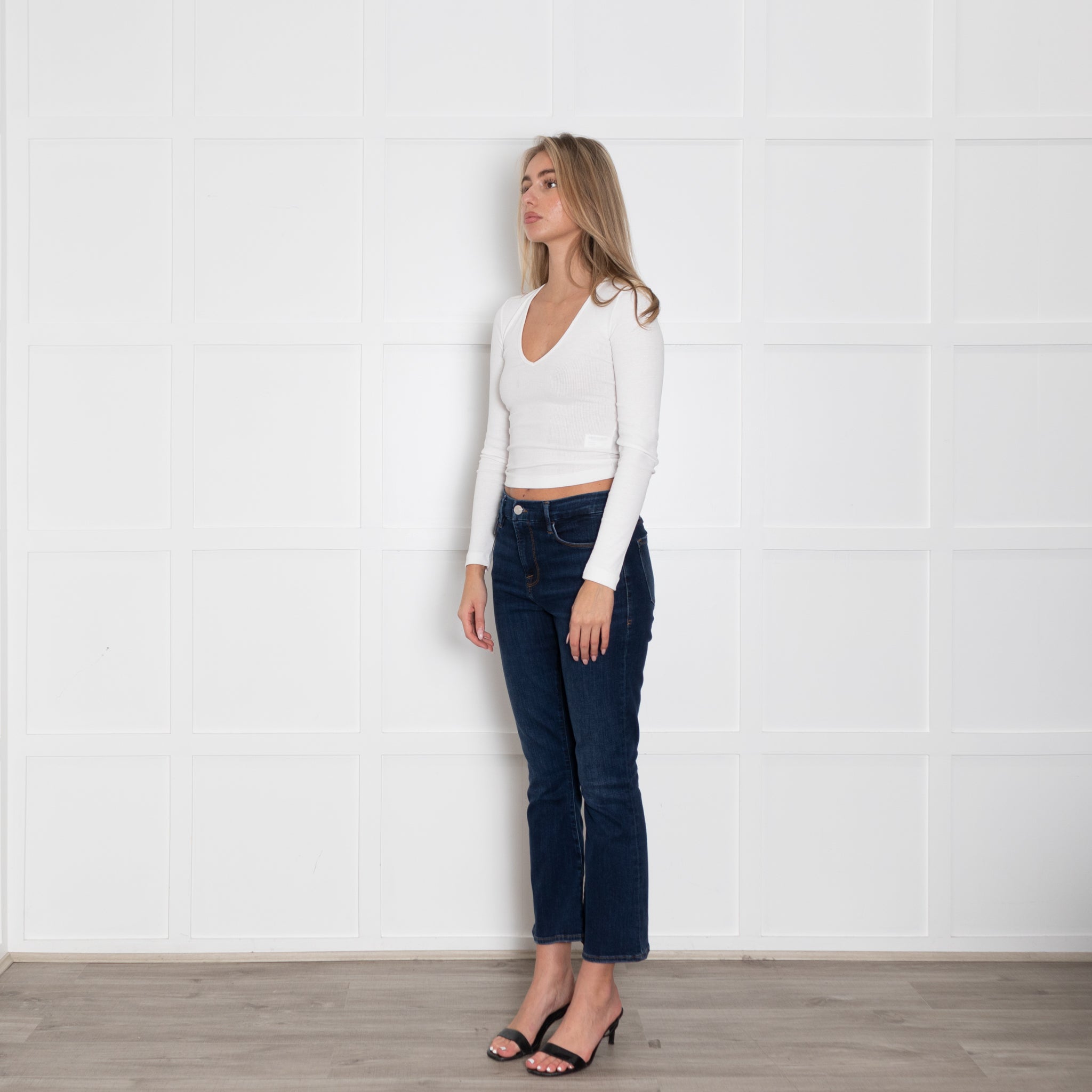 Frame dark blue denim 'Le Crop Mini Boot' jeans. A bootcut silhouette featuring a dark blue wash. RRP £235.00.