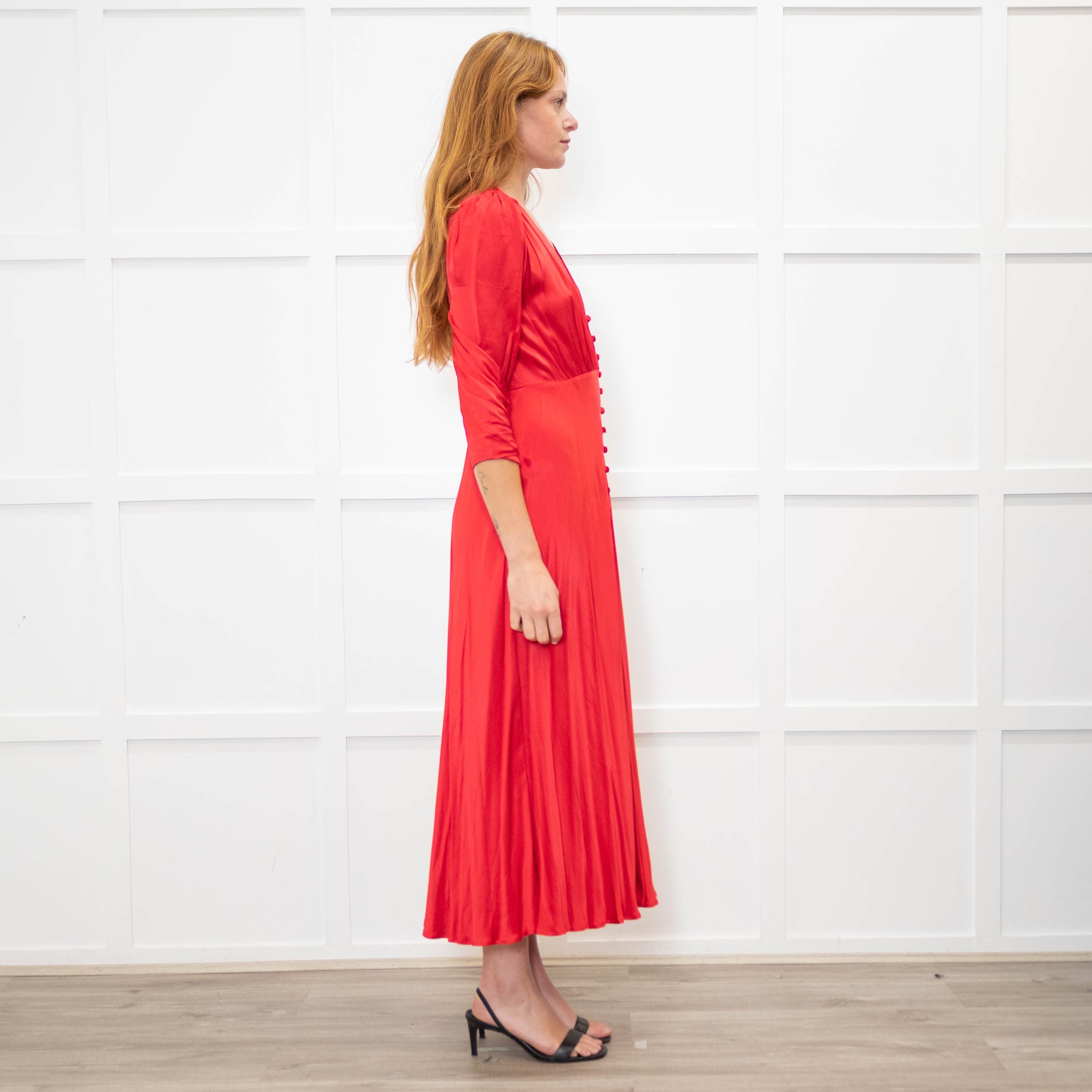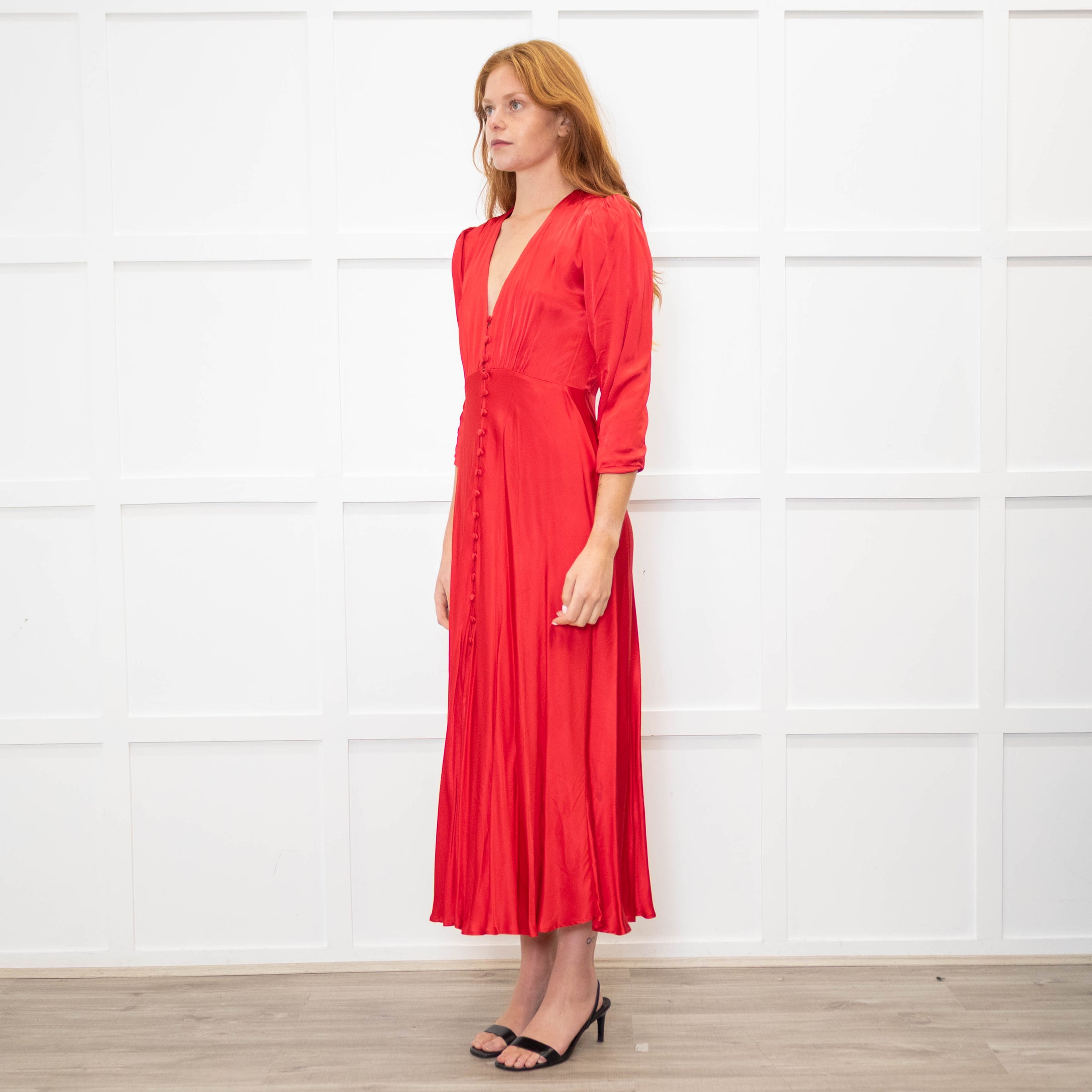 Ghost red satin button-up front tea dress with cropped sleeves, a V-shaped neckline, gathering into the shoulders, a bias cut skirt, and a front hem split.