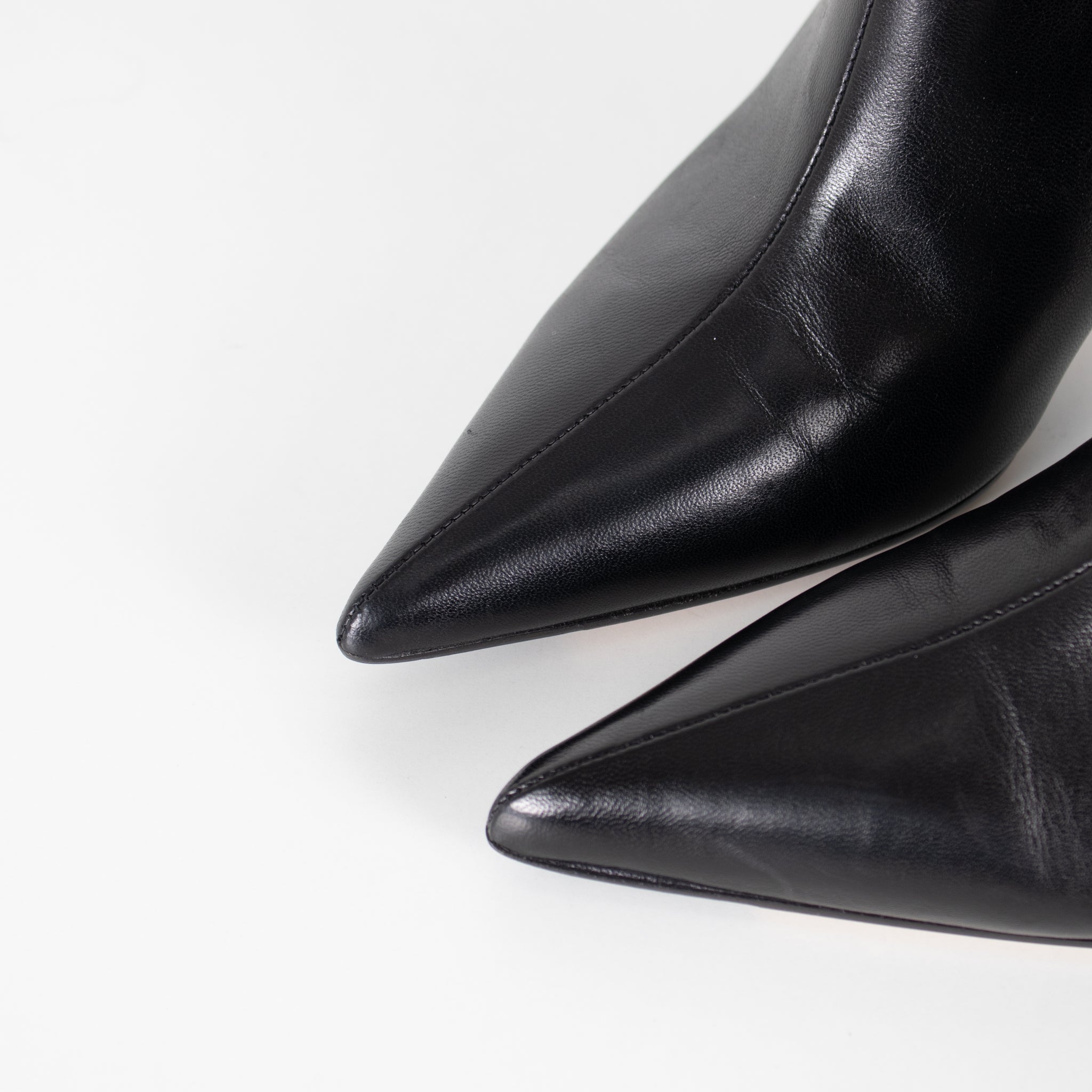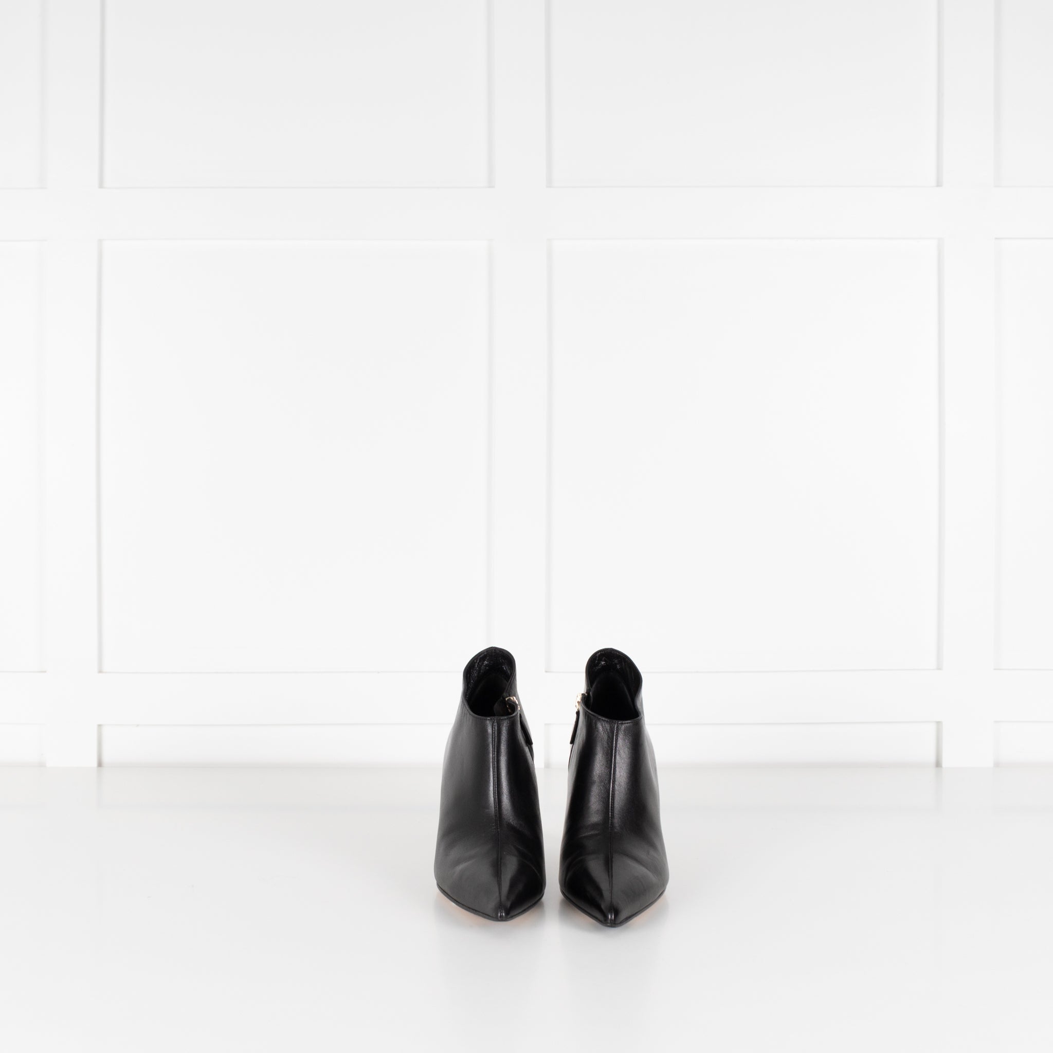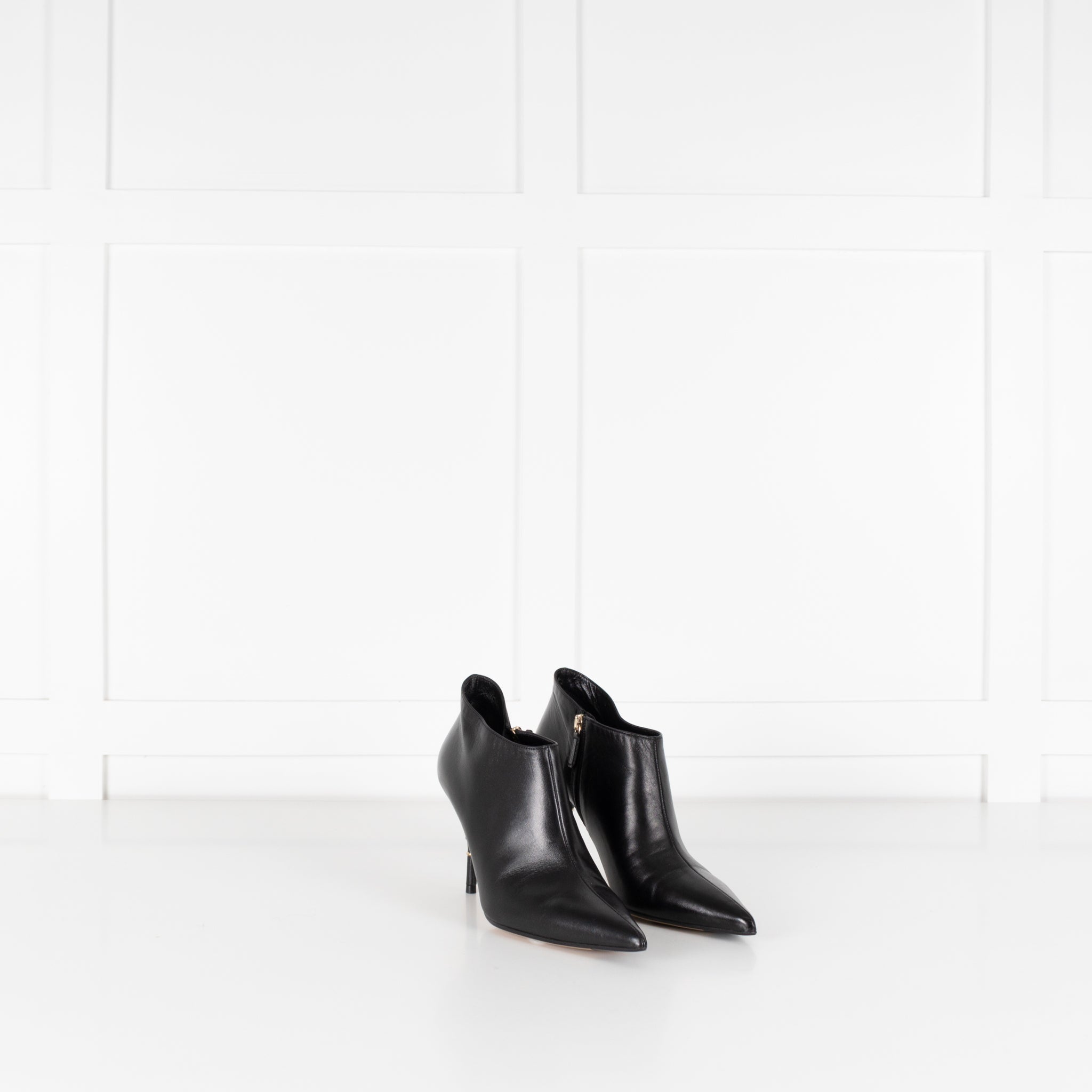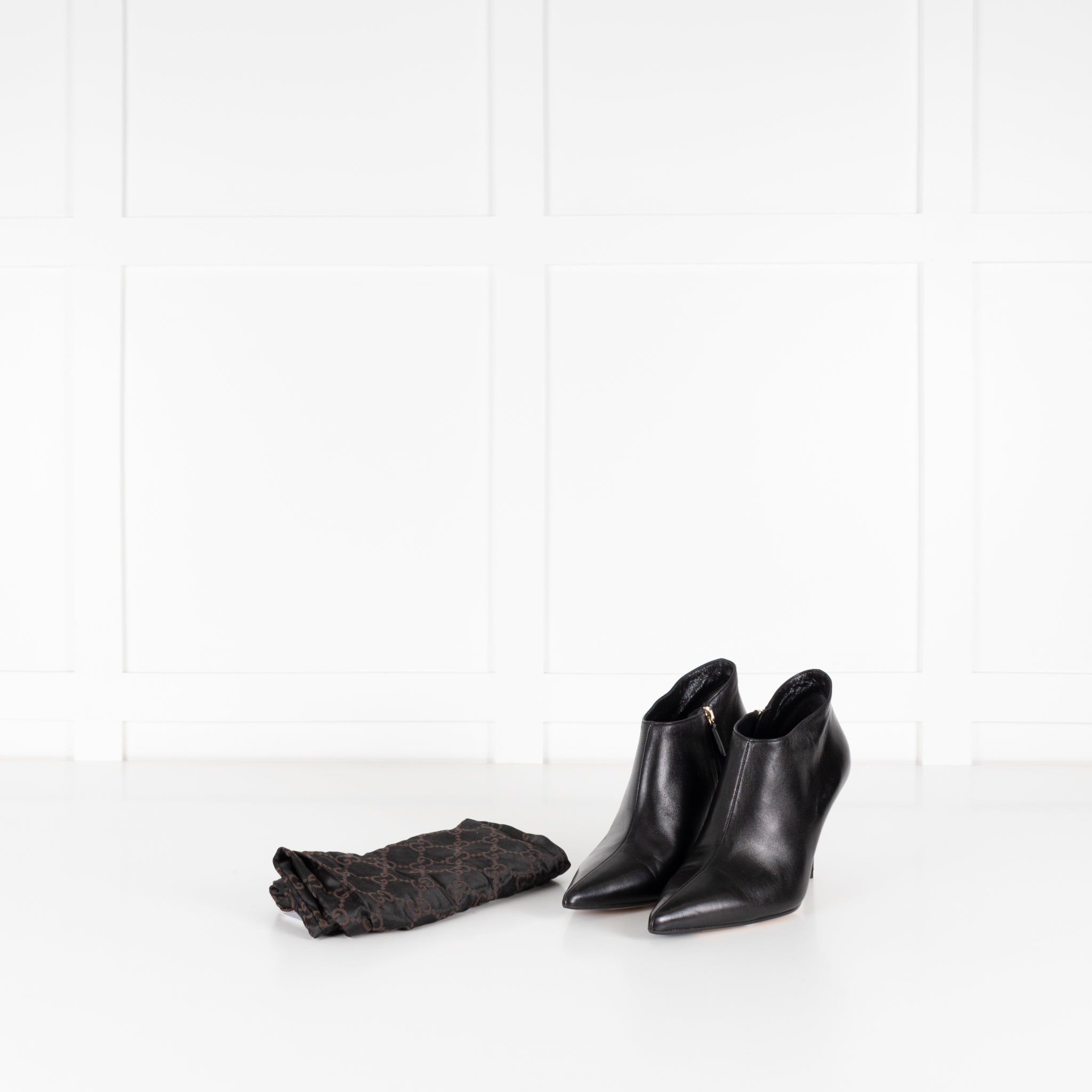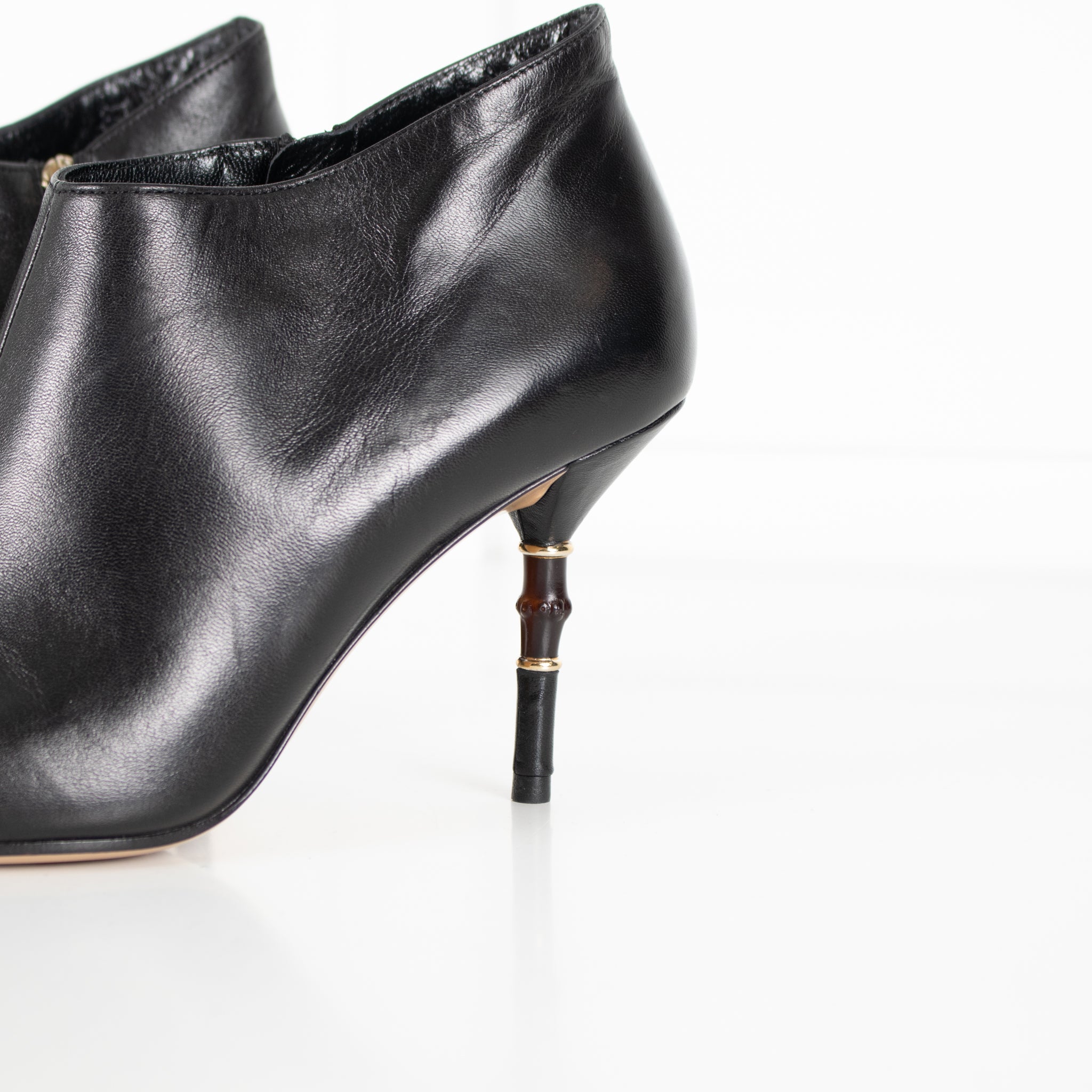 Gucci black ankle boots, crafted with a leather exterior fabric, a pointed toe design, with a stunning, unique bamboo heel, the side of the shoe features a zip-up closure.