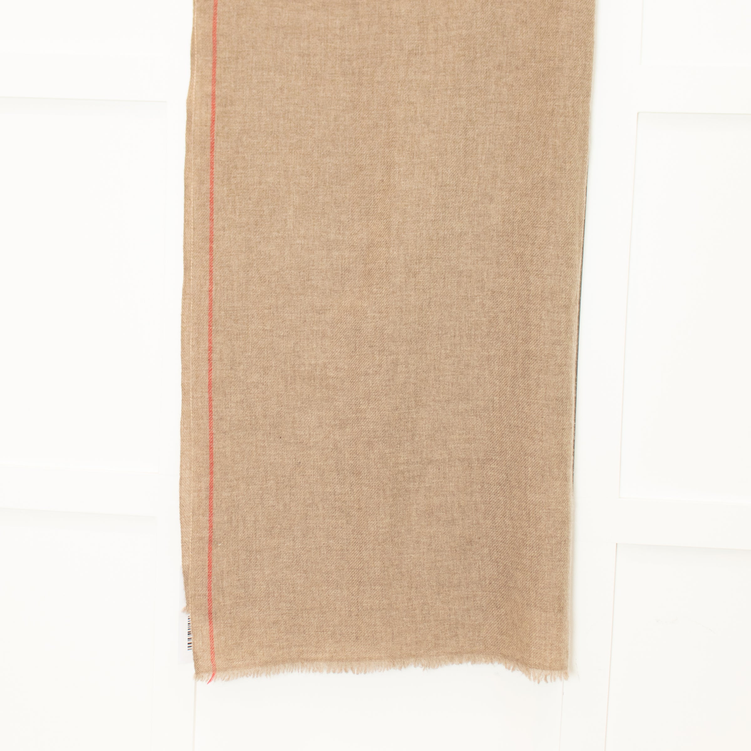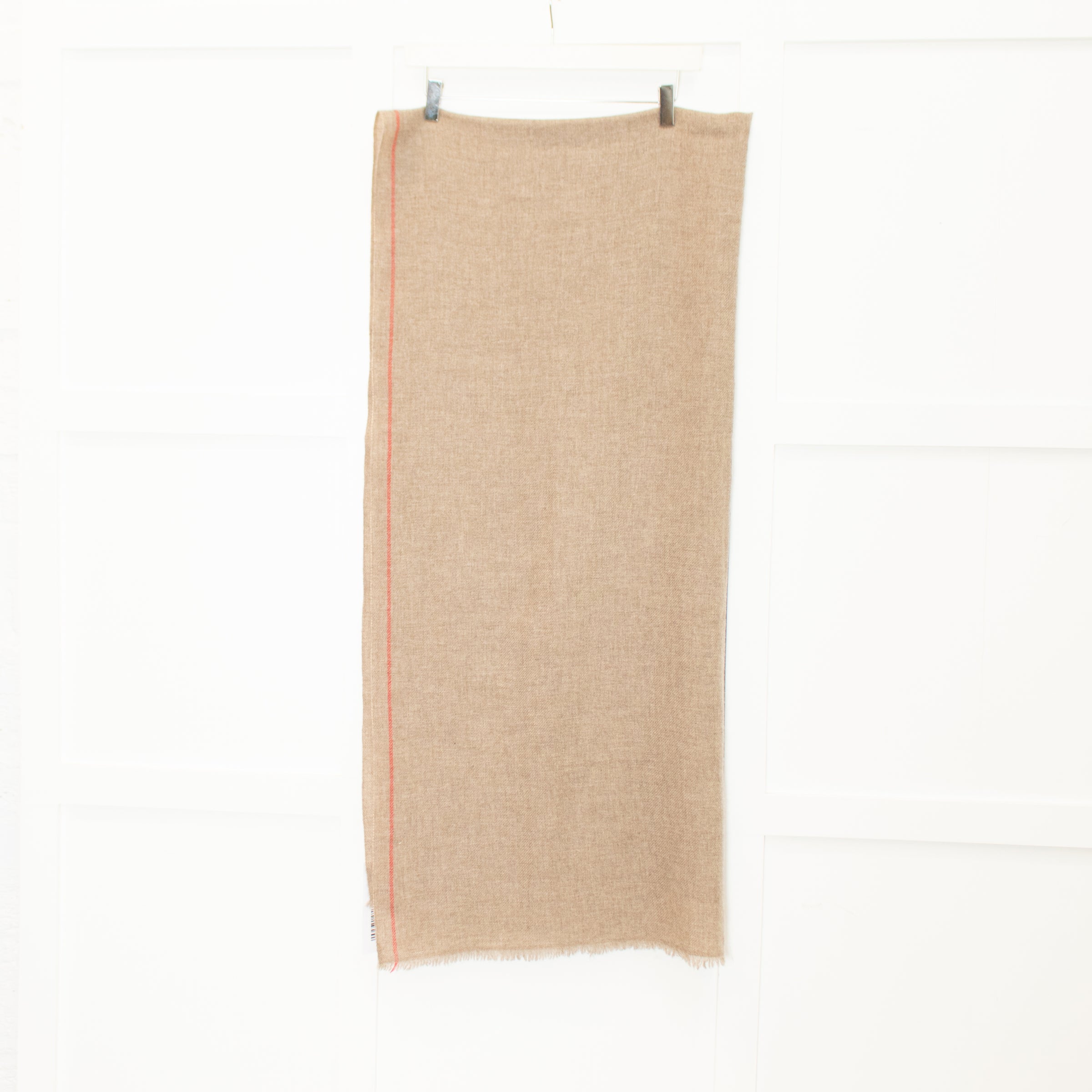 Isabel Marant camel brown fine cashmere woven scarf with red trim detailing and fringed/ unfinished ends.