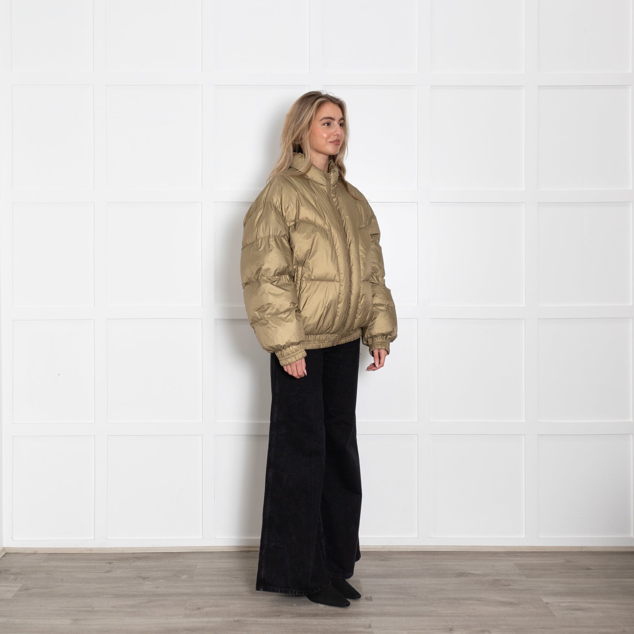 Isabel Marant Etoile long-sleeve green puffer jacket, featuring a stunning warm embroidered design, with a front zip-up closure, and two front zip pockets.