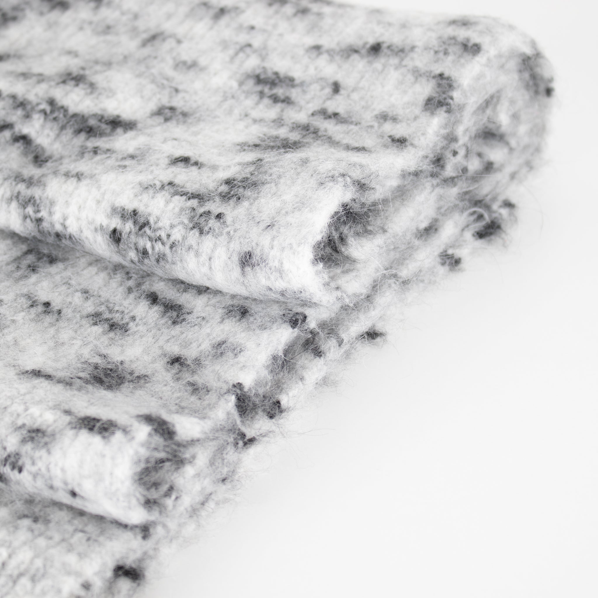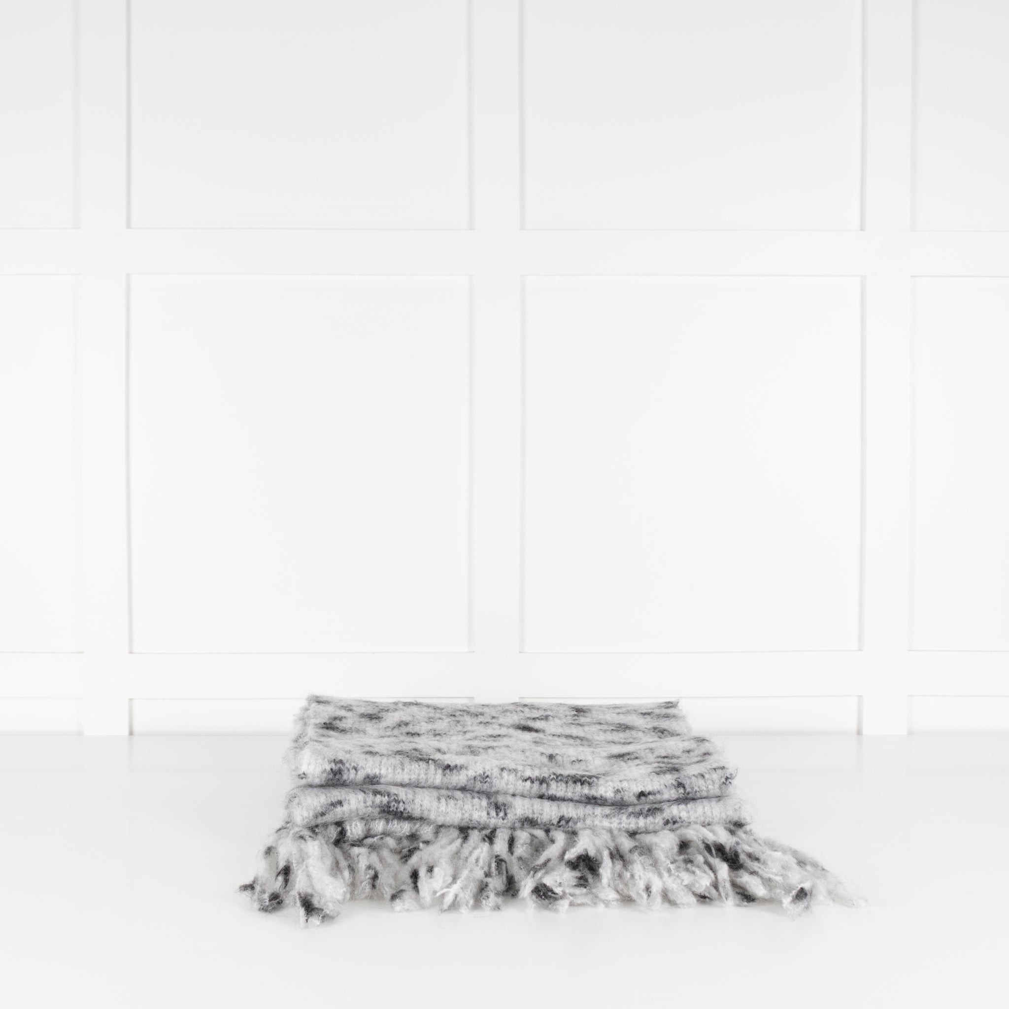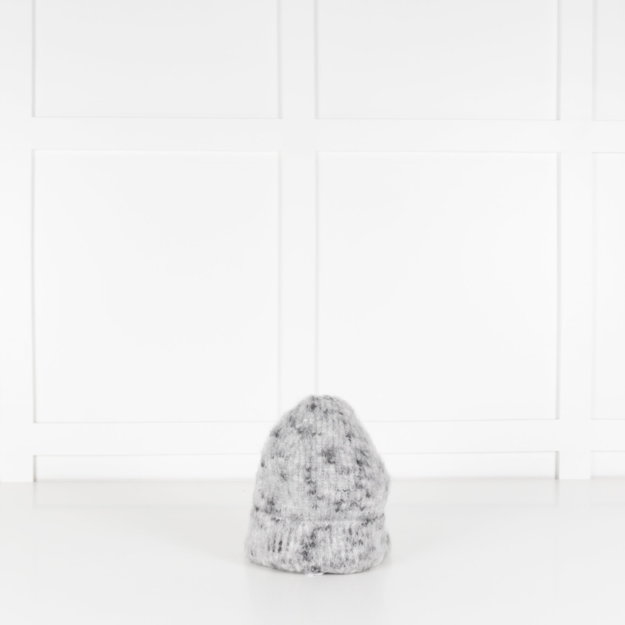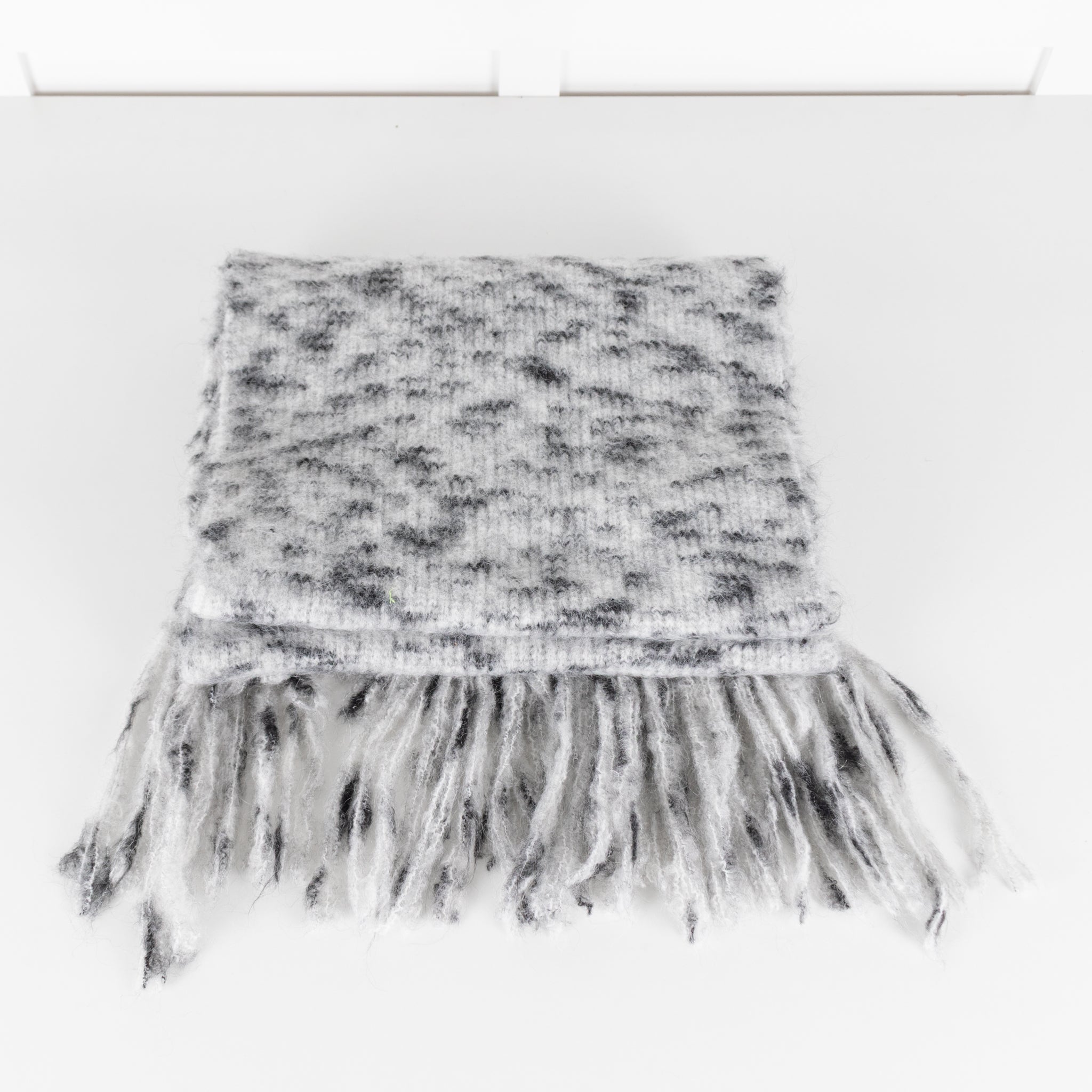 Isabel Marant grey chunky knit hat and scarf, both featruing a black fleck detailing design on the exterior, crafted with a chunky, thick fabric. The scarf also features deep grey fringed edges.