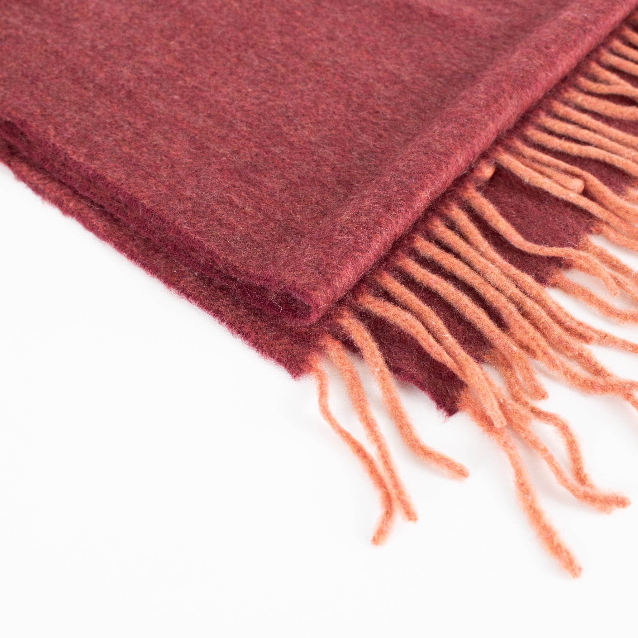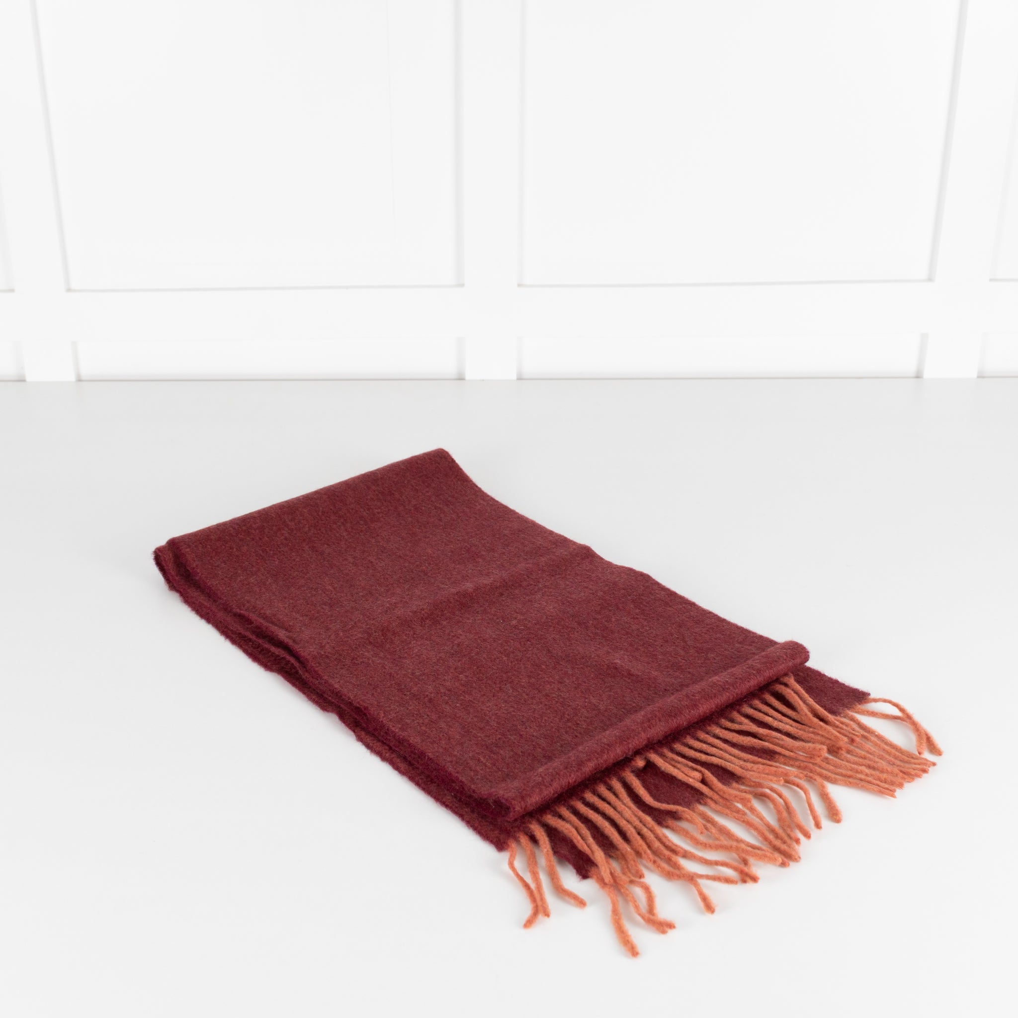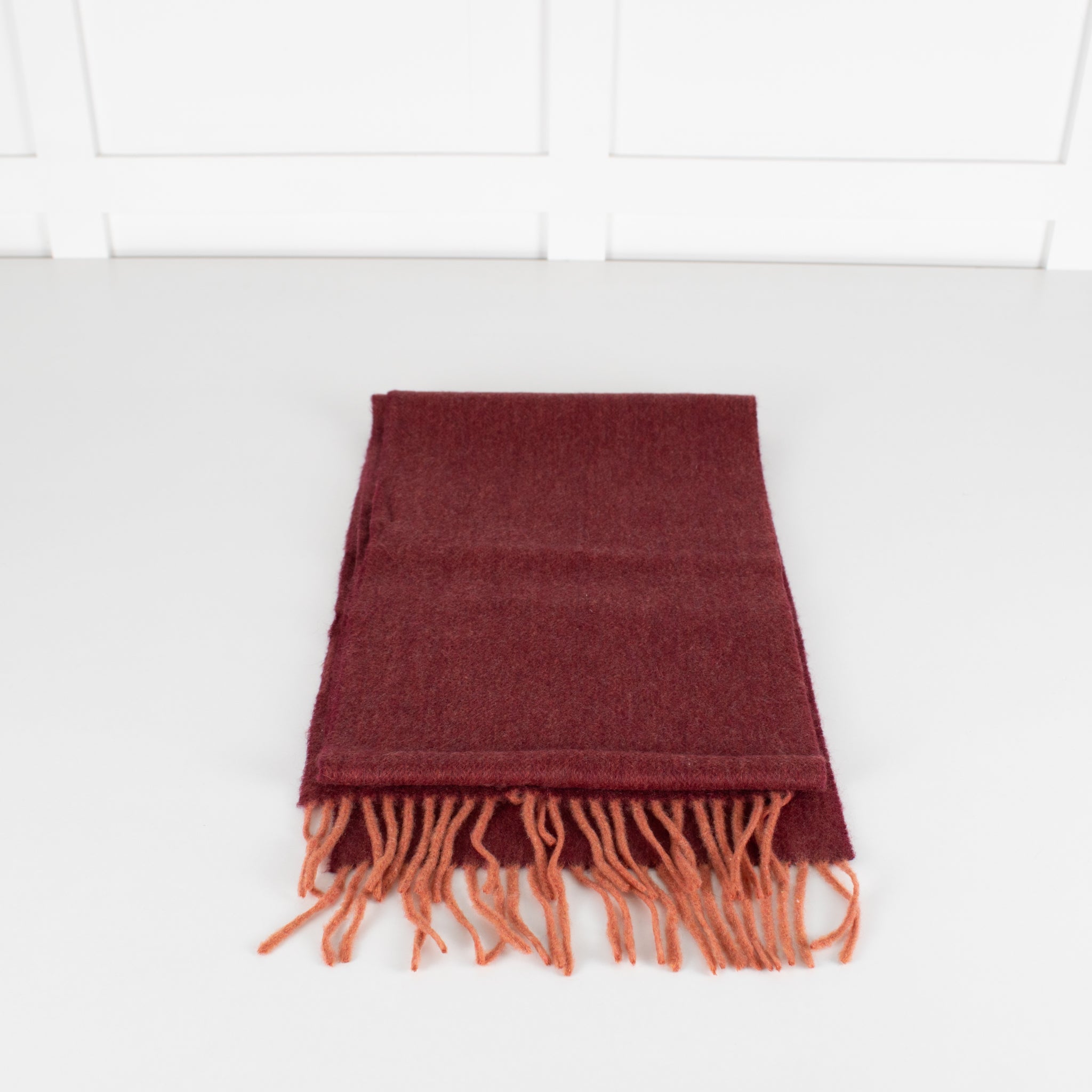 Johnstons of Elgin red scarf, crafted with a soft cashmere fabric, featuring deep orange fringed edges.