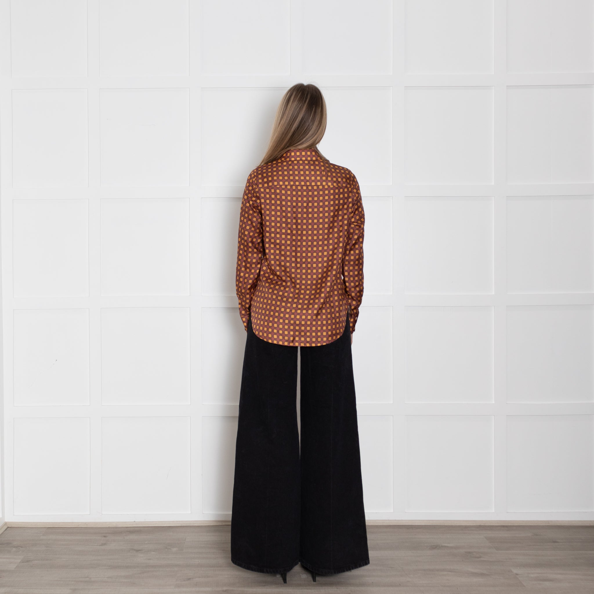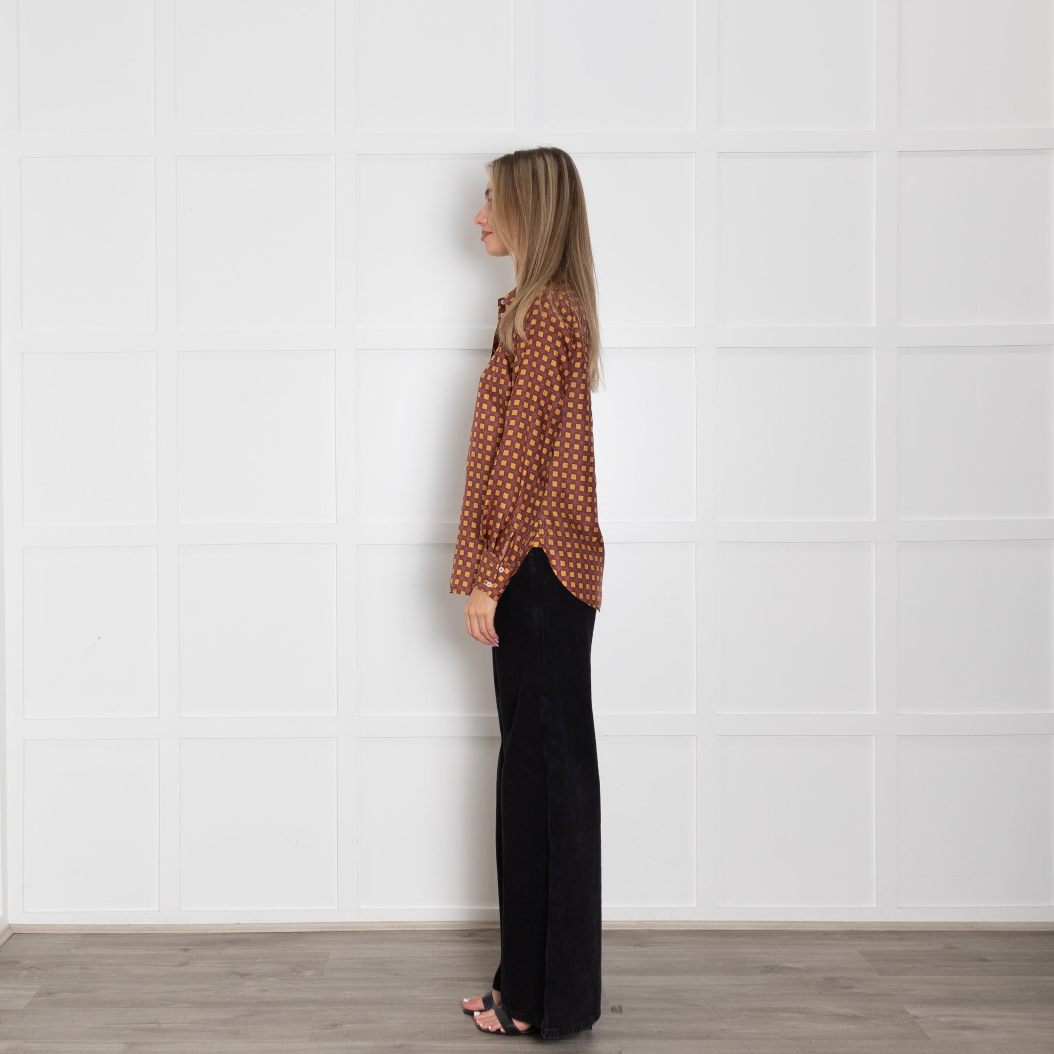 Lisou burgundy and yellow geometric patterned 100% silk blouse with long sleeves and button closure.