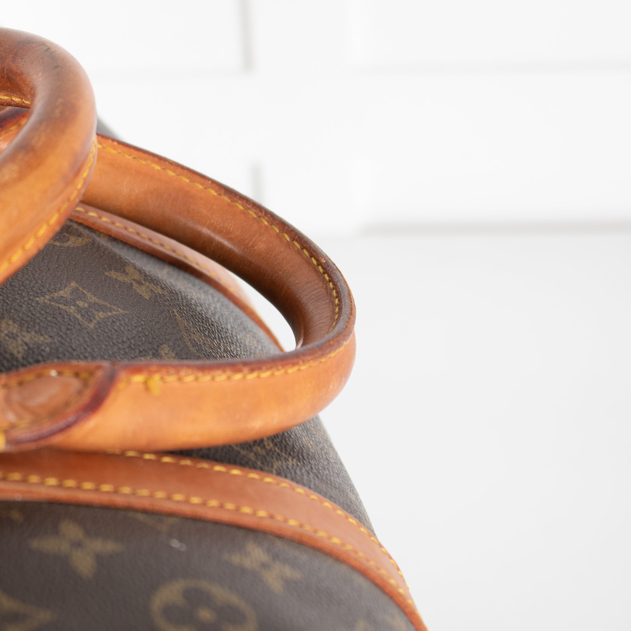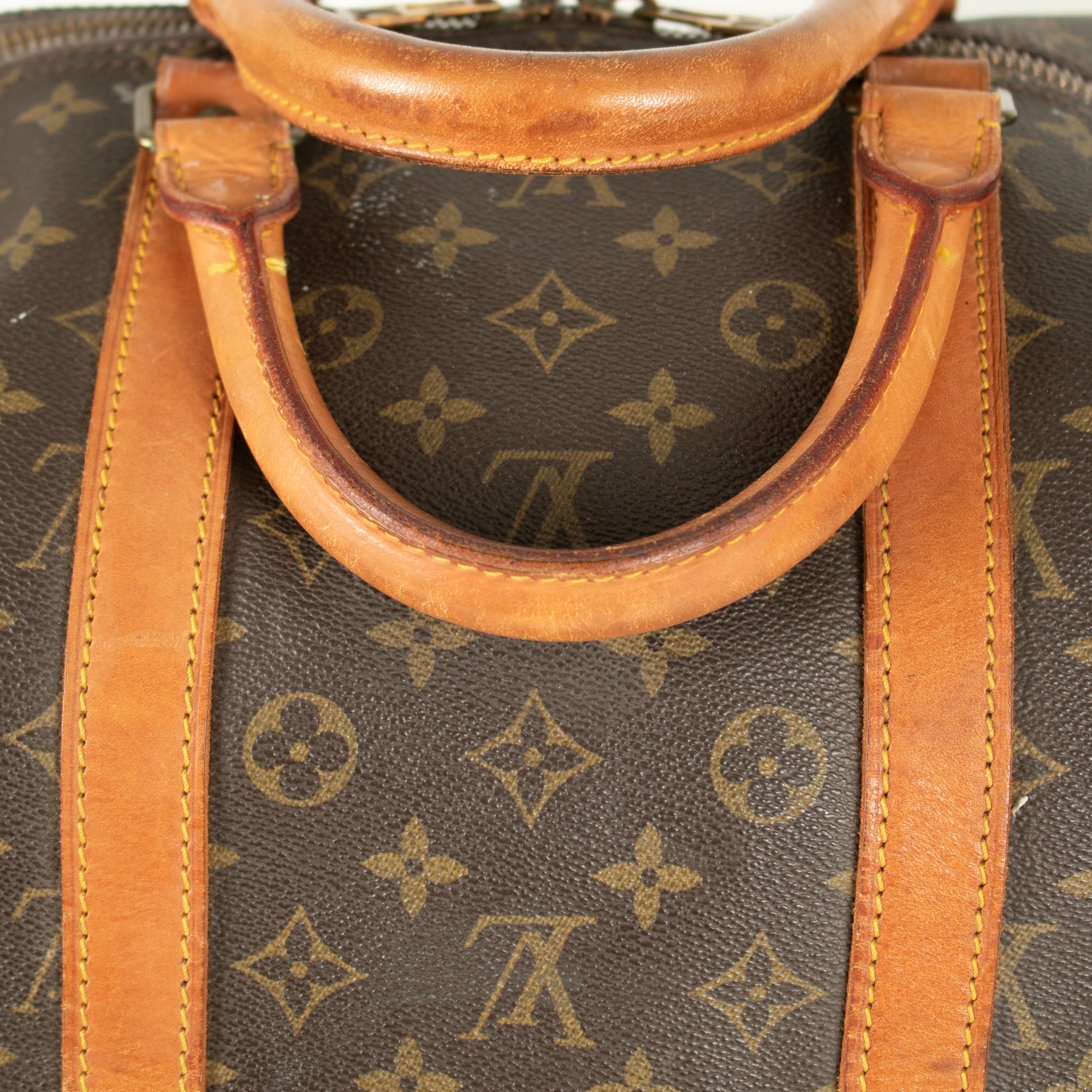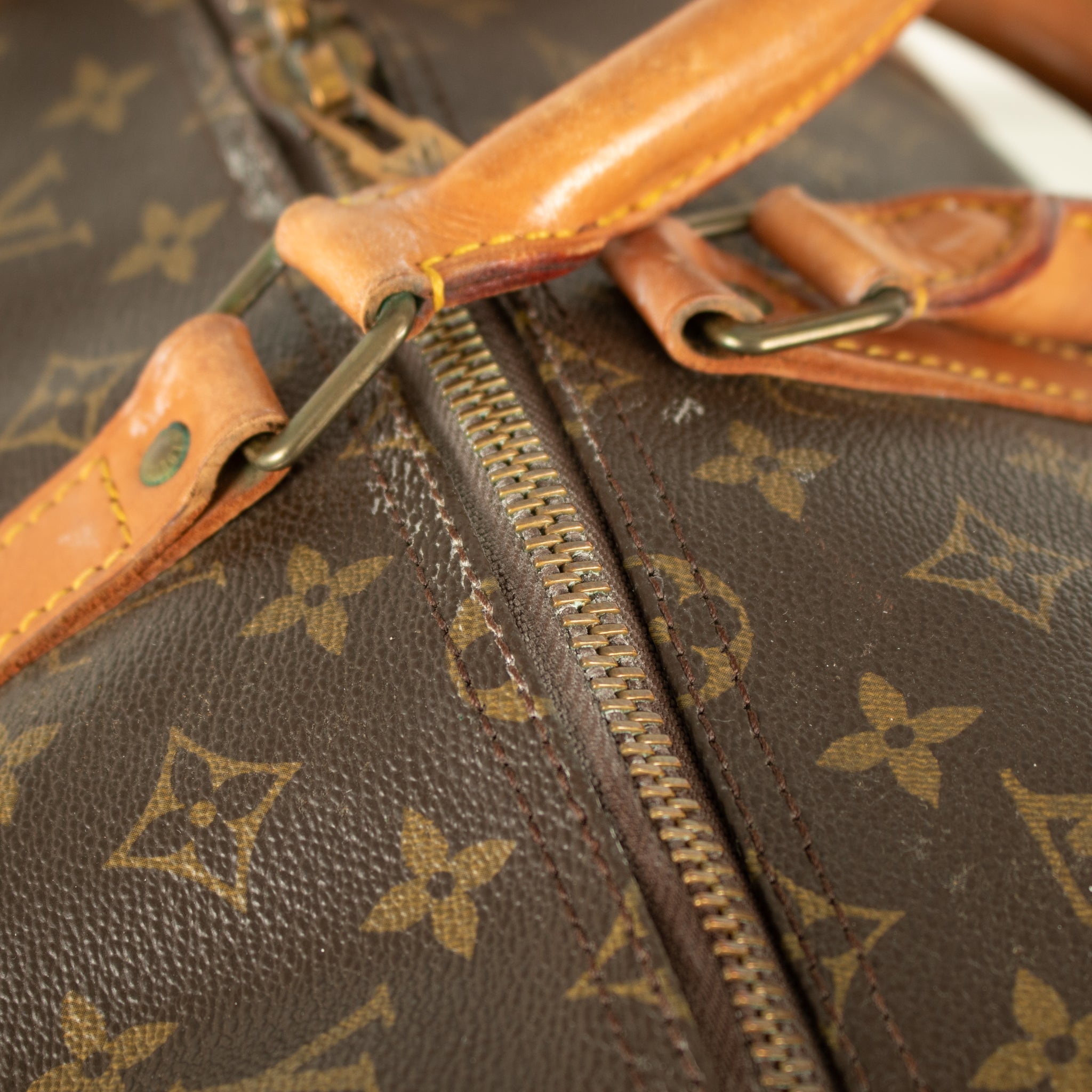 Louis Vuitton Monogram Keepall 55 brown bag produced in February 1986 with gold hardware, leather handles and a main zip compartment. There are signs of wear on this vintage piece - the end pull tabs are worn, the handles are marked and there are some marks on the canvas as pictured.