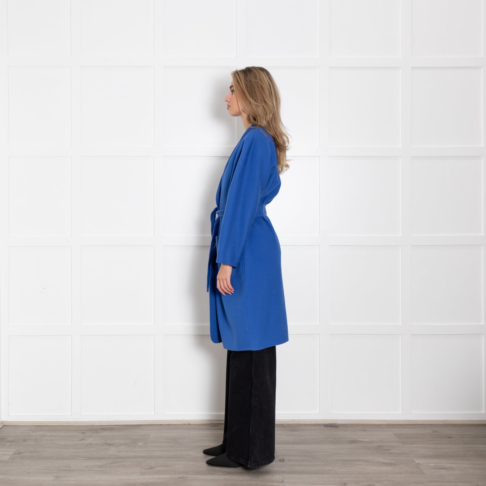 Max Mara blue long-sleeve coat, crafted with a stunning wool blend coat, featuring a belt, two spacious pockets, and a two-button up front closure.