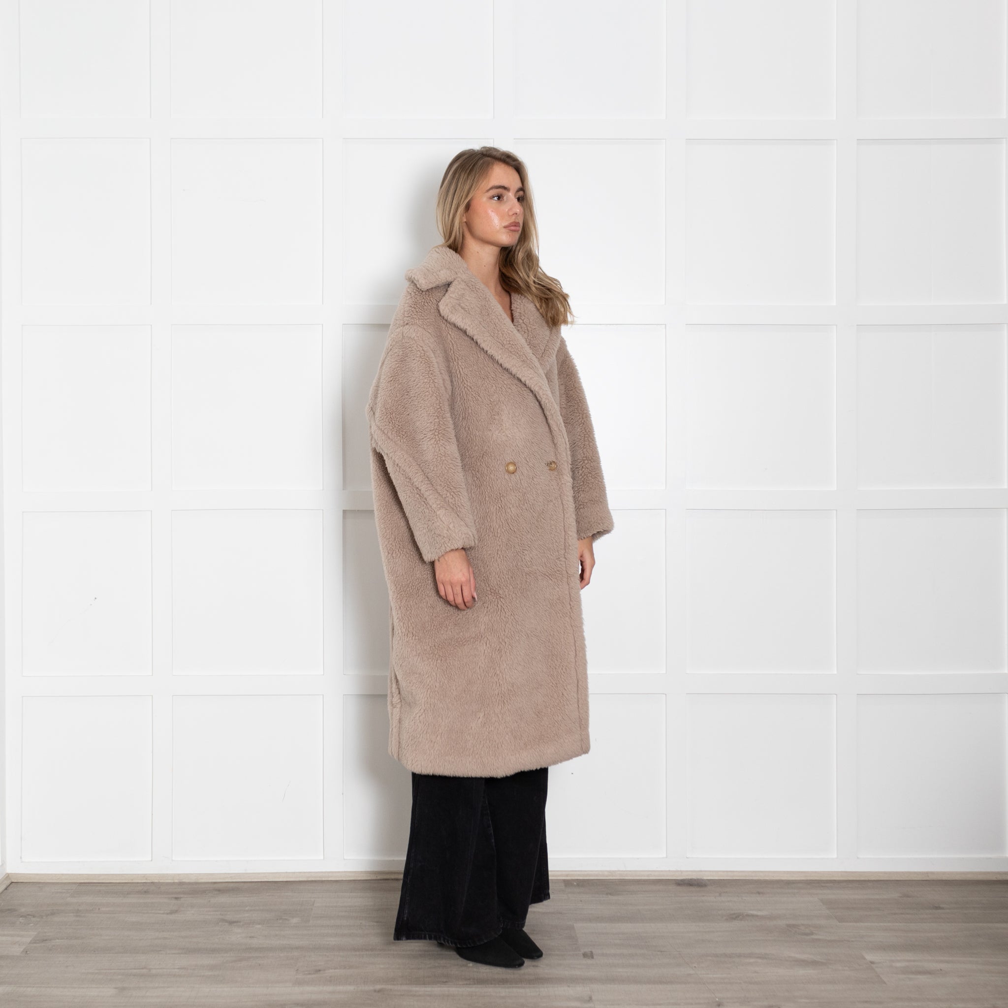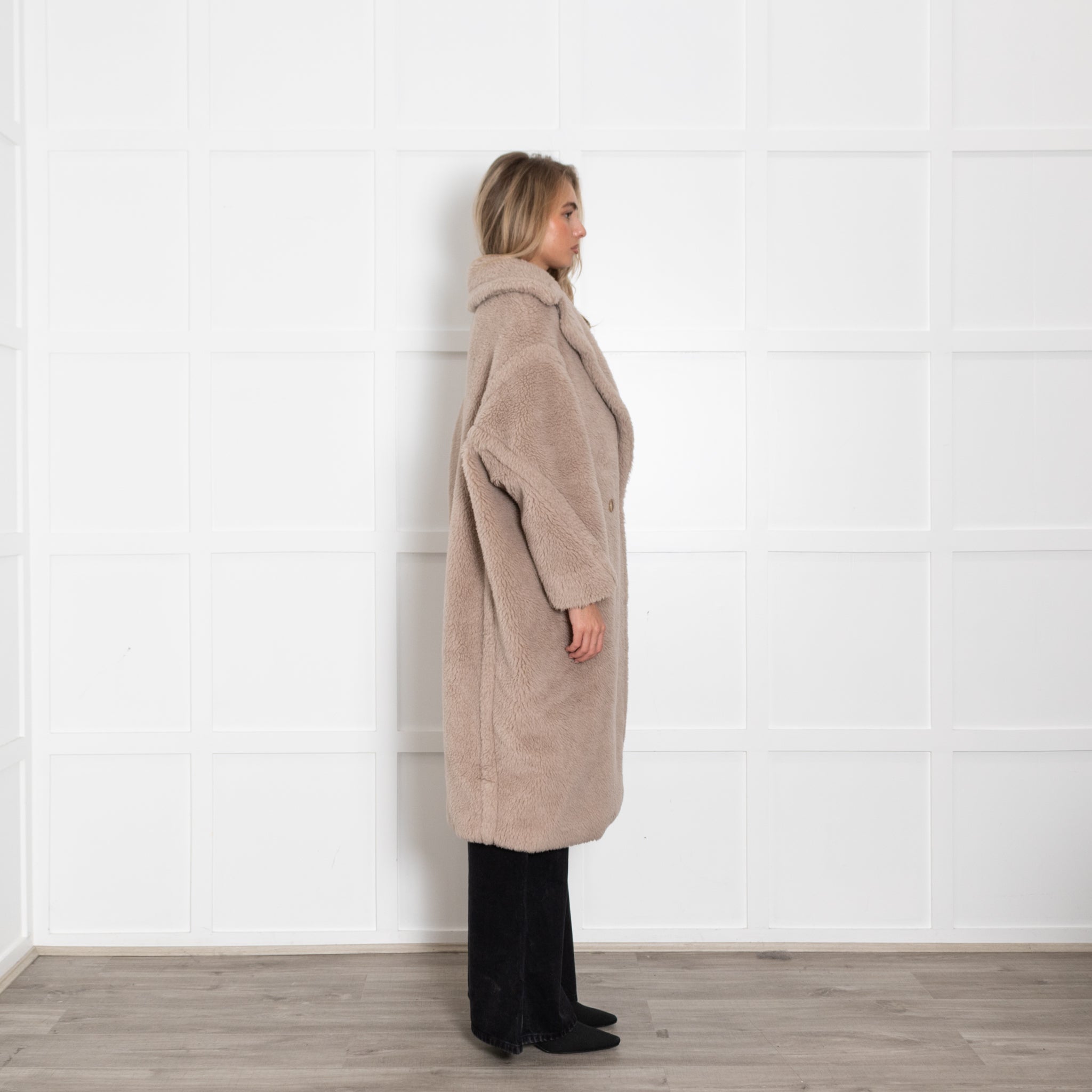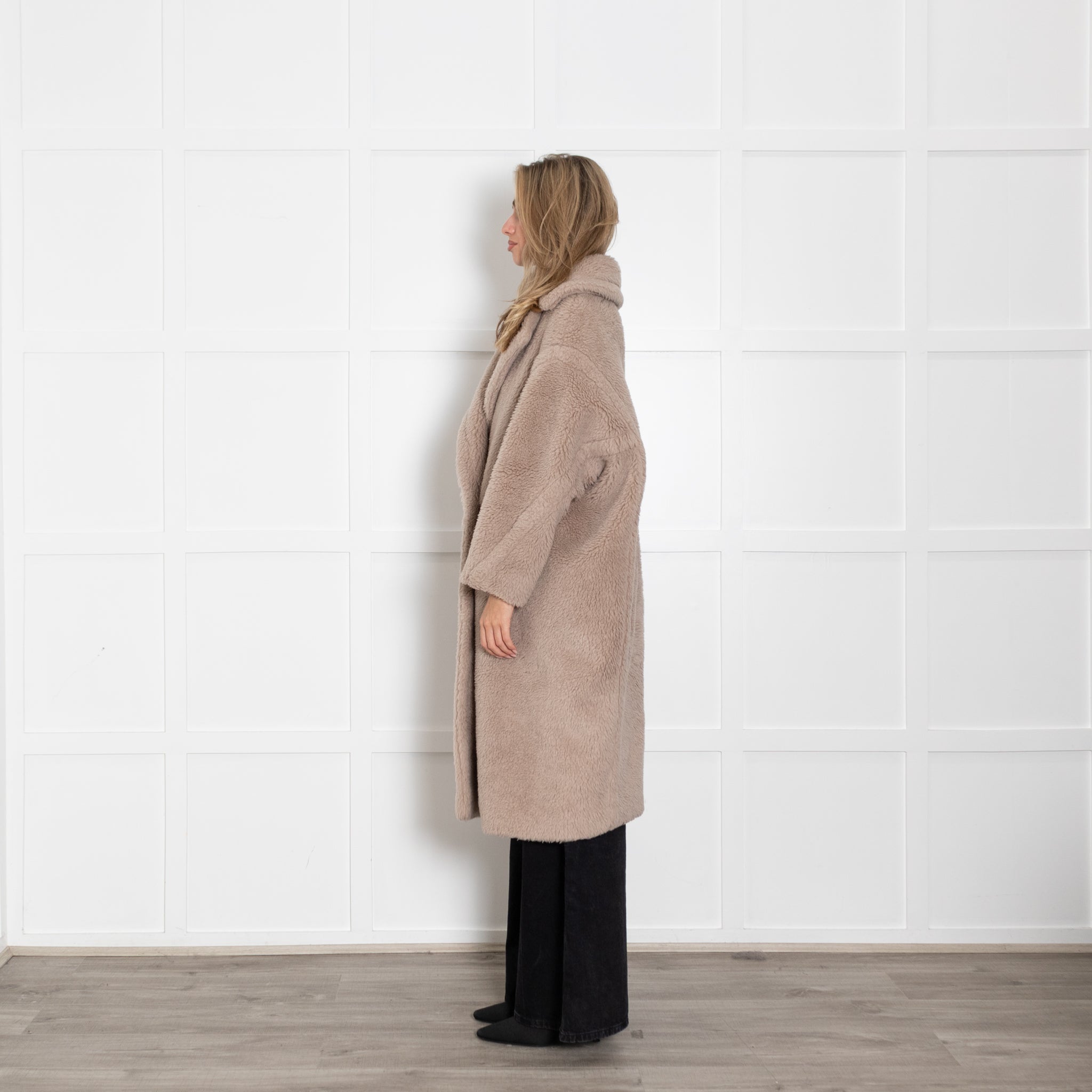 Max Mara light beige, long sleeve, teddy coat crafted with an alpaca fur wool blend coat, with a button-up front closure.