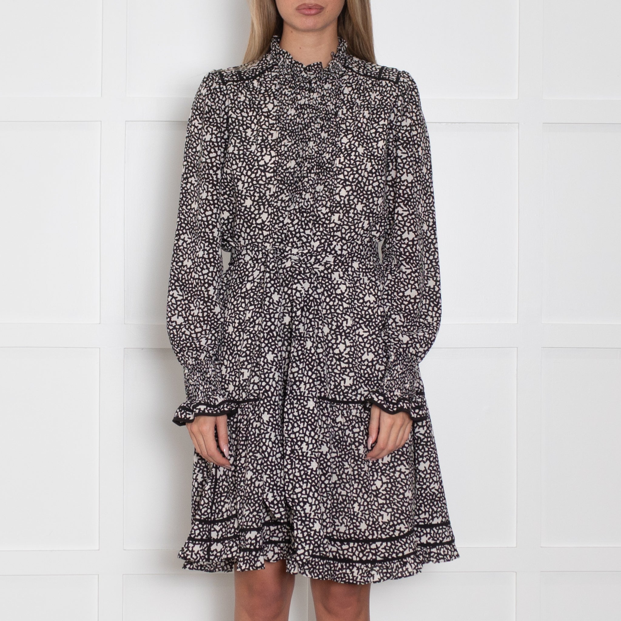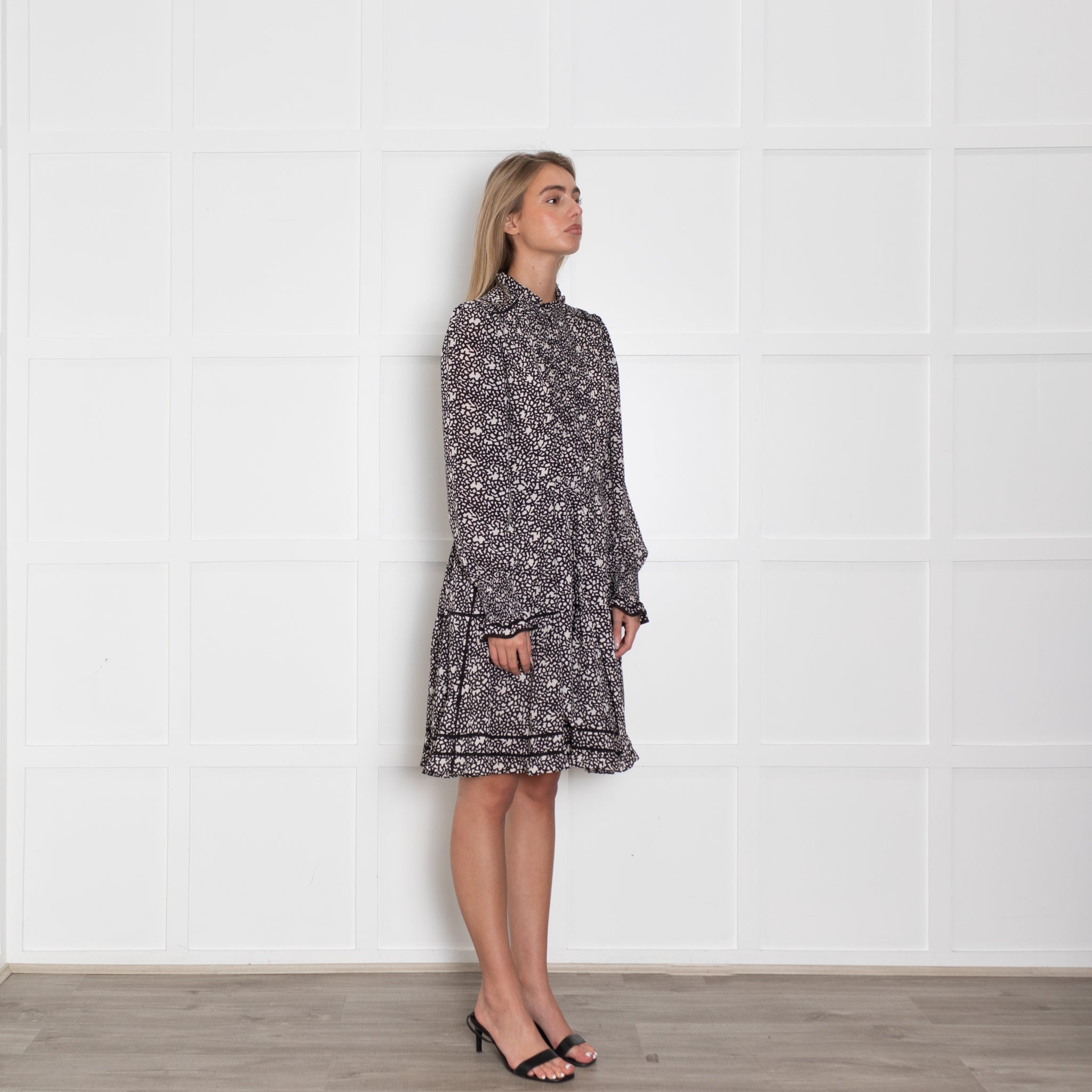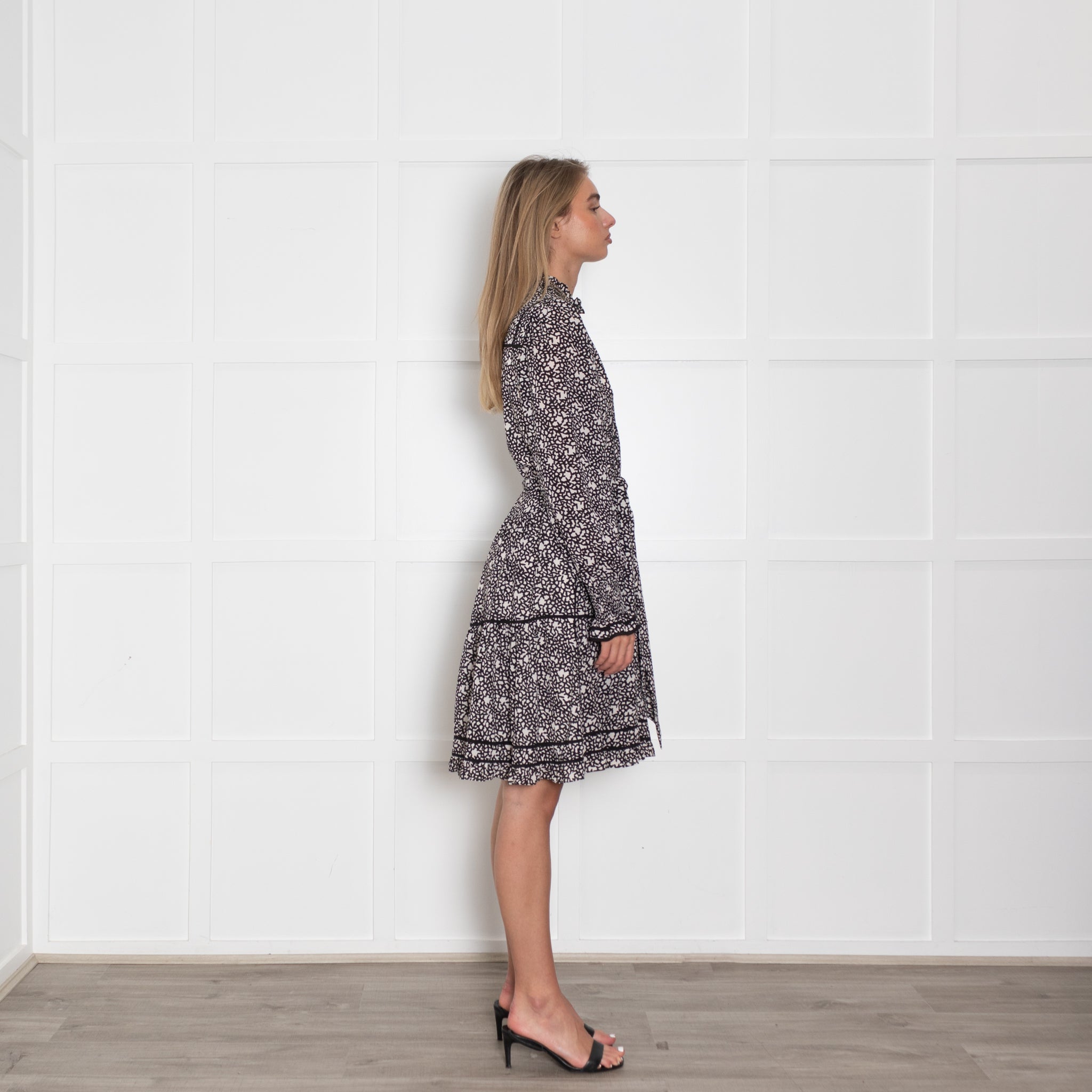 Me + Em black long-sleeve dress, featuring a white patterned exterior design, a belted waist, with a frill trim skirt design, and a high neckline.