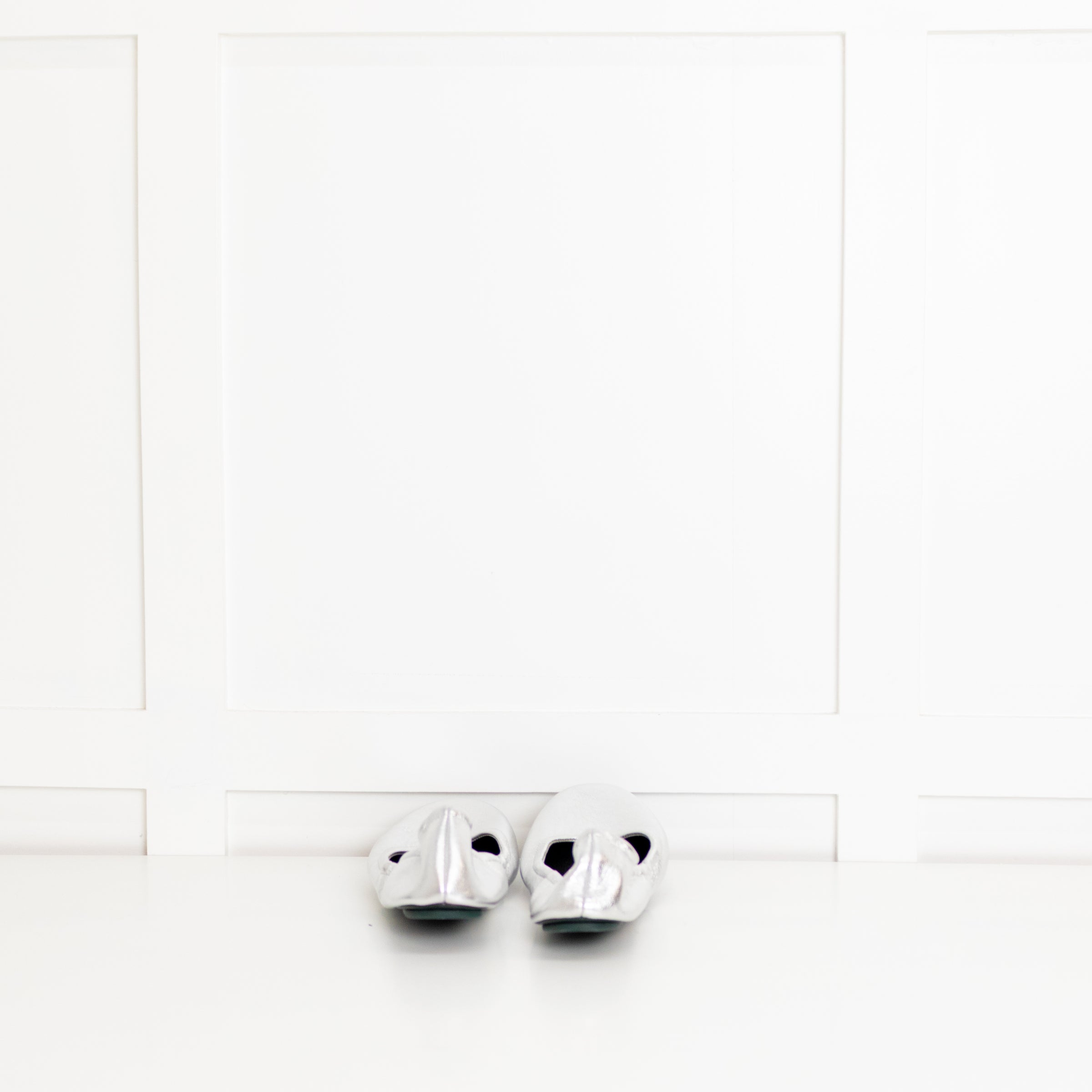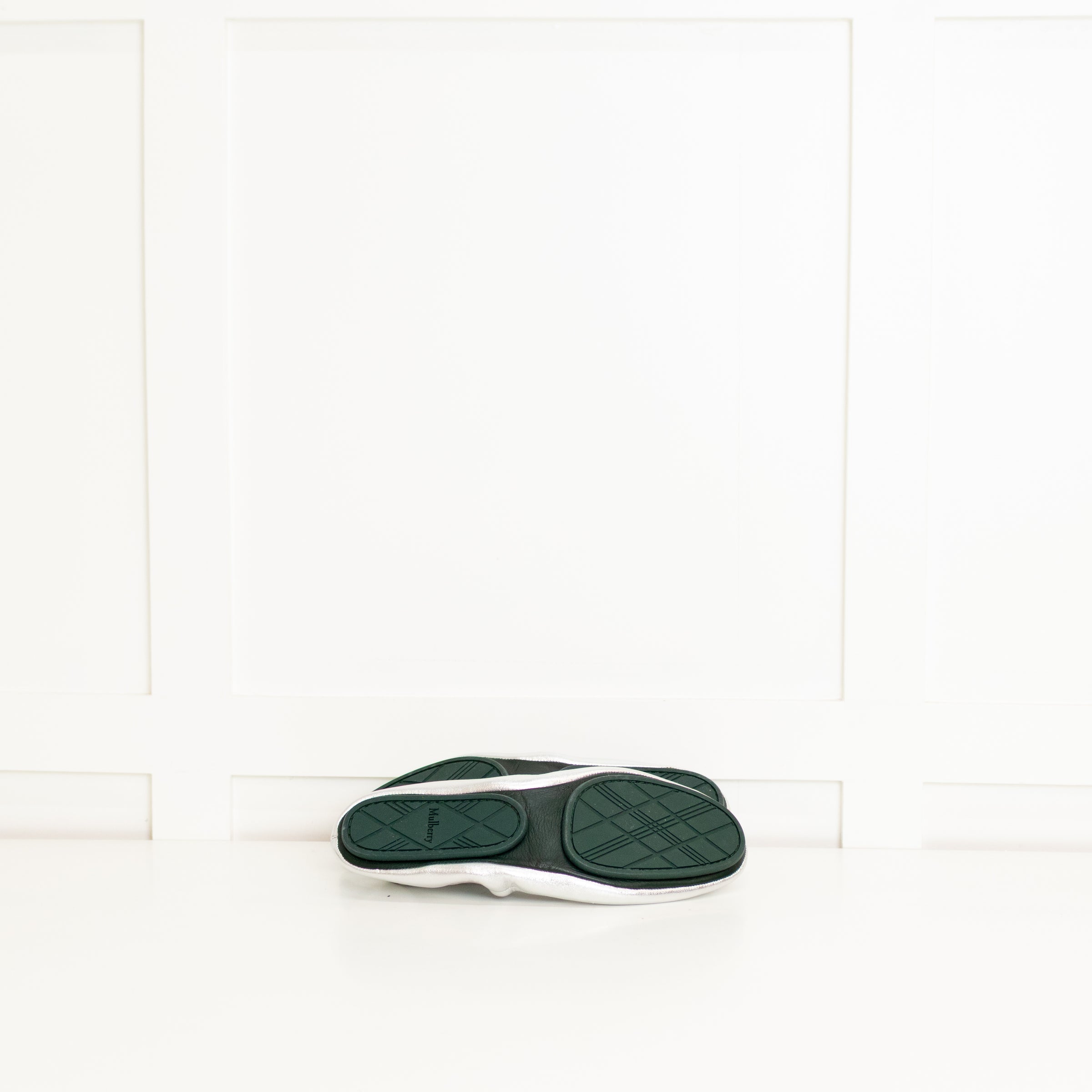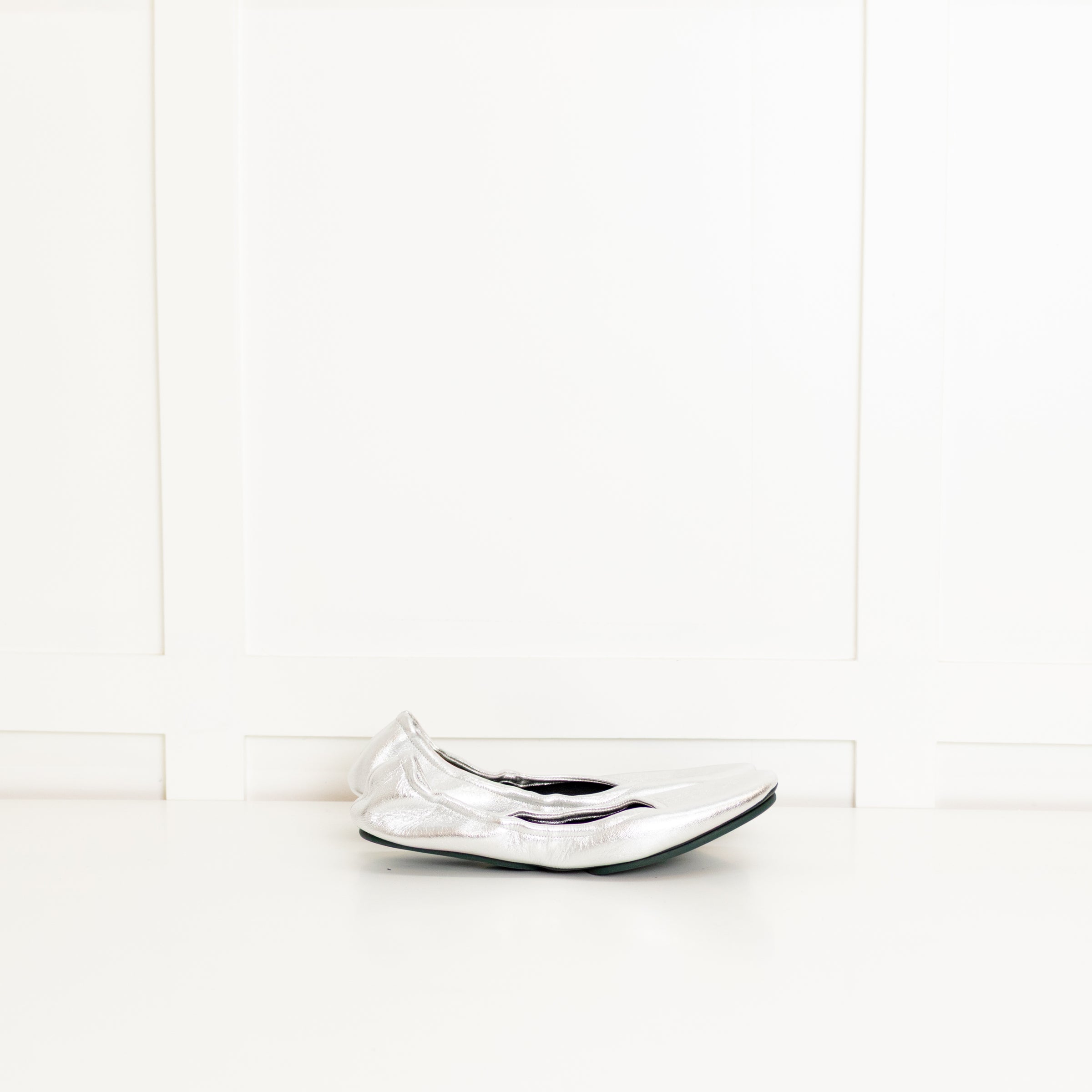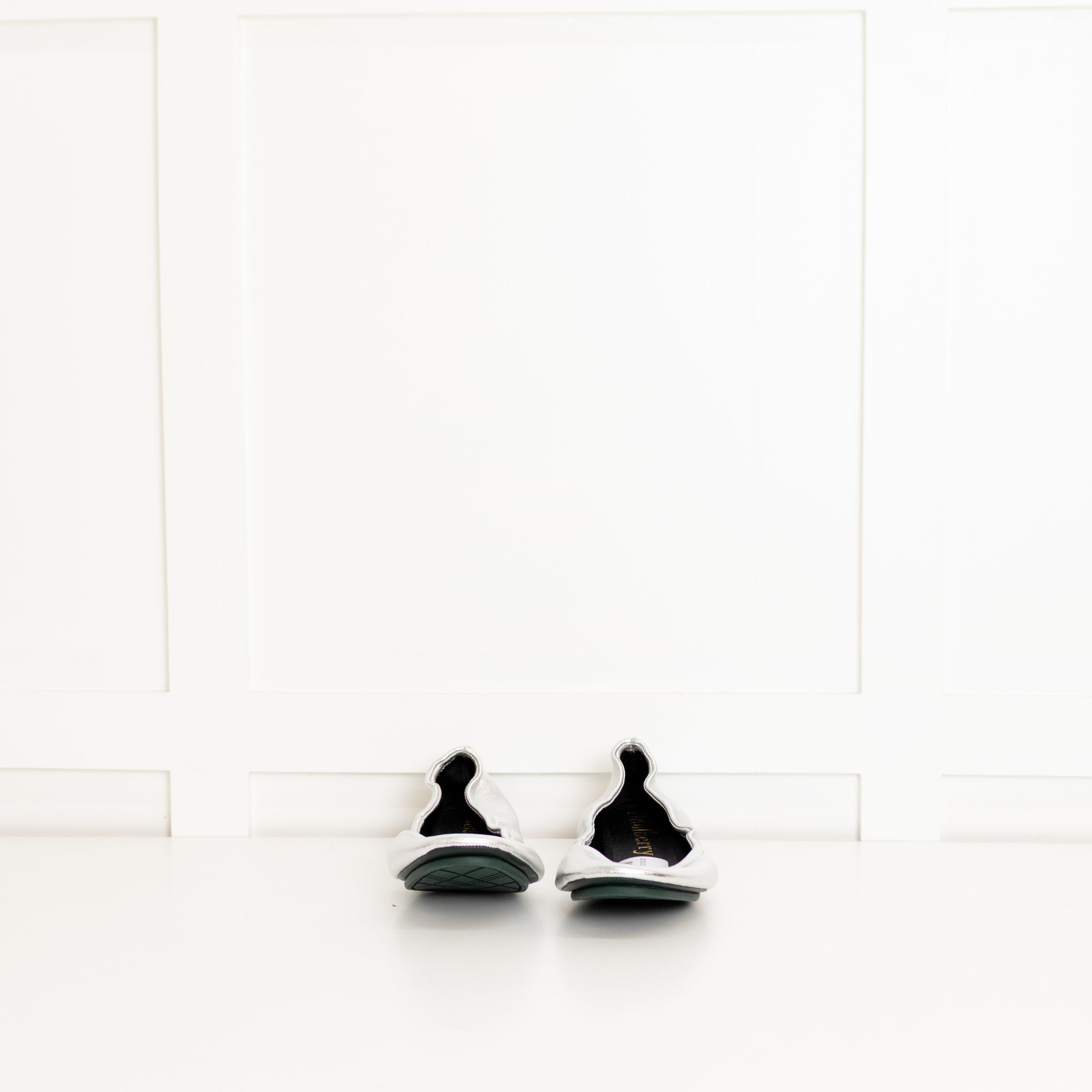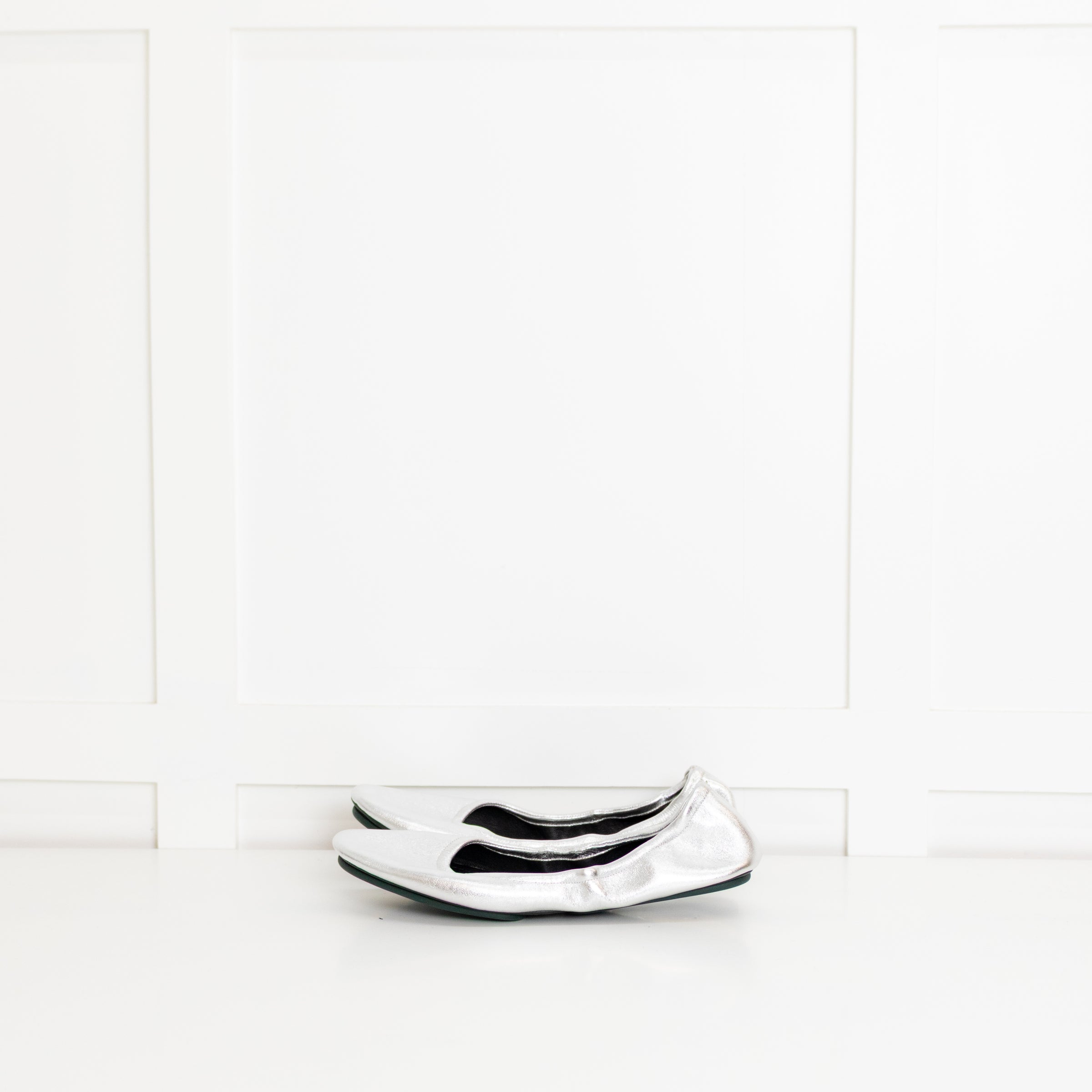 Mulberry metallic silver leather ballet flat pumps finished with elasticated sides, sectional rubber soles, and branded leather footbeds.