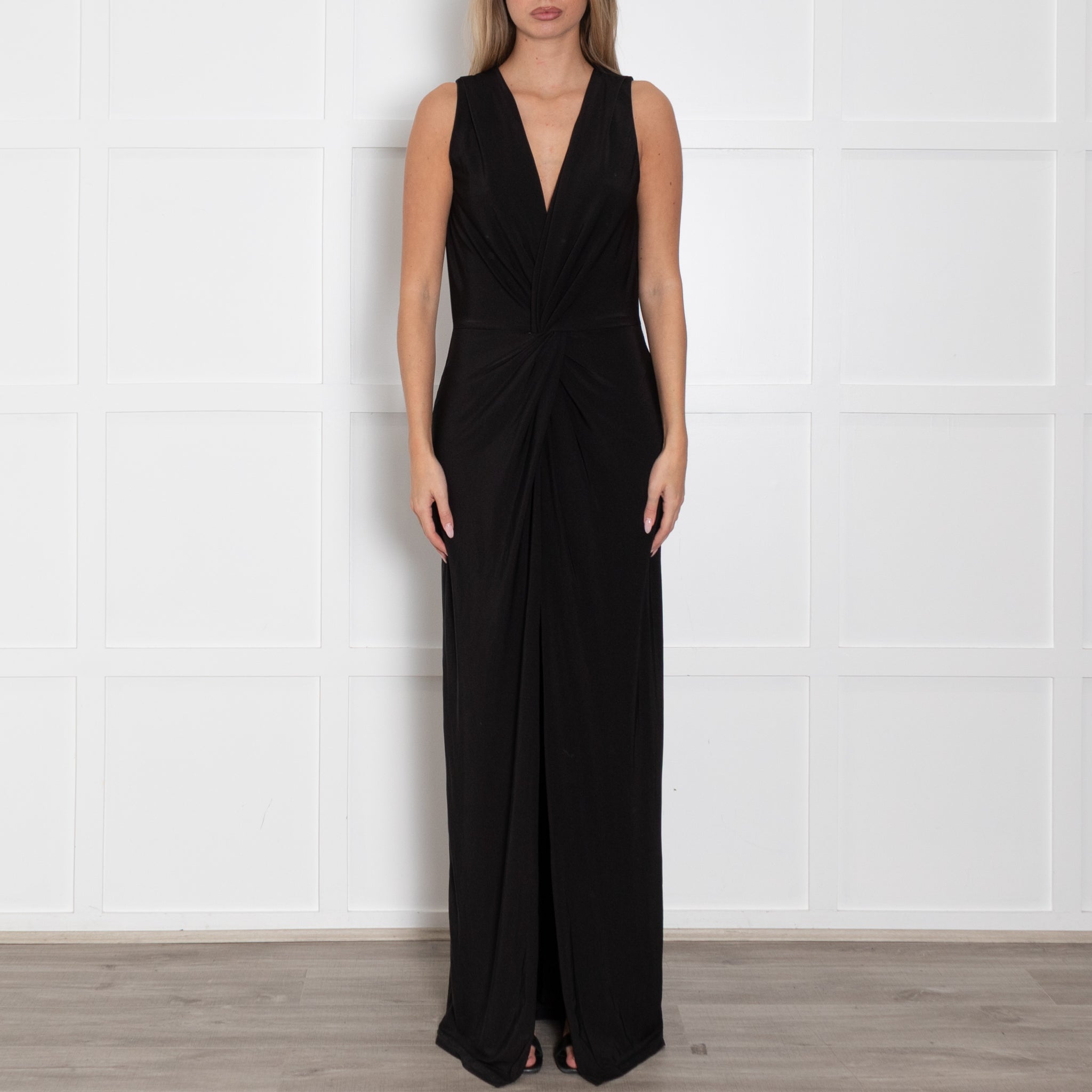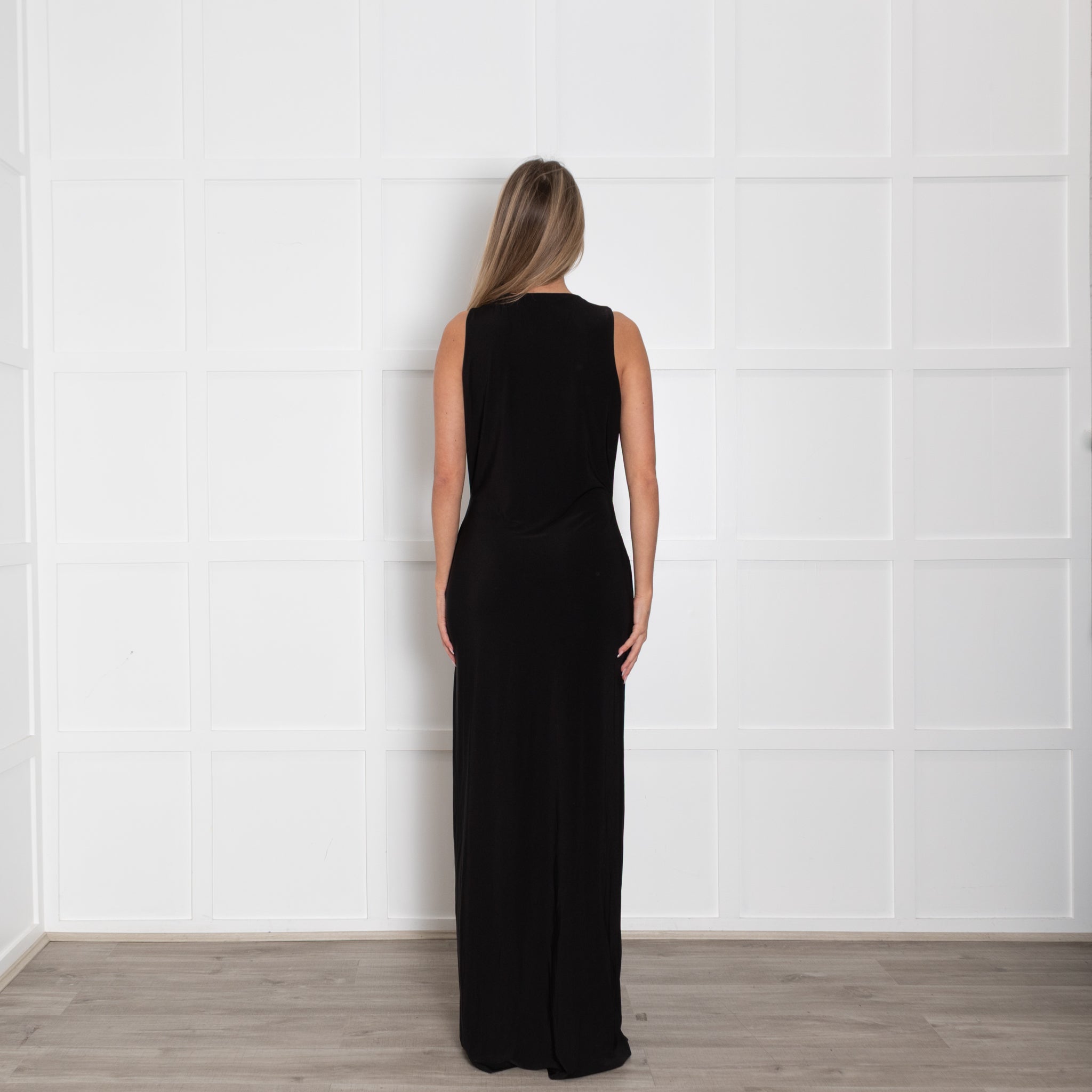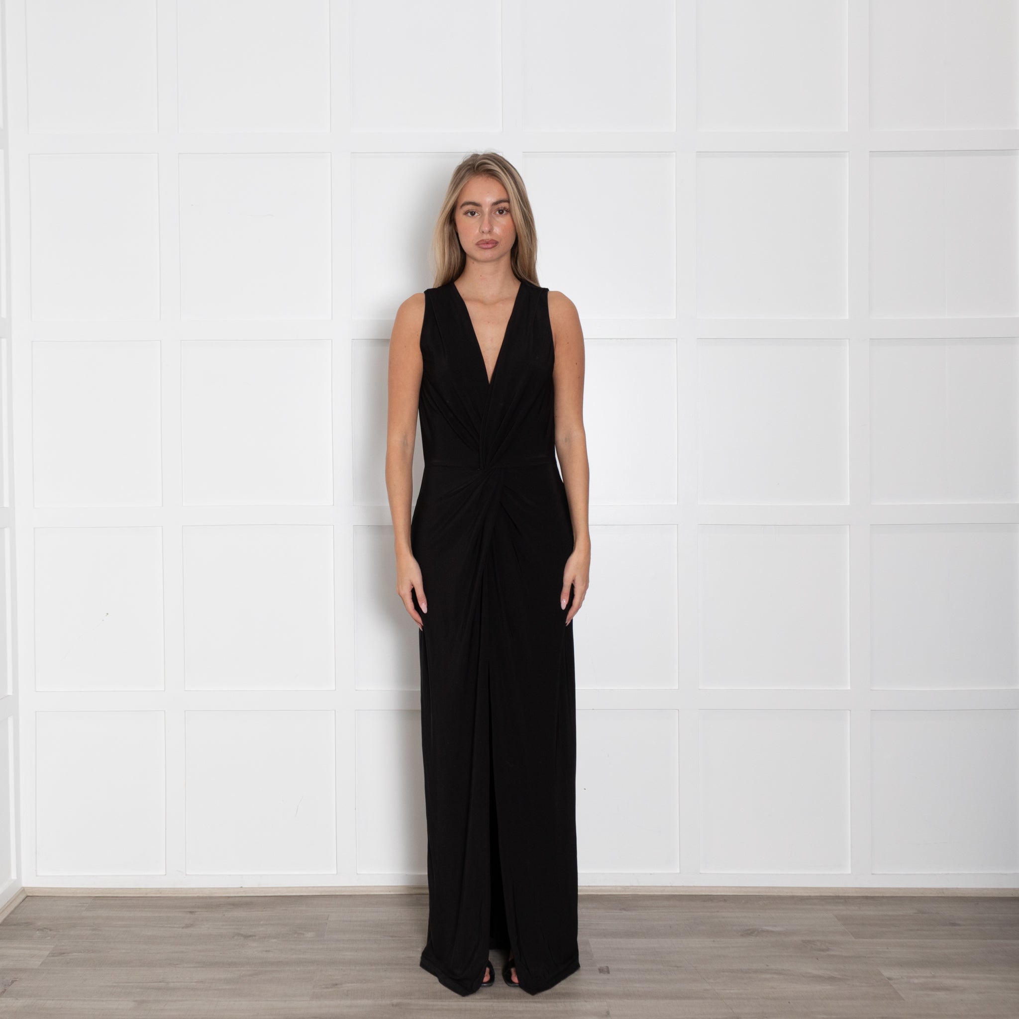 Nadine Merabi black, sleeveless maxi dress, featuring a front V-neckline sculpt.