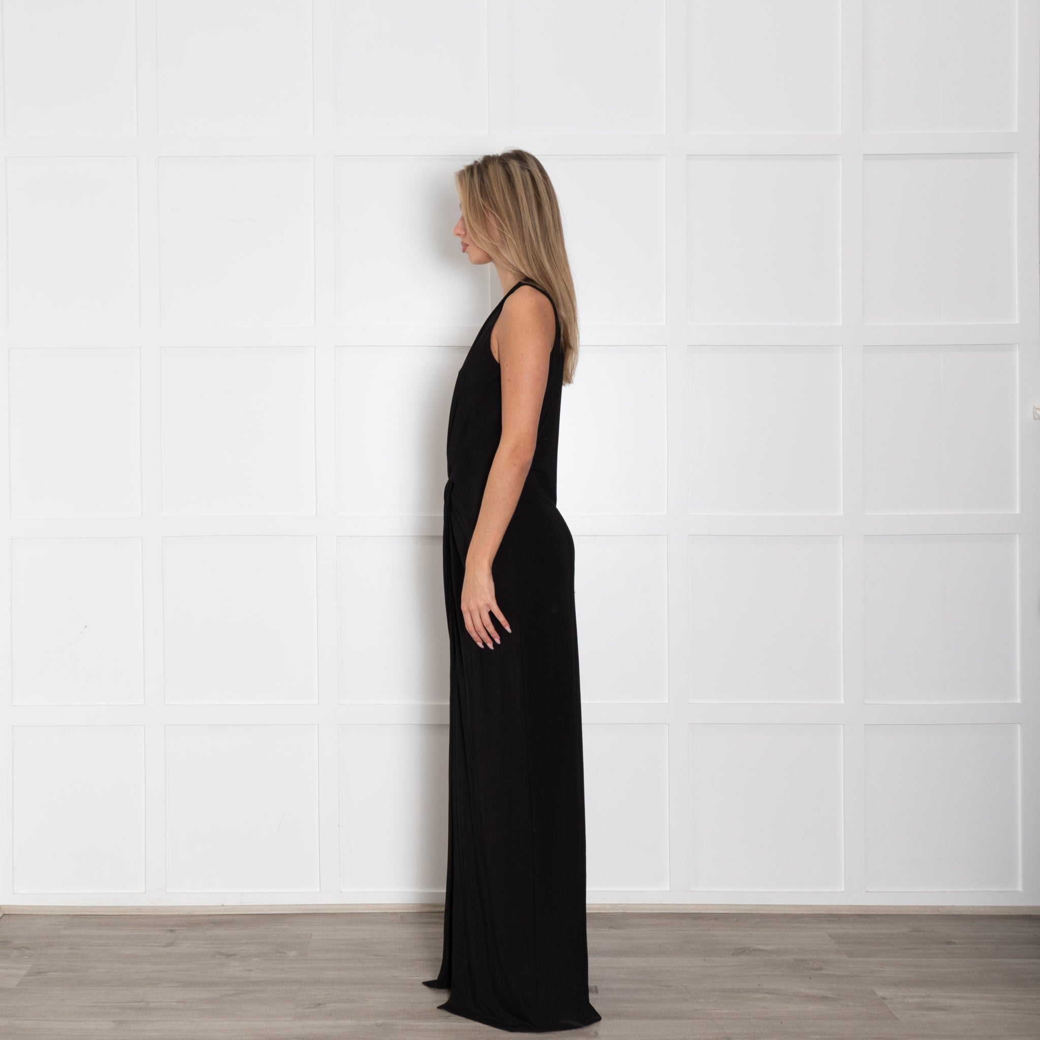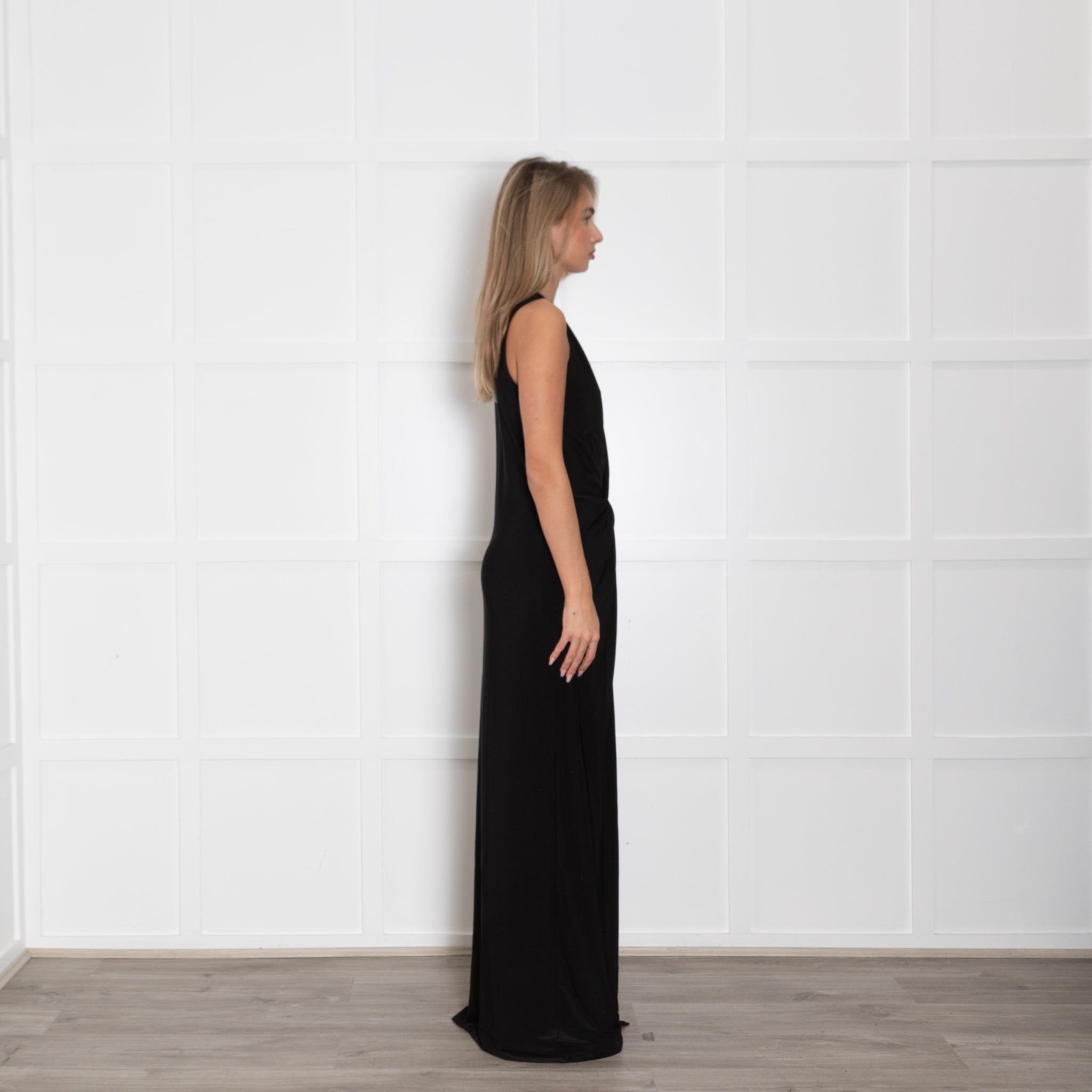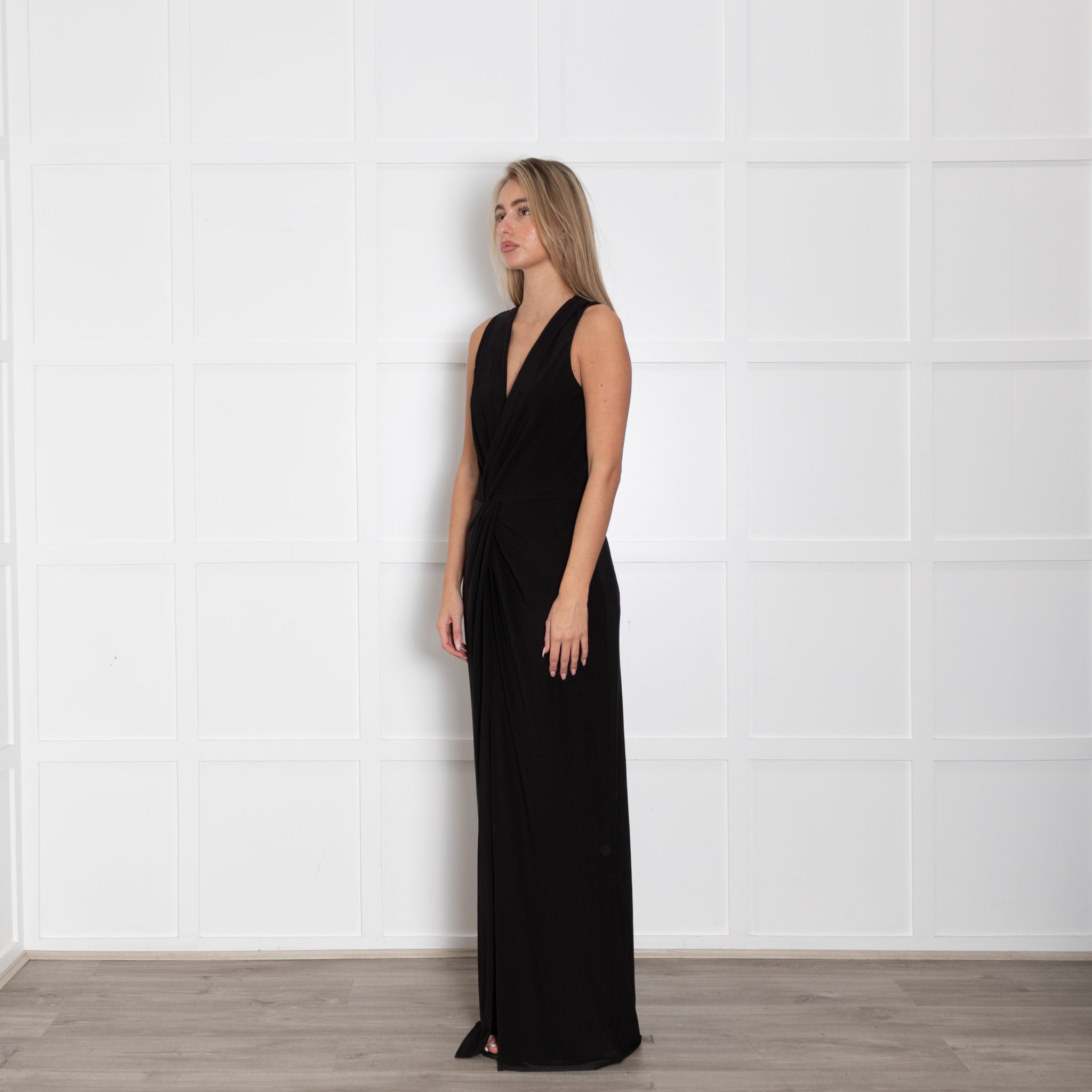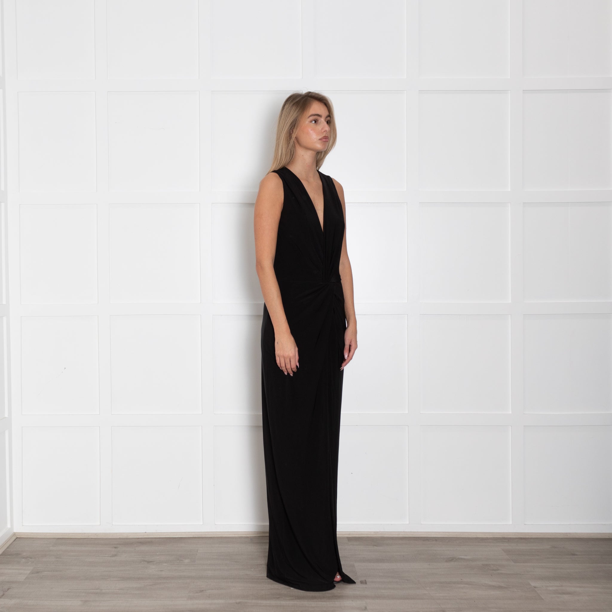 Nadine Merabi black, sleeveless maxi dress, featuring a front V-neckline sculpt.