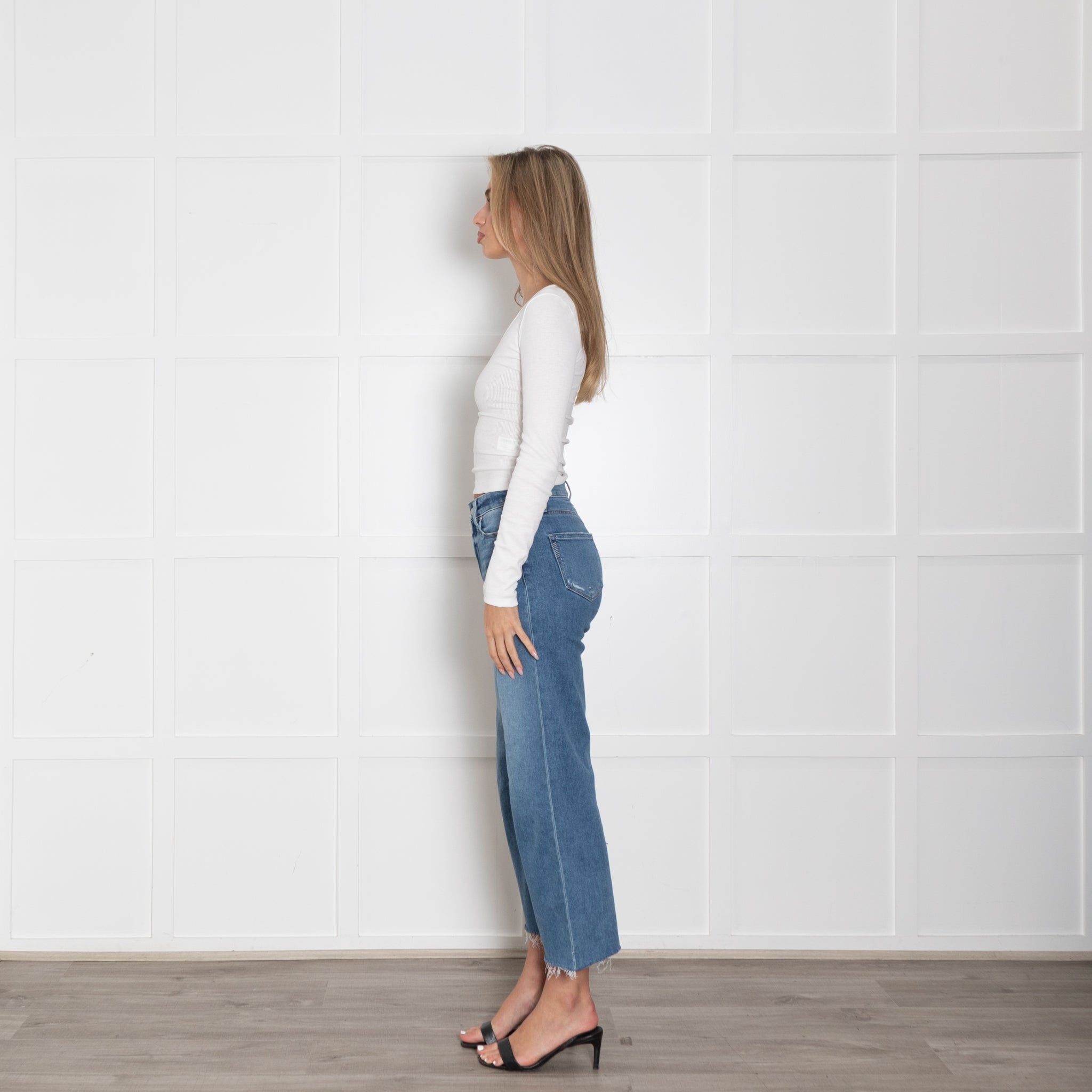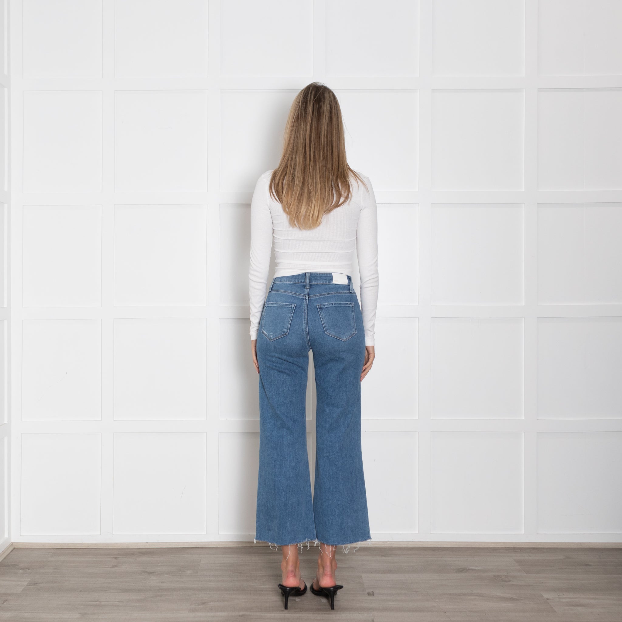 Paige blue jeans, featuring a distressed raw hem design, with two front pockets, two back pockets, a front zip-up and button up clousure, crafted with a soft cotton mix fabric.