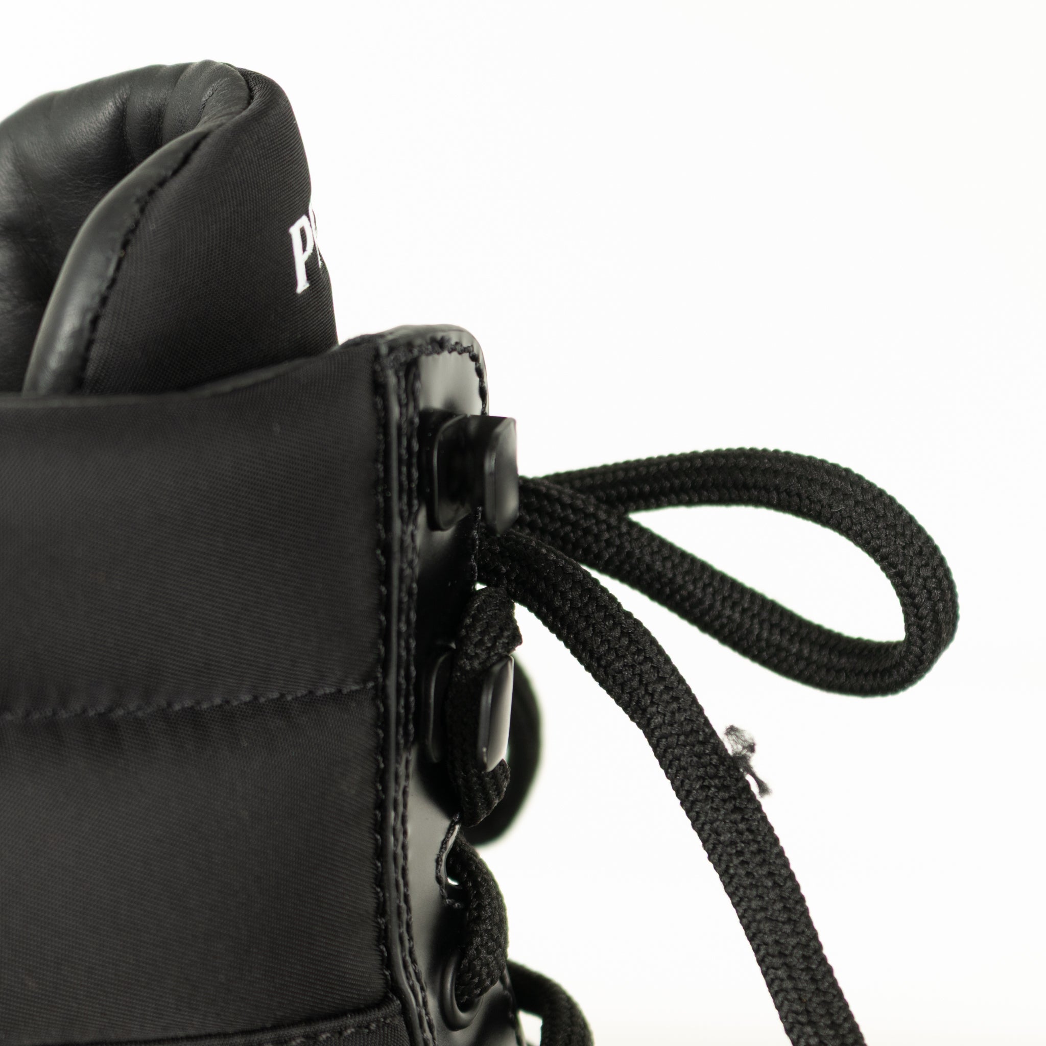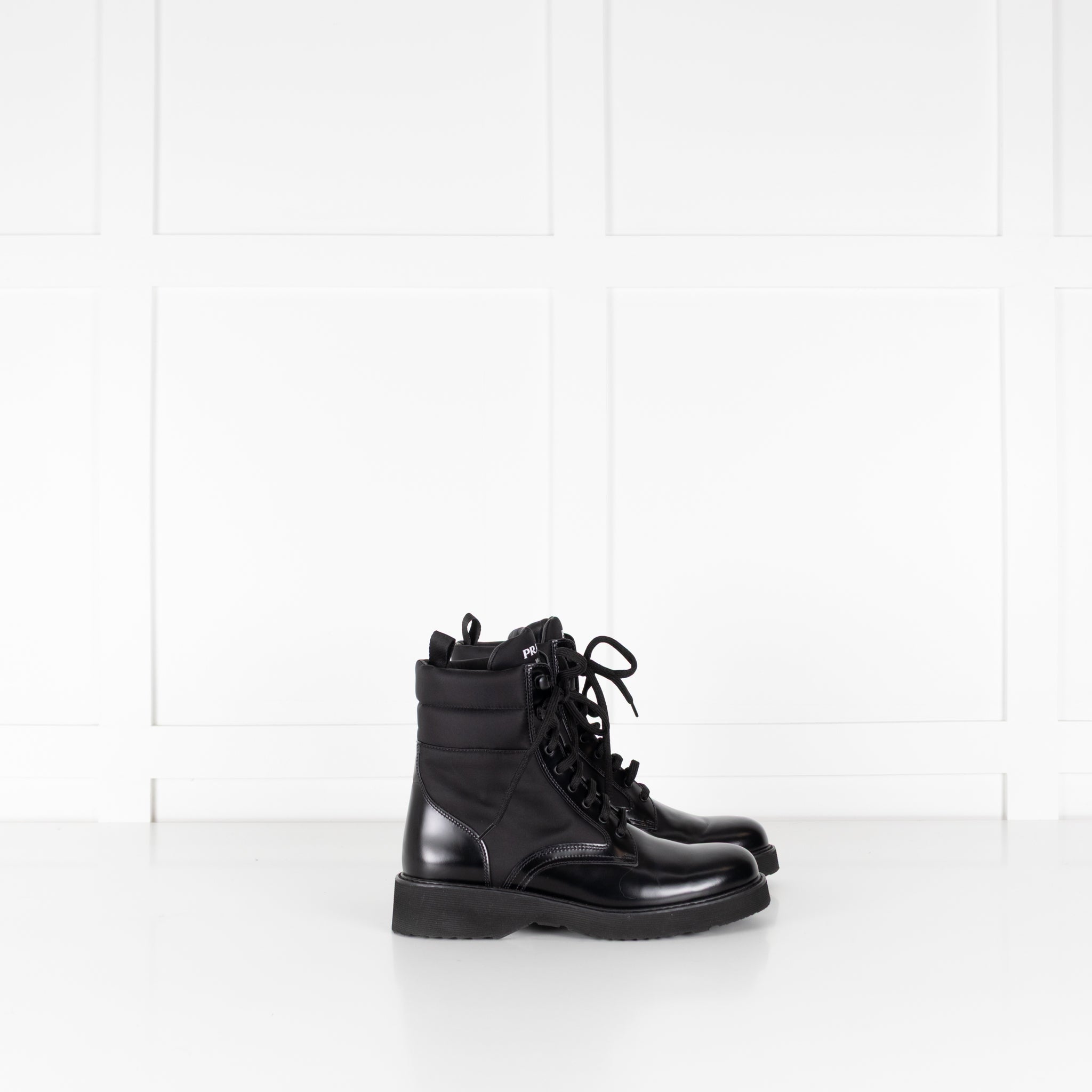 Prada Black Monolith combat boots. These versatile boots are nylon and leather with the Prada logo on the tongue. Accompanied by original box.