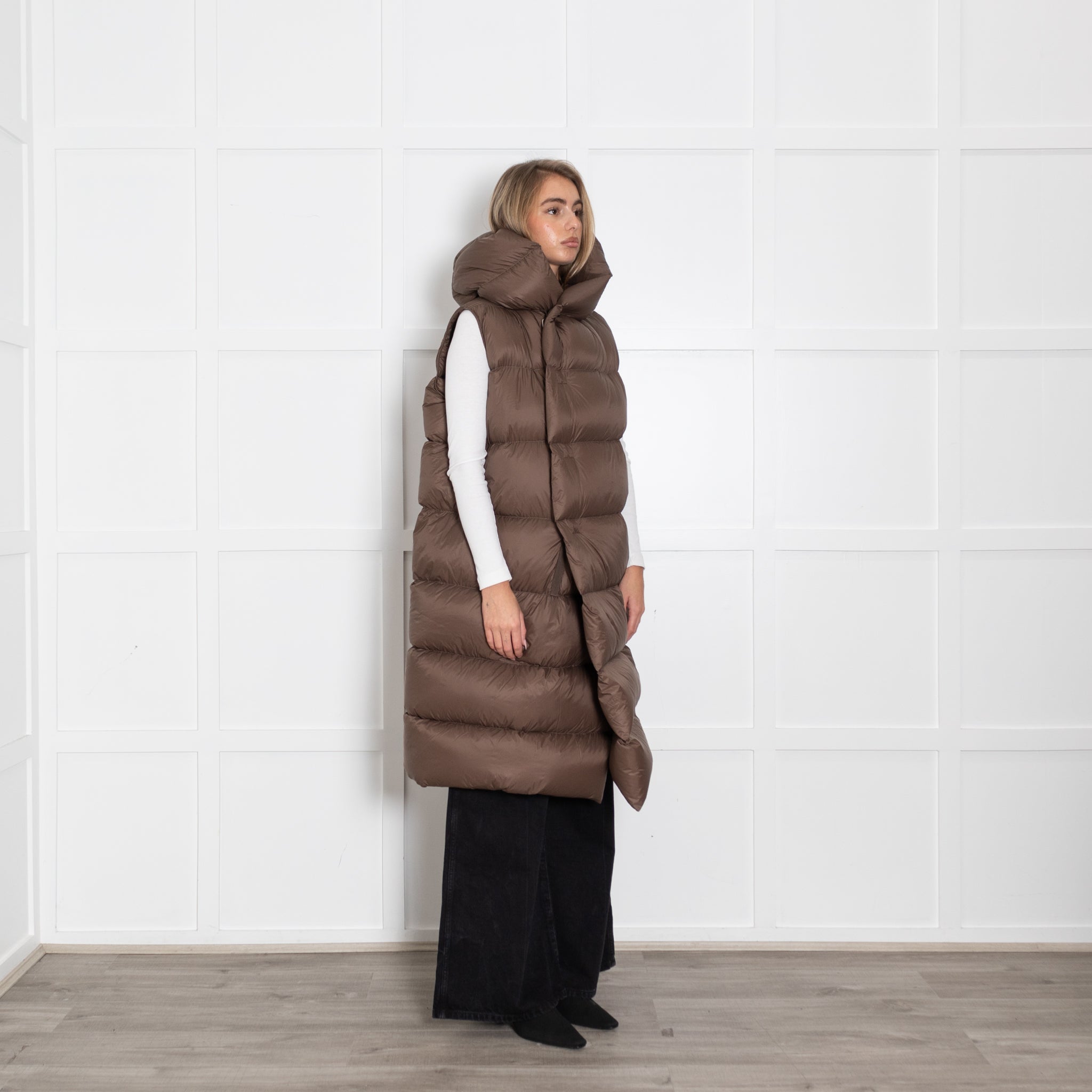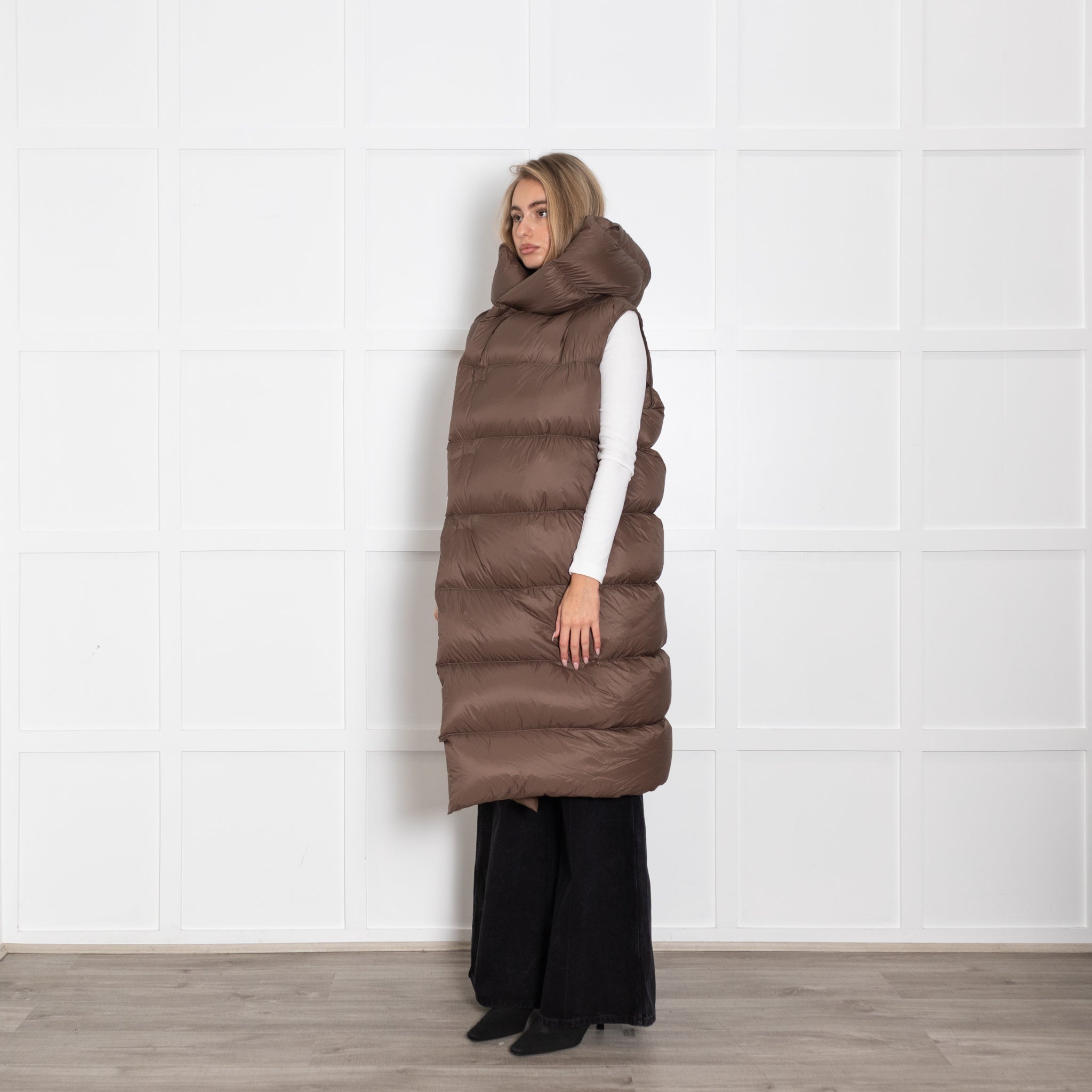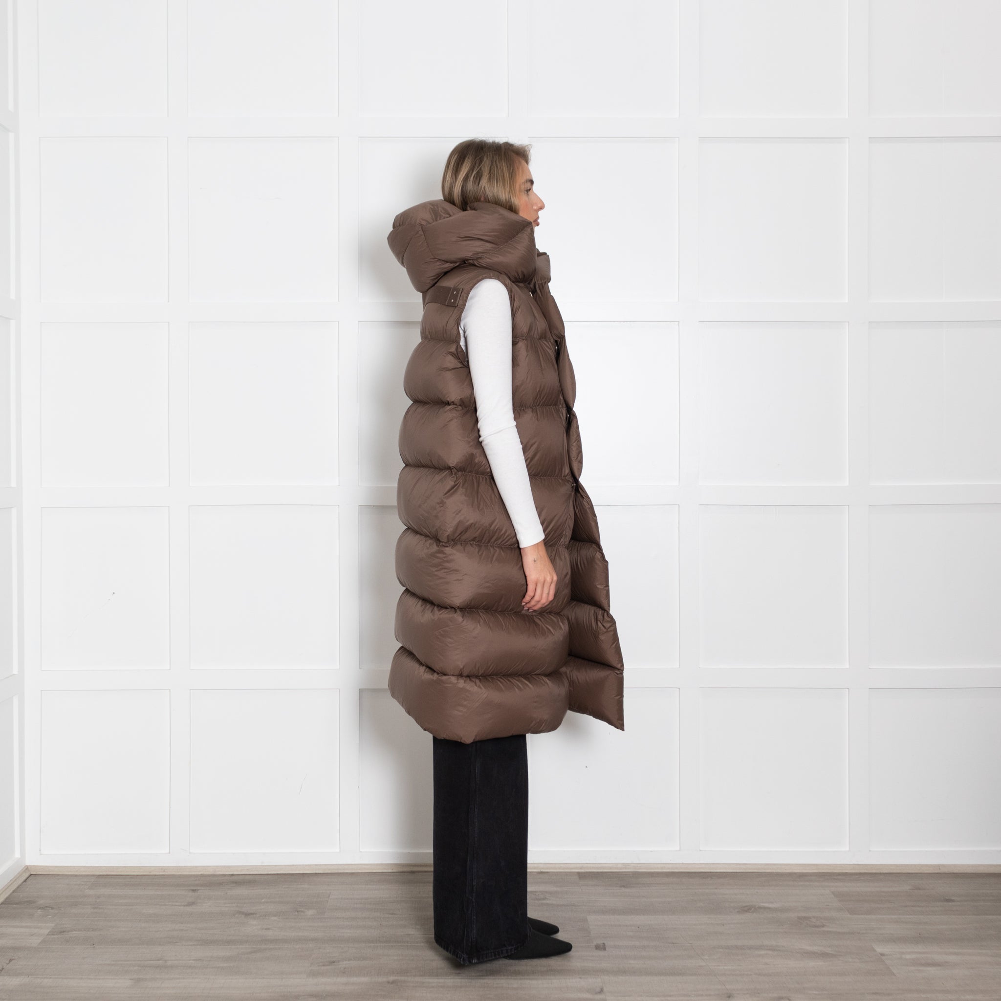 Rick Owens brown puffa coat, featuring a sleeveless design, with a matching hood, and a button-up front closure, crafted with natural feather down.