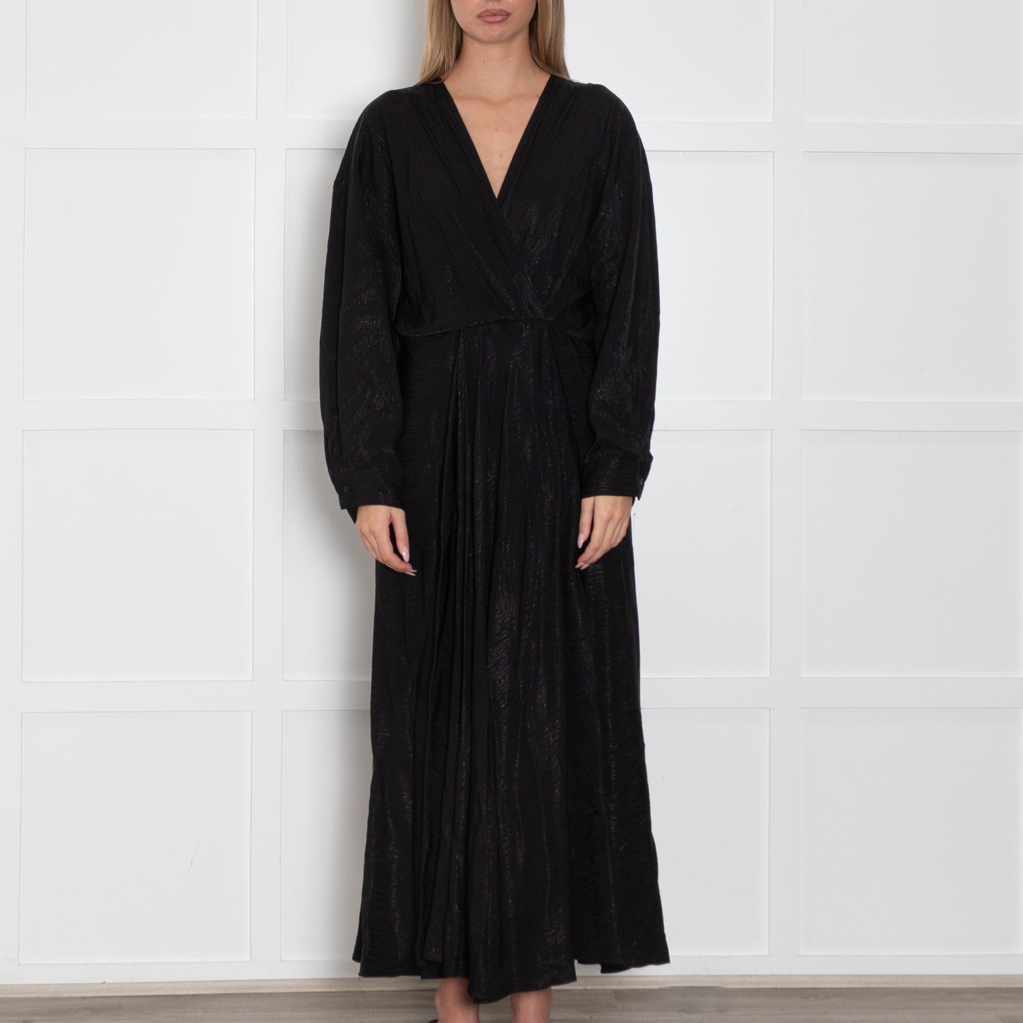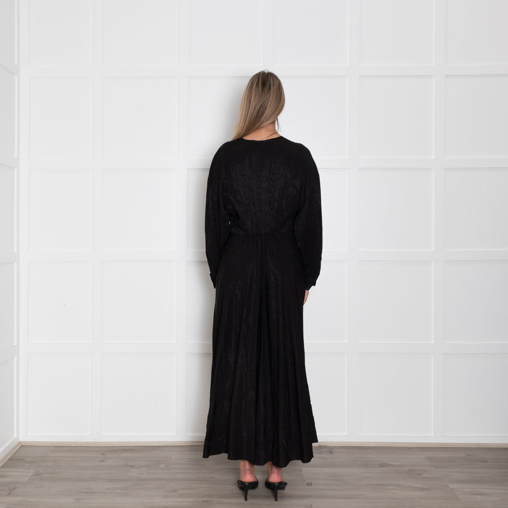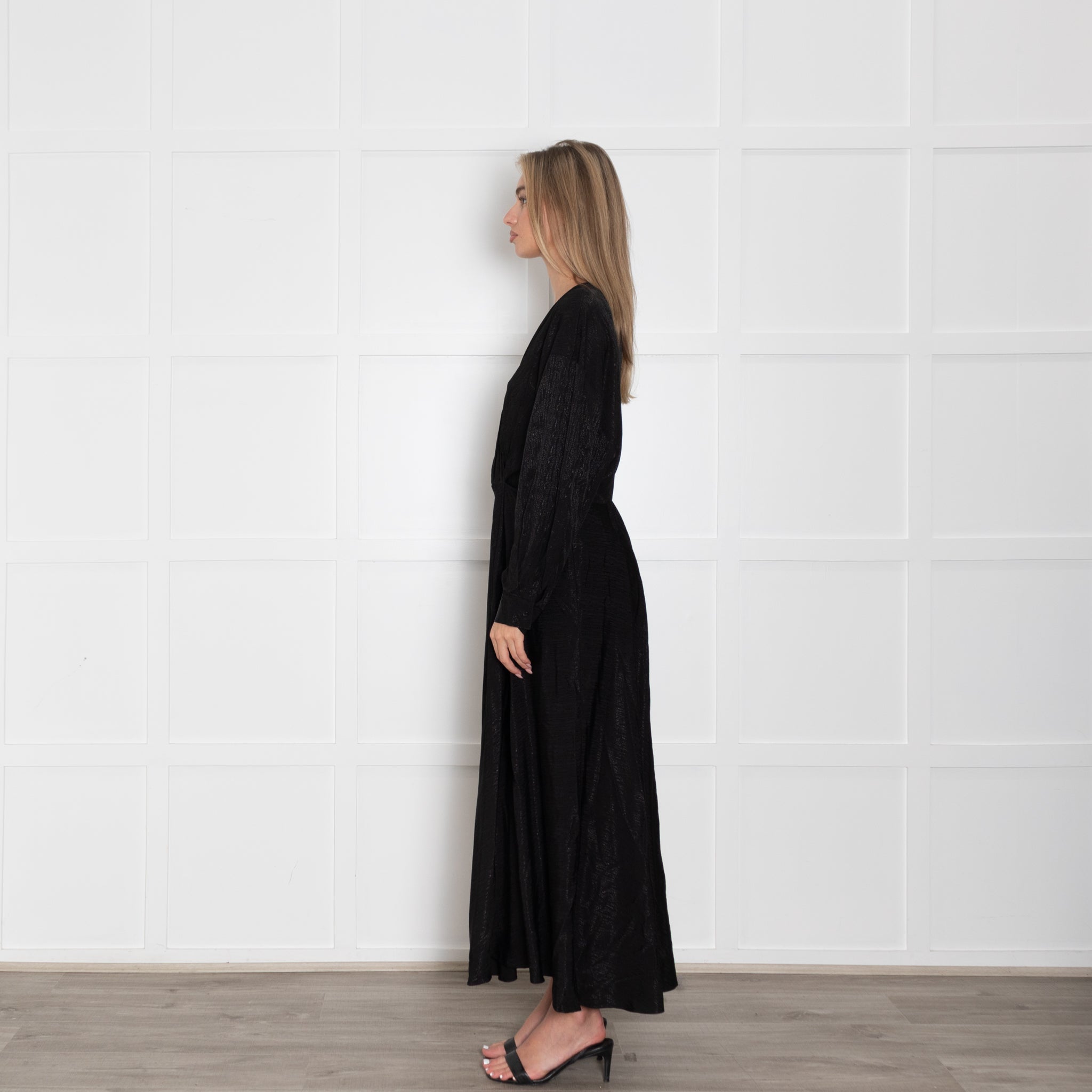 Second Female long sleeve long dress, featuring a black on black print design, with a V-neckline a pinched waist and a button-up sleeve design.