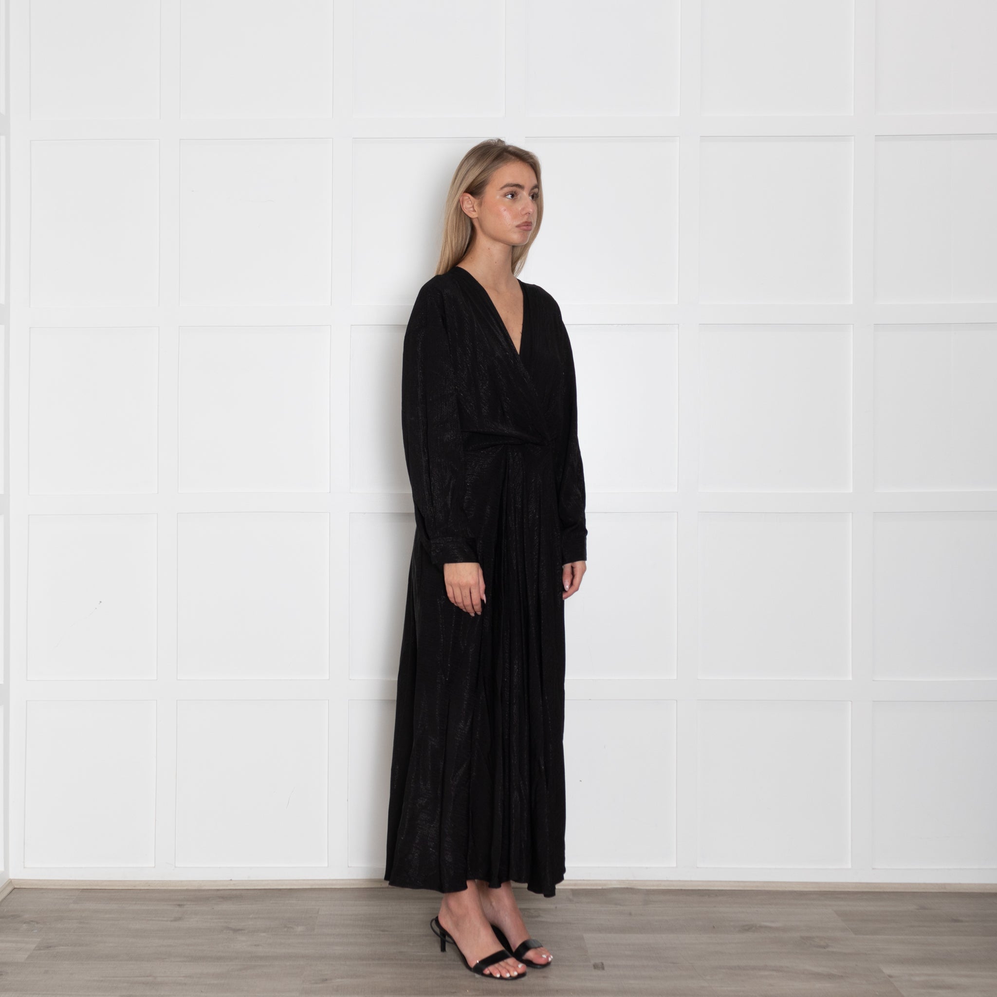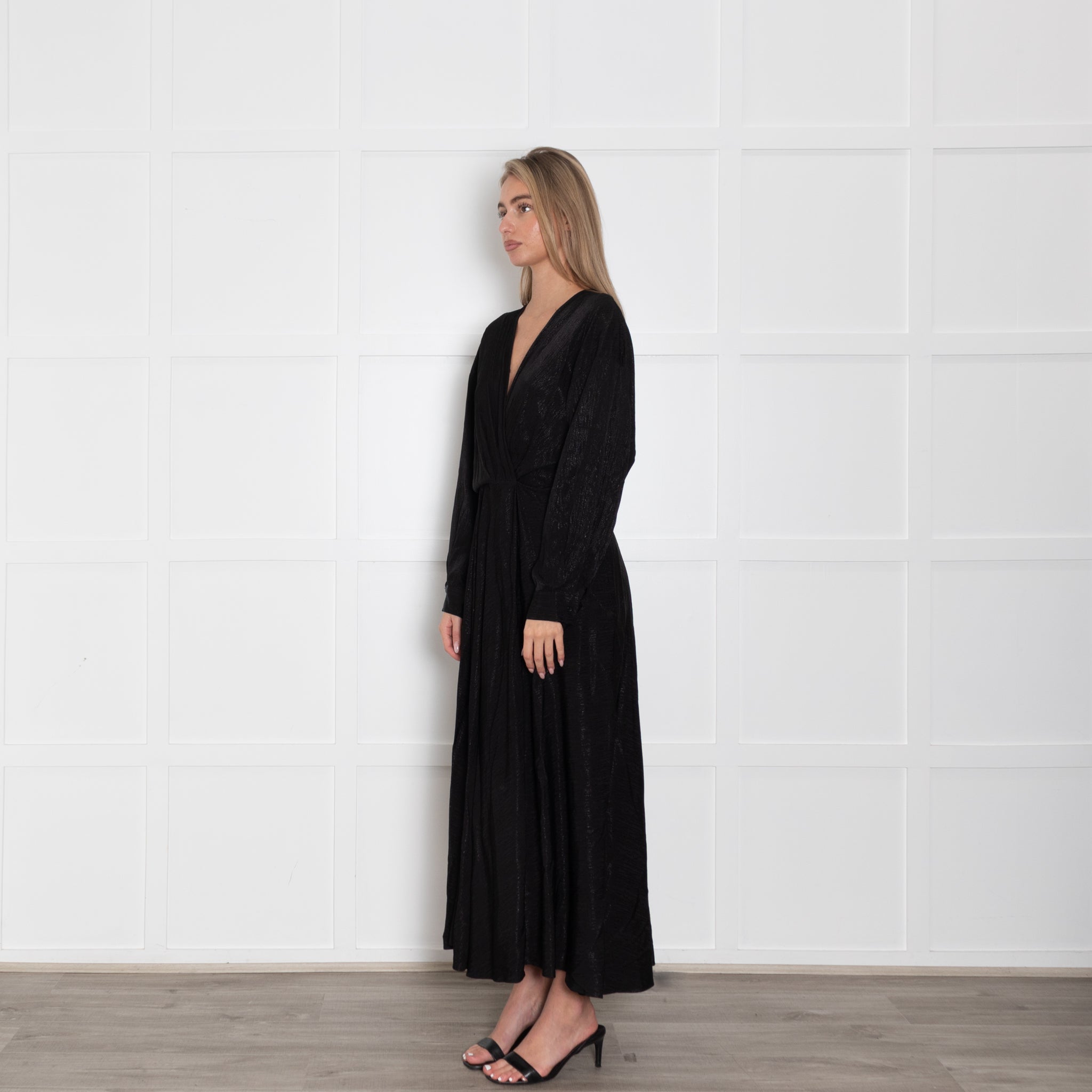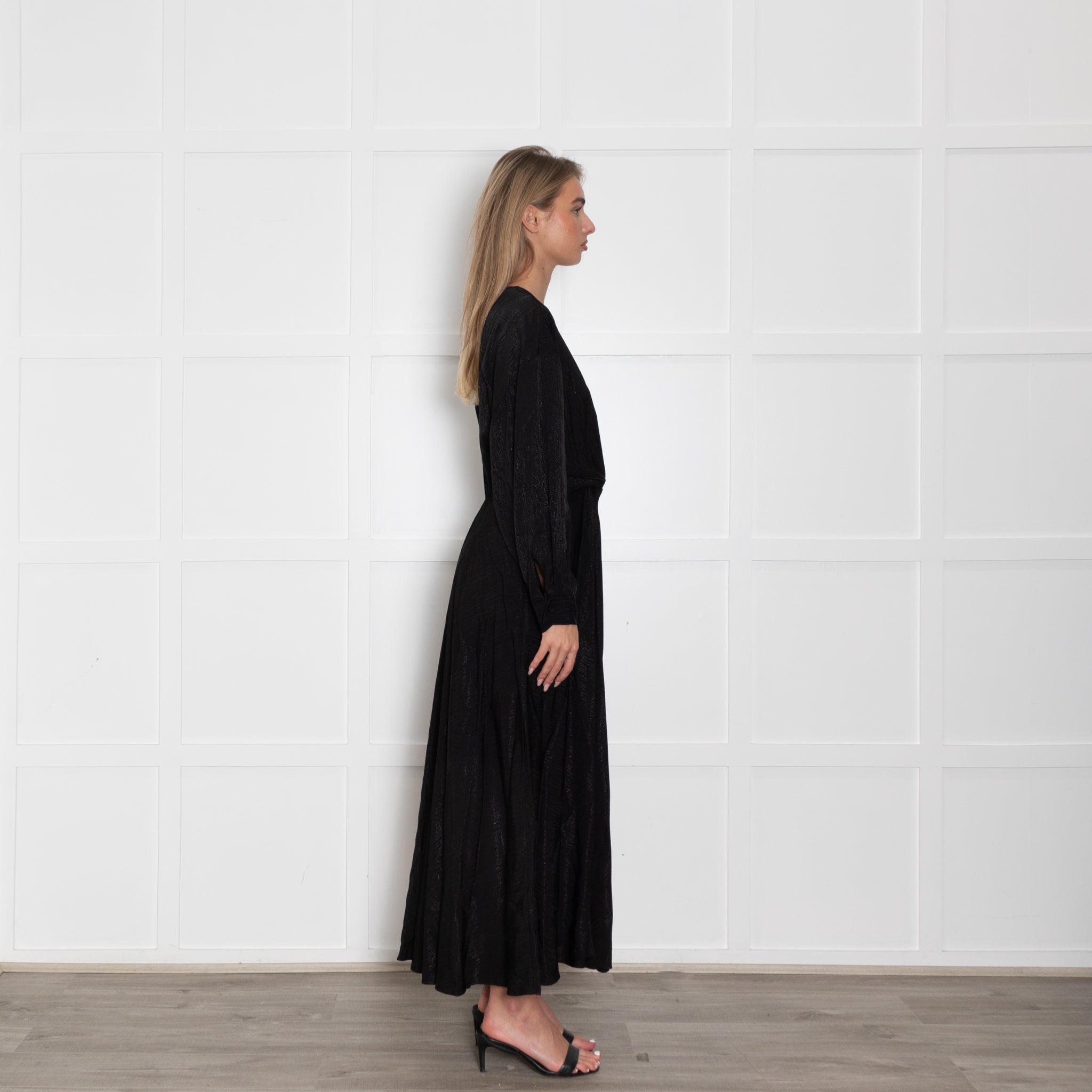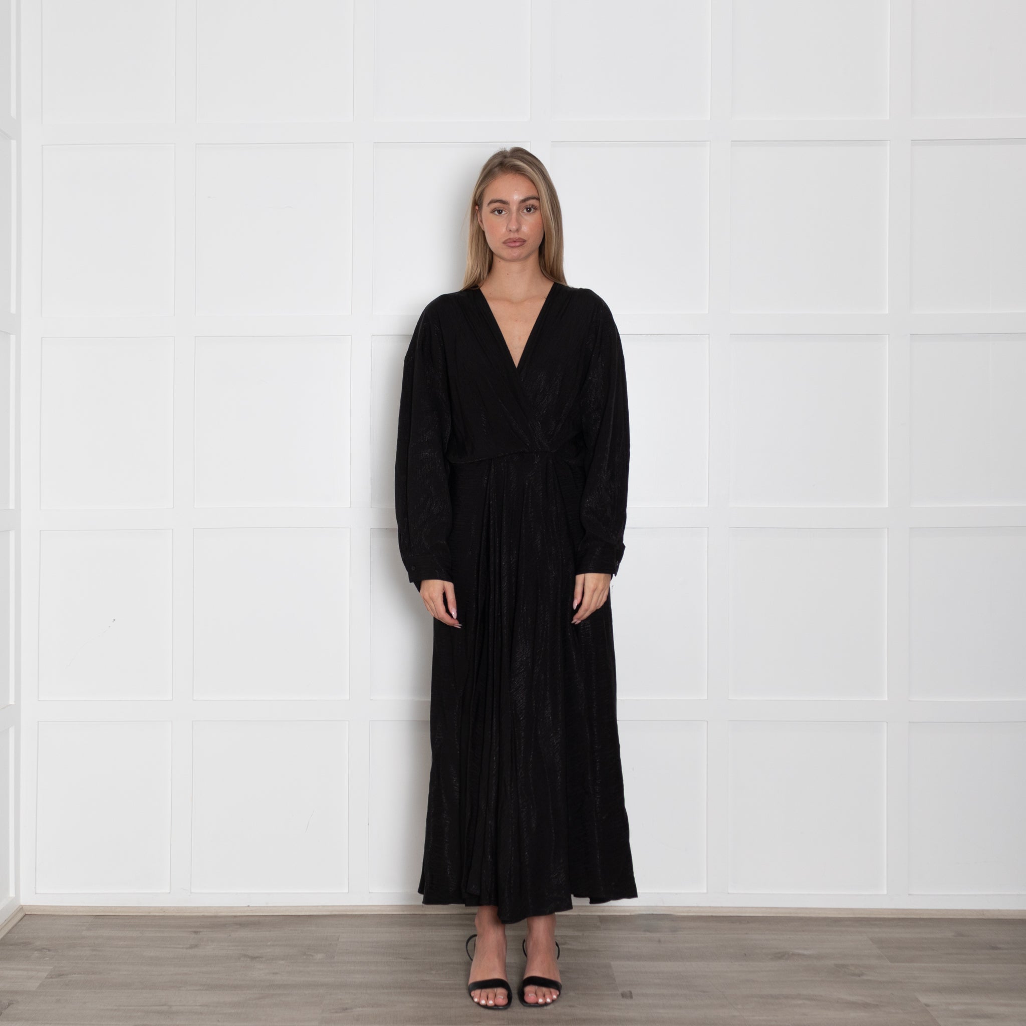 Second Female long sleeve long dress, featuring a black on black print design, with a V-neckline a pinched waist and a button-up sleeve design.