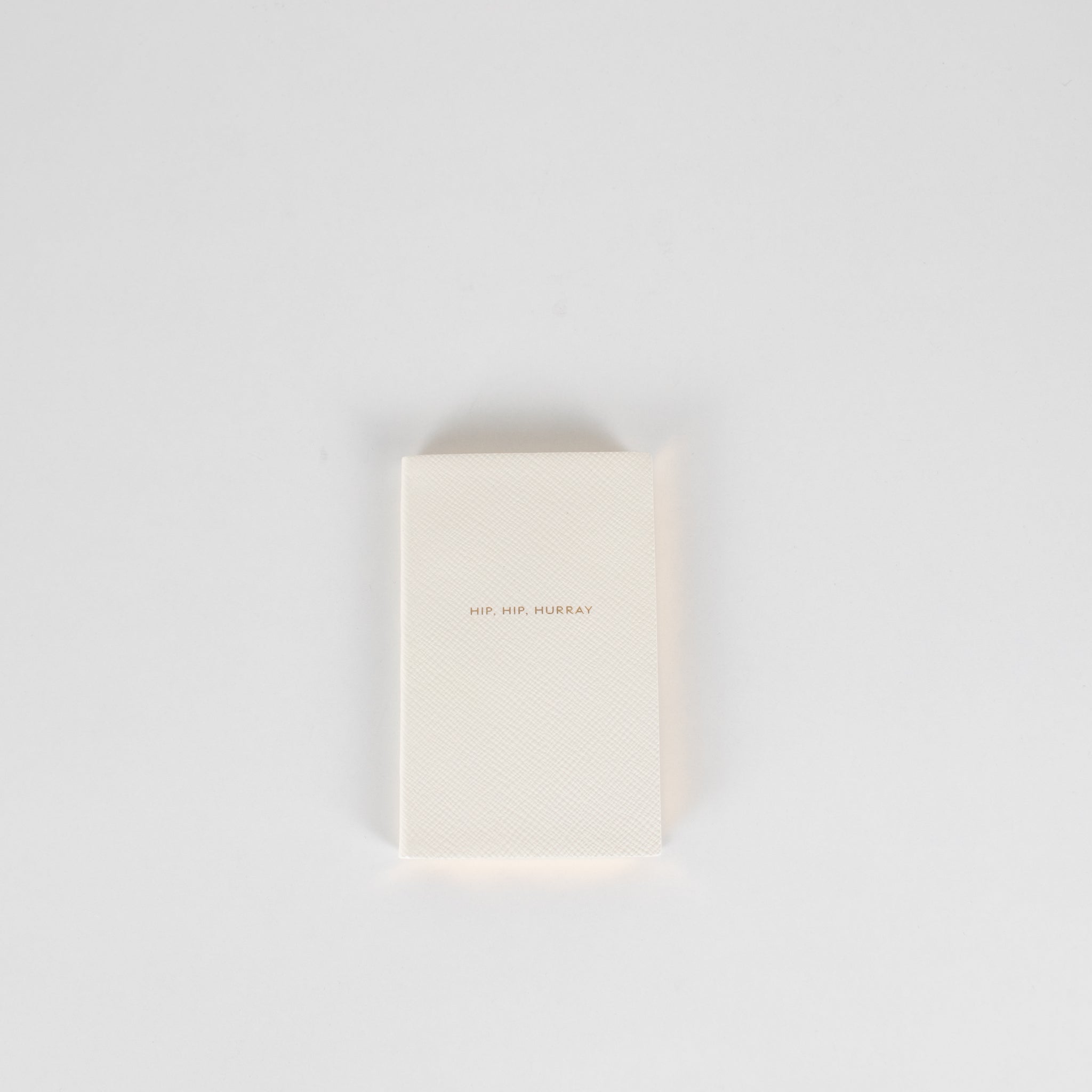 Smythson cream 'HIP, HIP, HURRAY' Panama Notebook in leather, measuring 14 x 10 cm. Pre-loved in good condition and complete with the original dustbag.
