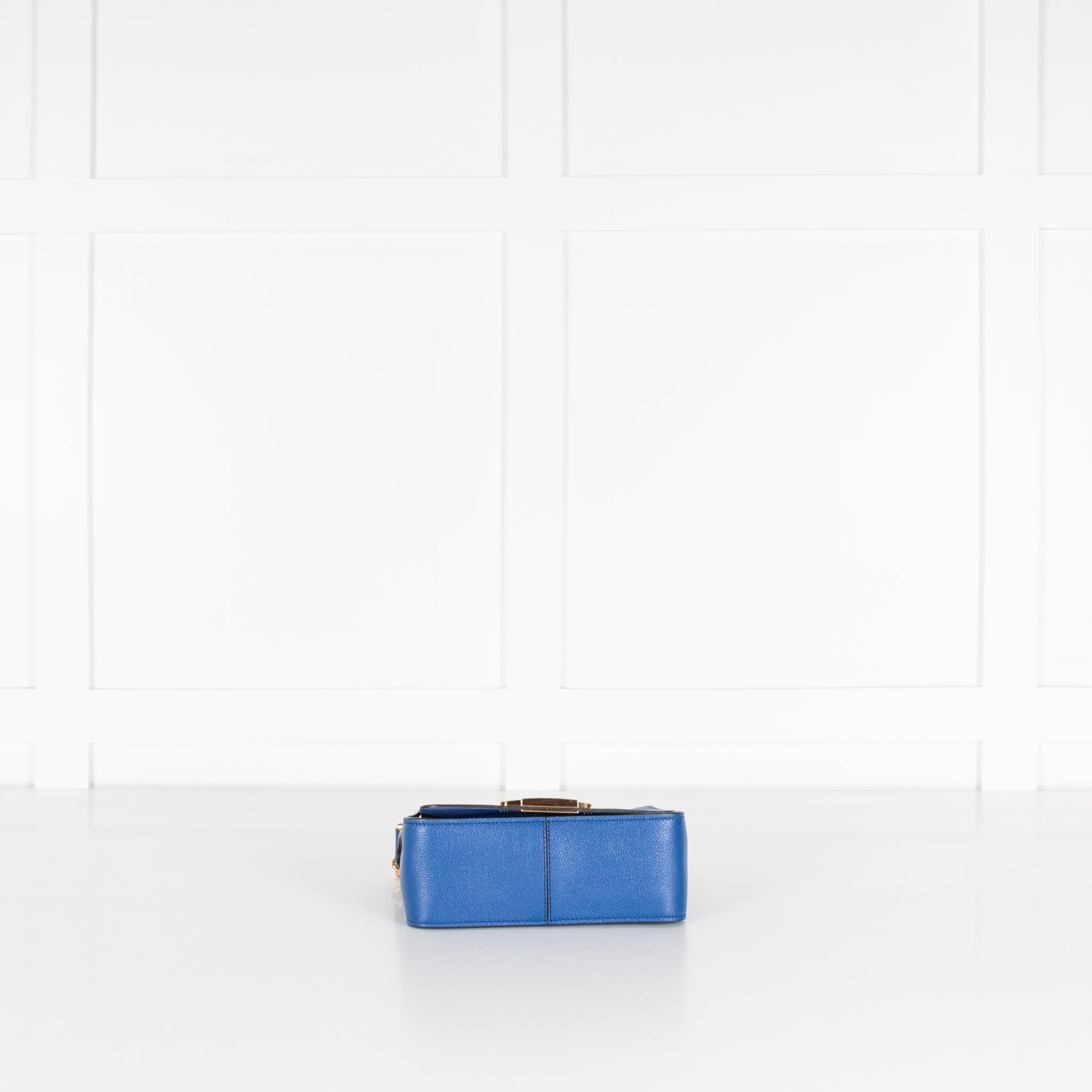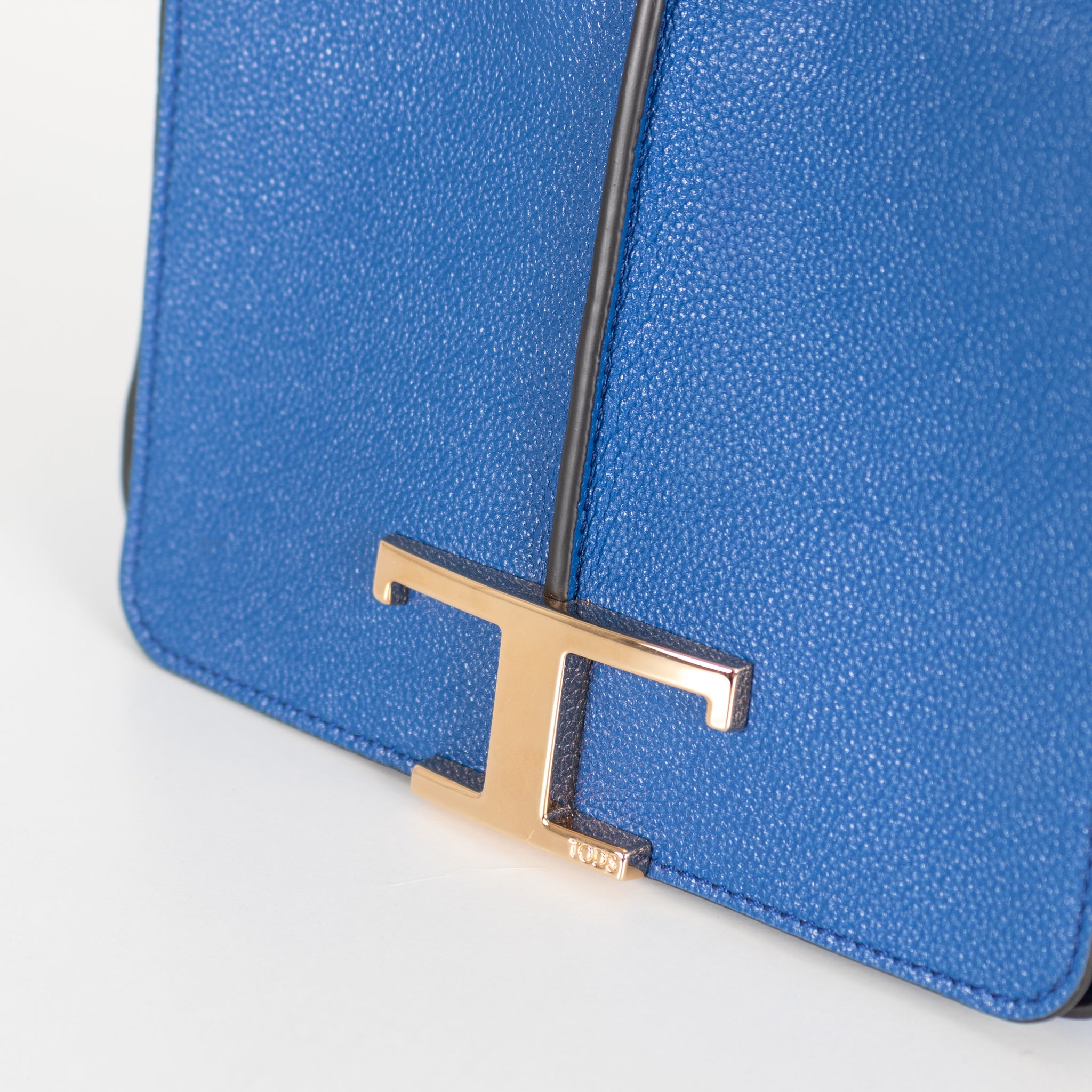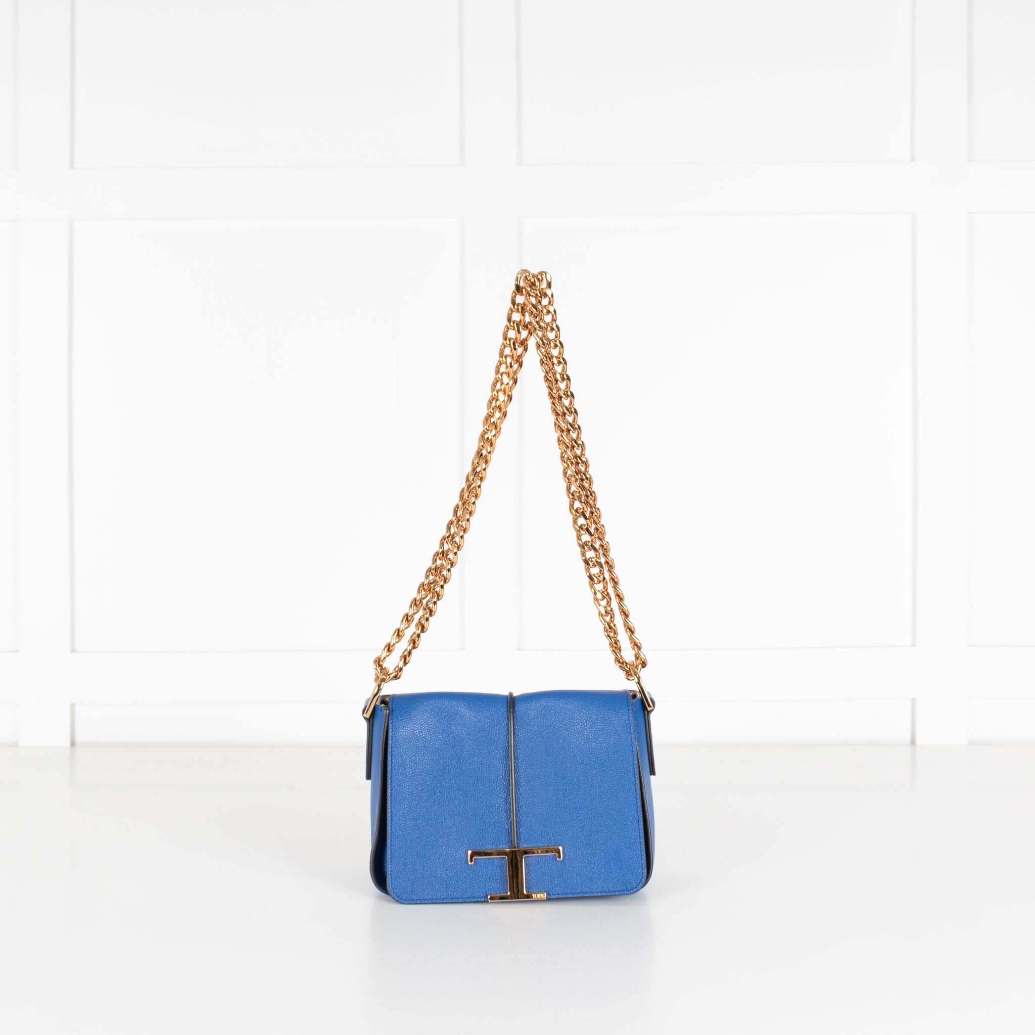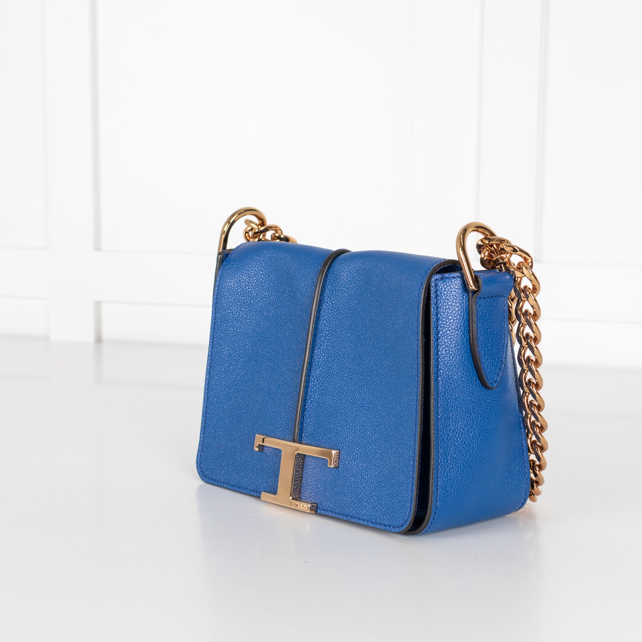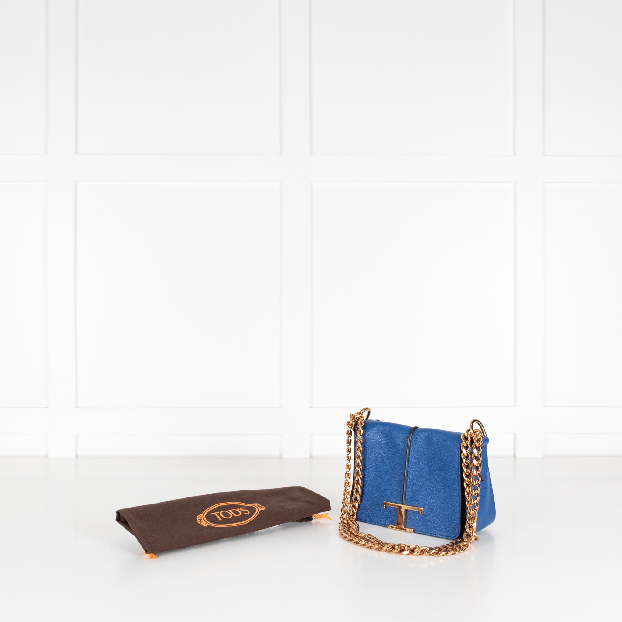 Tod's blue timeless mini crossbody bag in a grained leather featuring a large 'T' on the front flap and a sliding chain strap in gold-tone metal hardware. This bag is lined with suede, has one internal side zip pocket, and one external rear slip pocket. Original dust bag included.