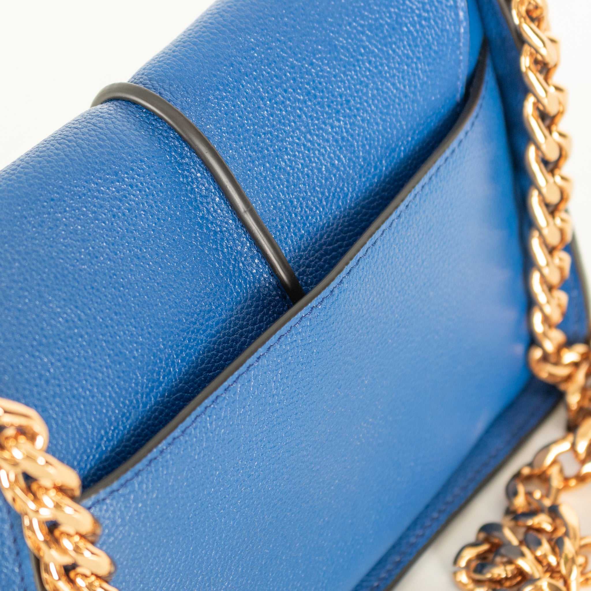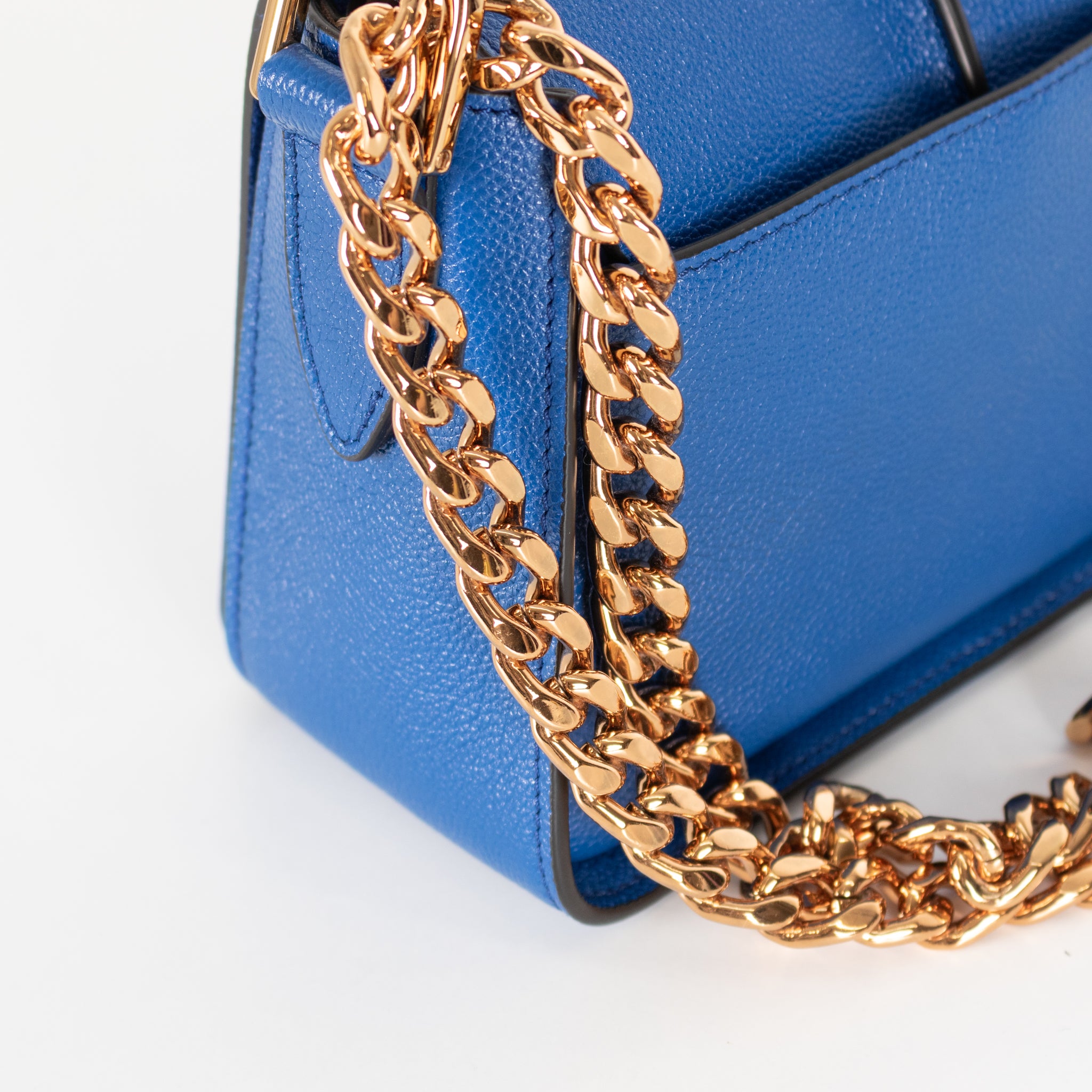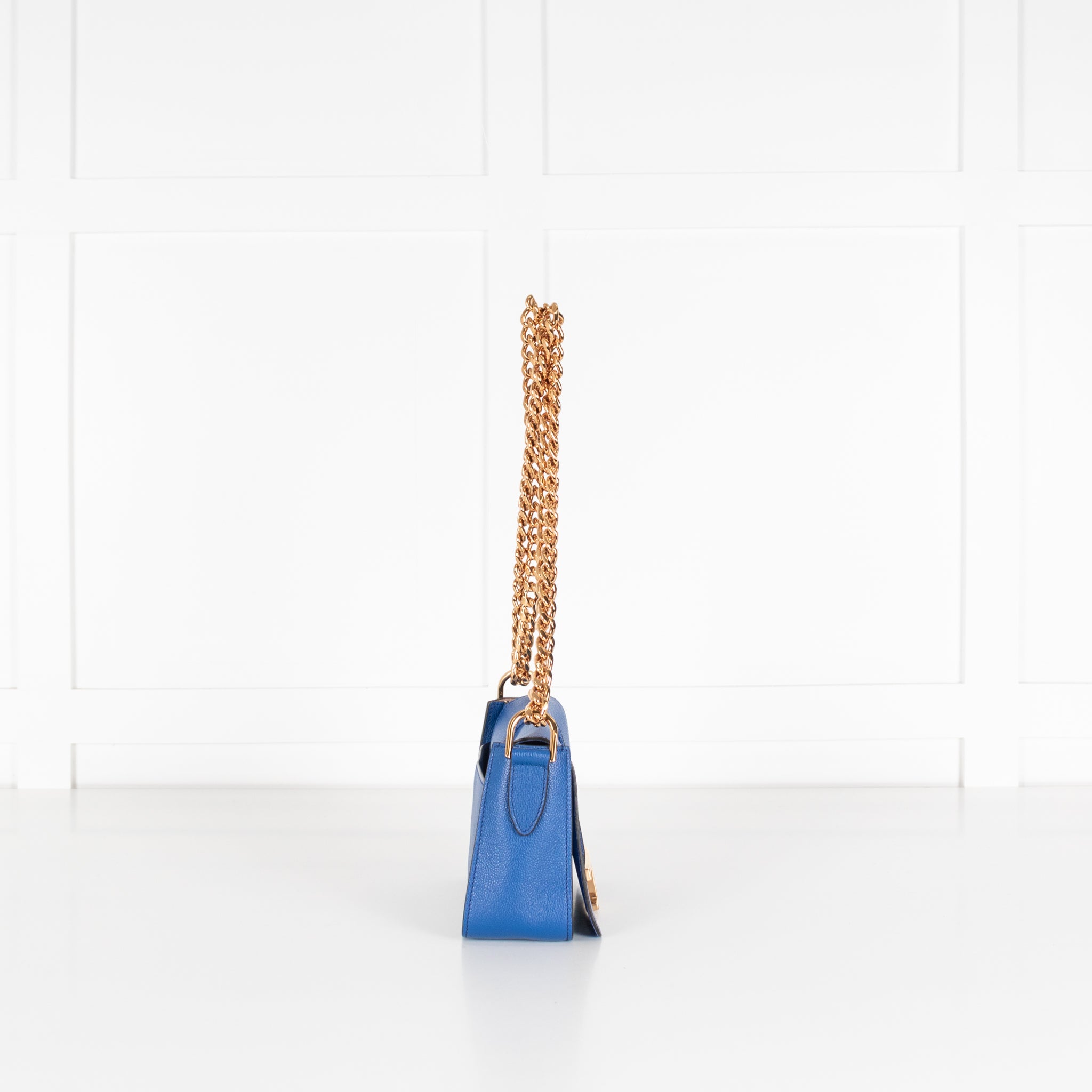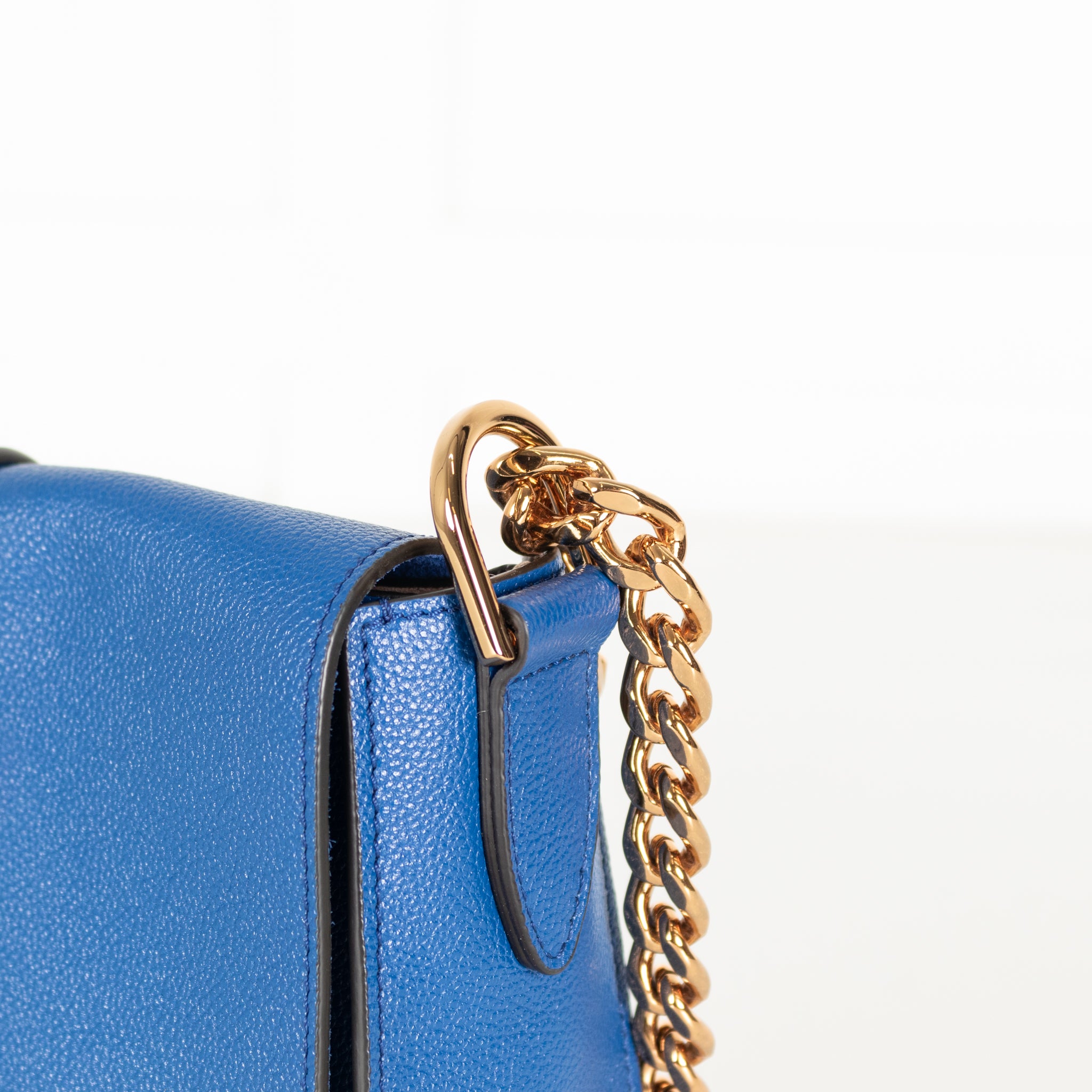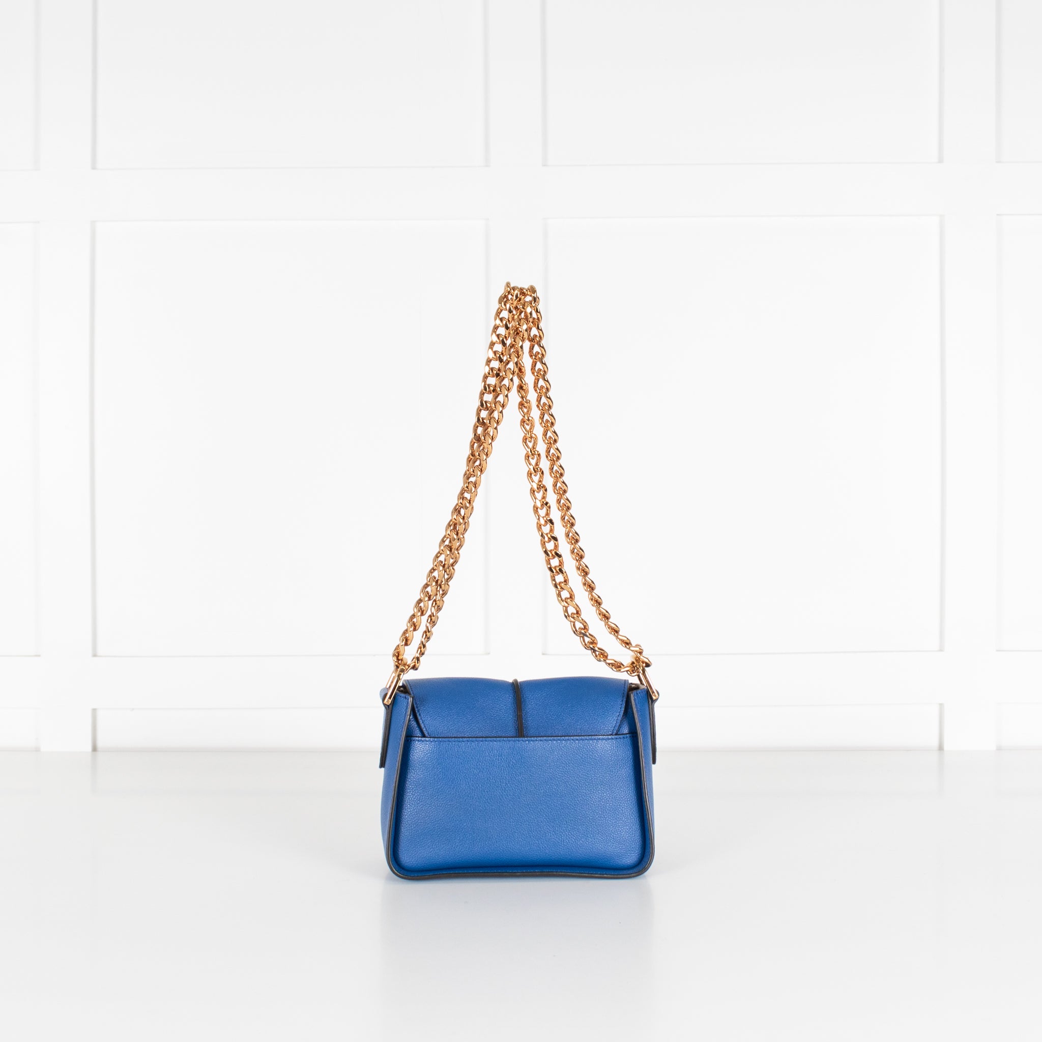 Tod's blue timeless mini crossbody bag in a grained leather featuring a large 'T' on the front flap and a sliding chain strap in gold-tone metal hardware. This bag is lined with suede, has one internal side zip pocket, and one external rear slip pocket. Original dust bag included.