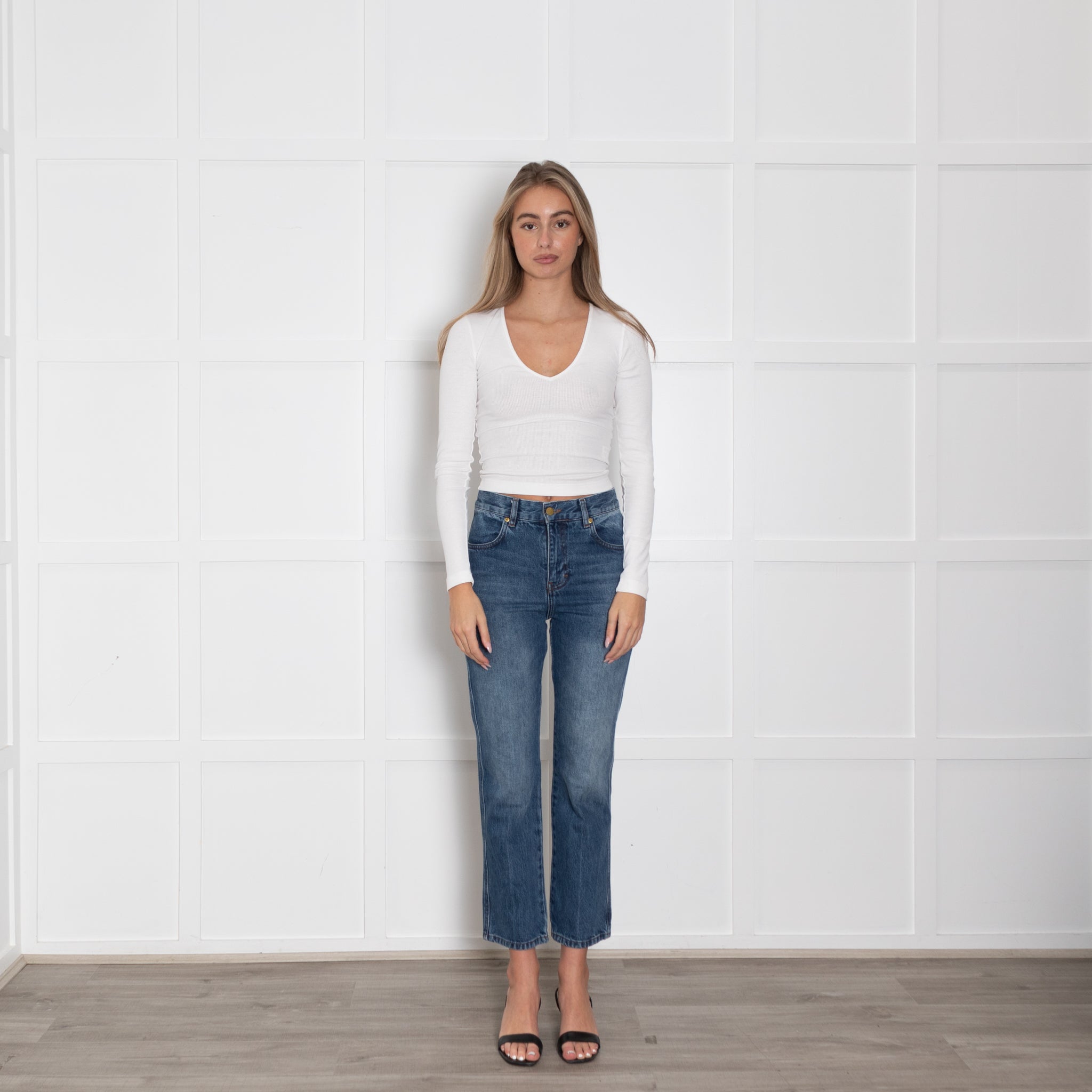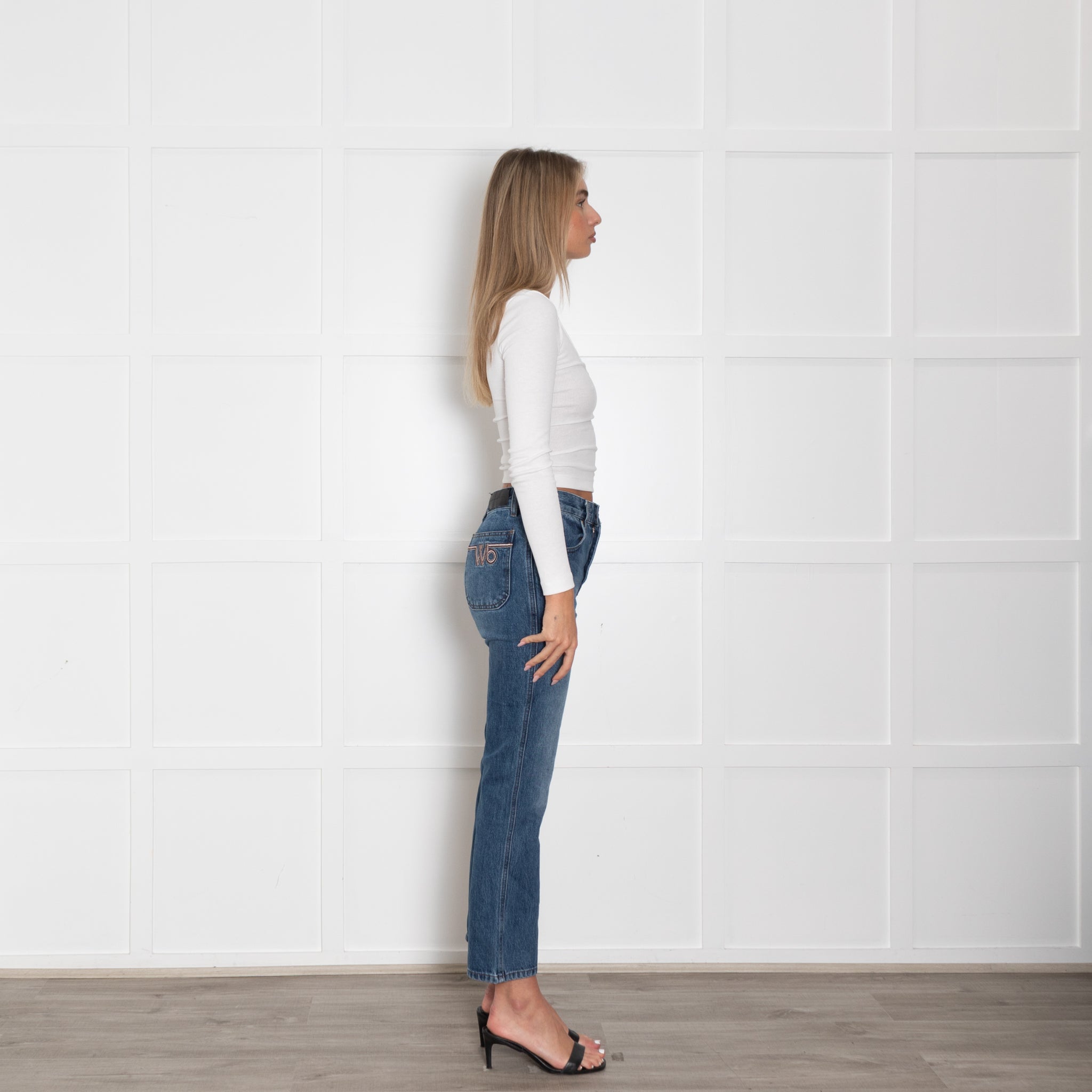 Victoria Beckham blue dark wash jeans, featuring a straight leg cut, two front pockets, two back pockets with a red and white embroidered line design, a zip-up and button-up front closure crafted with a soft cotton fabric.