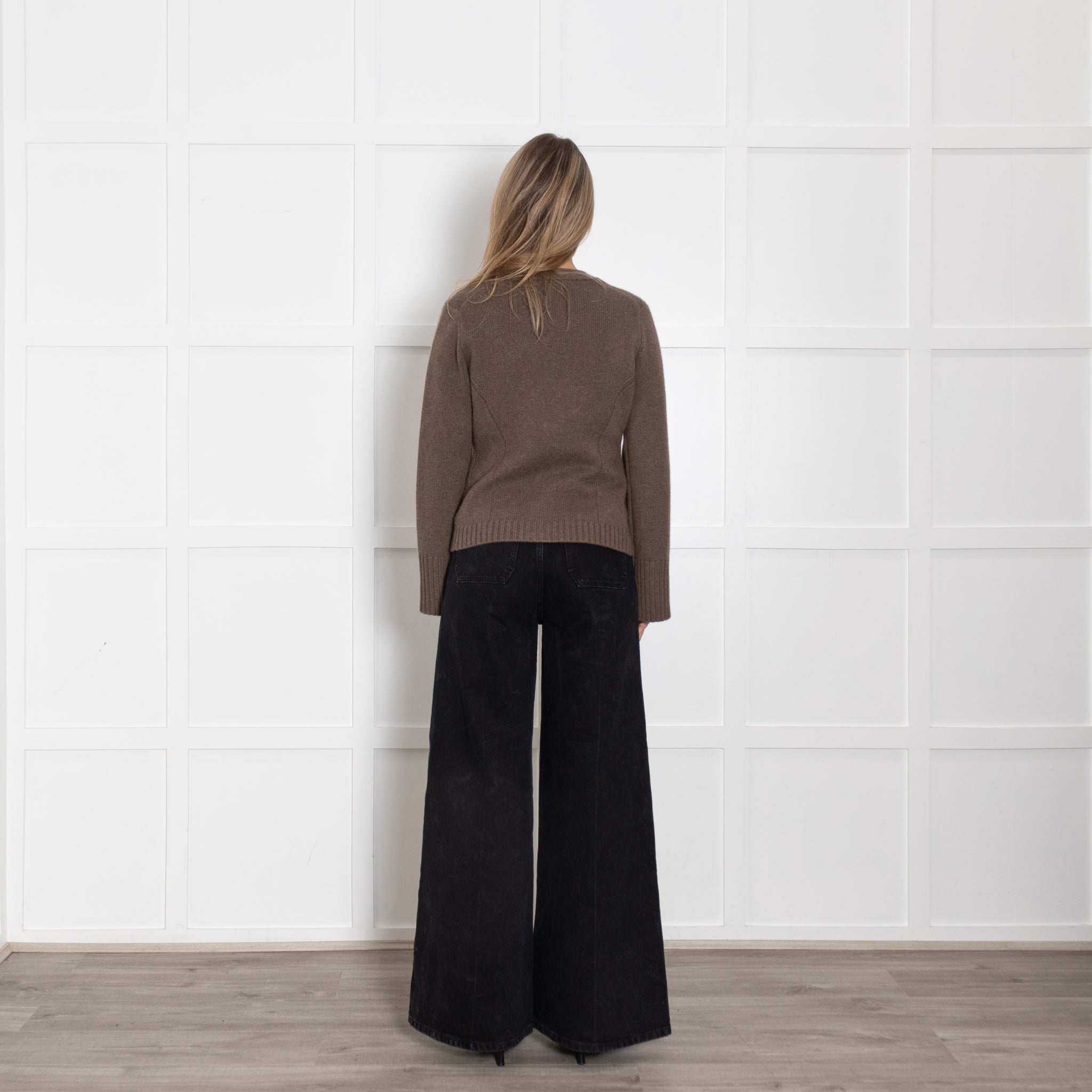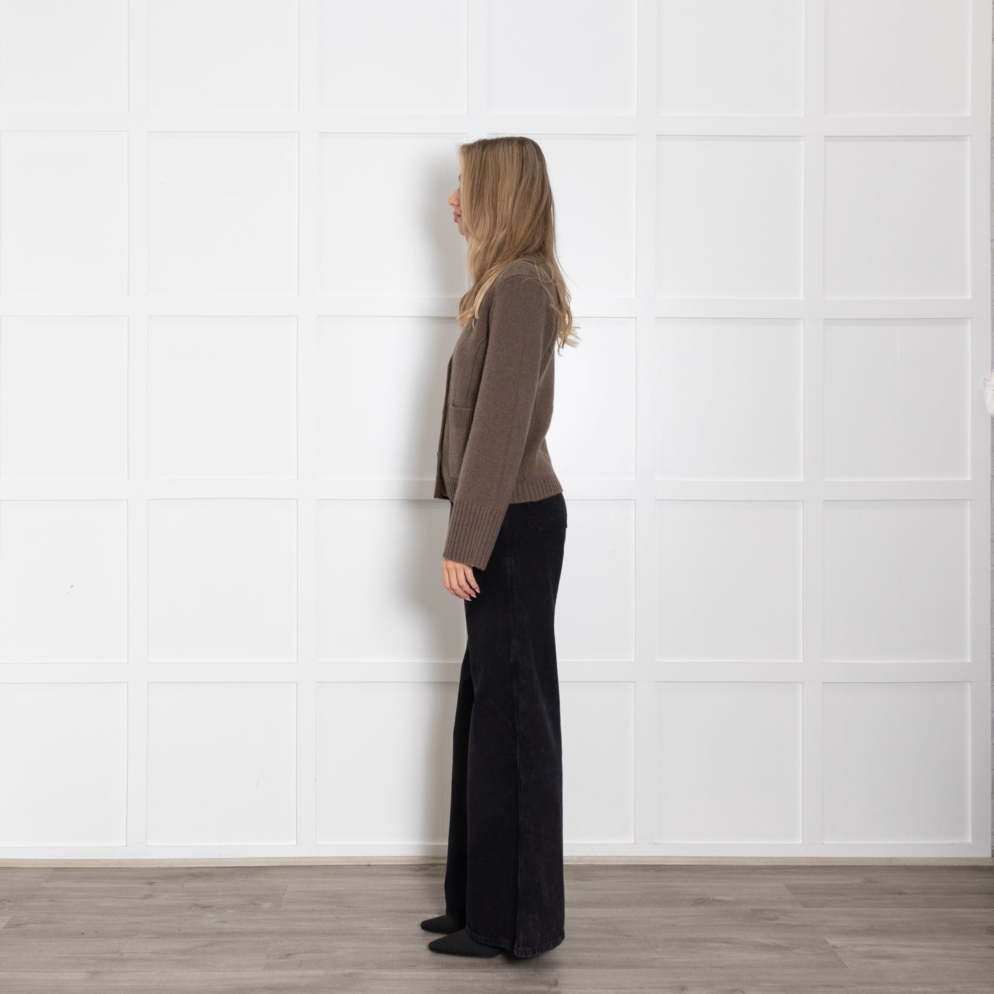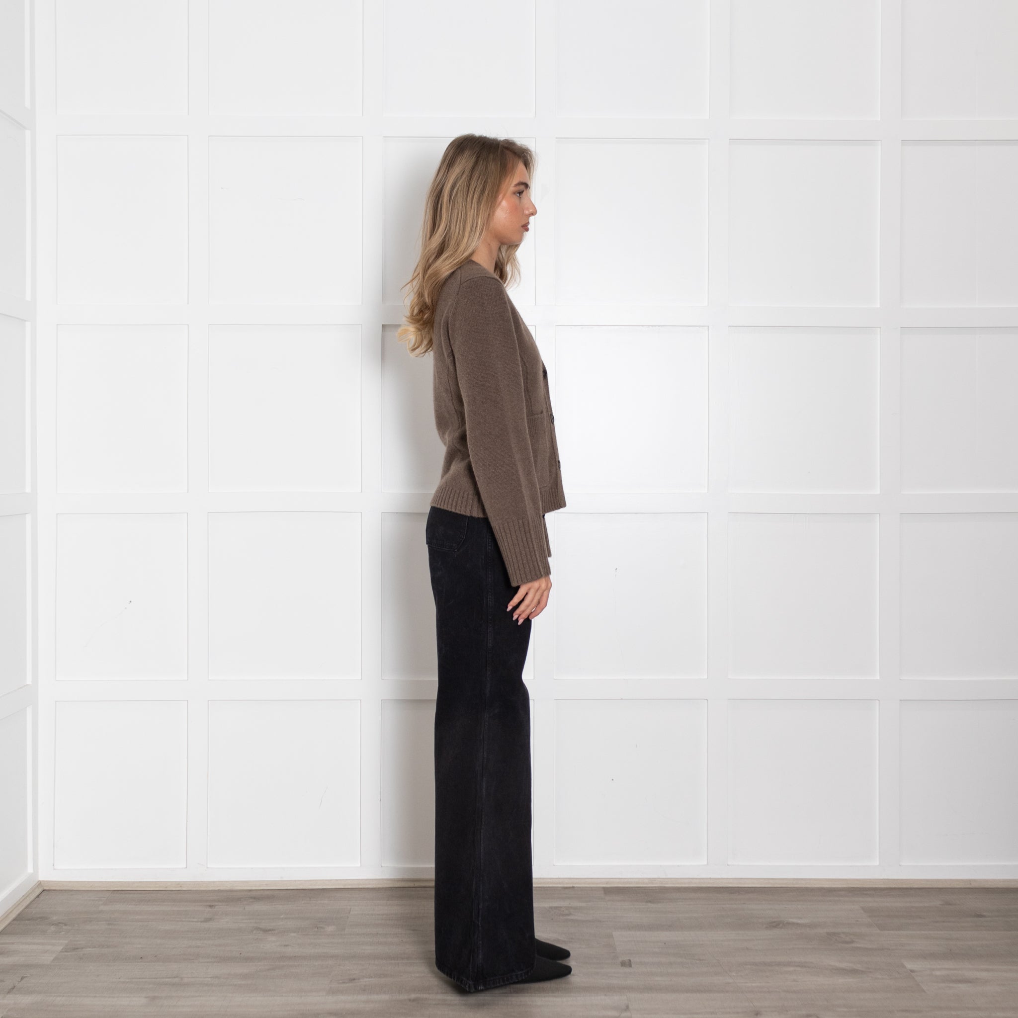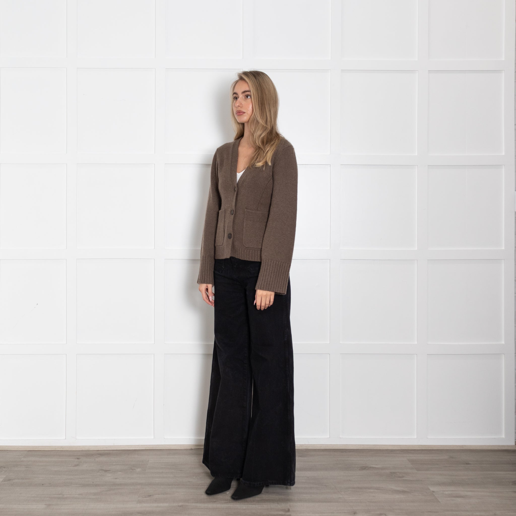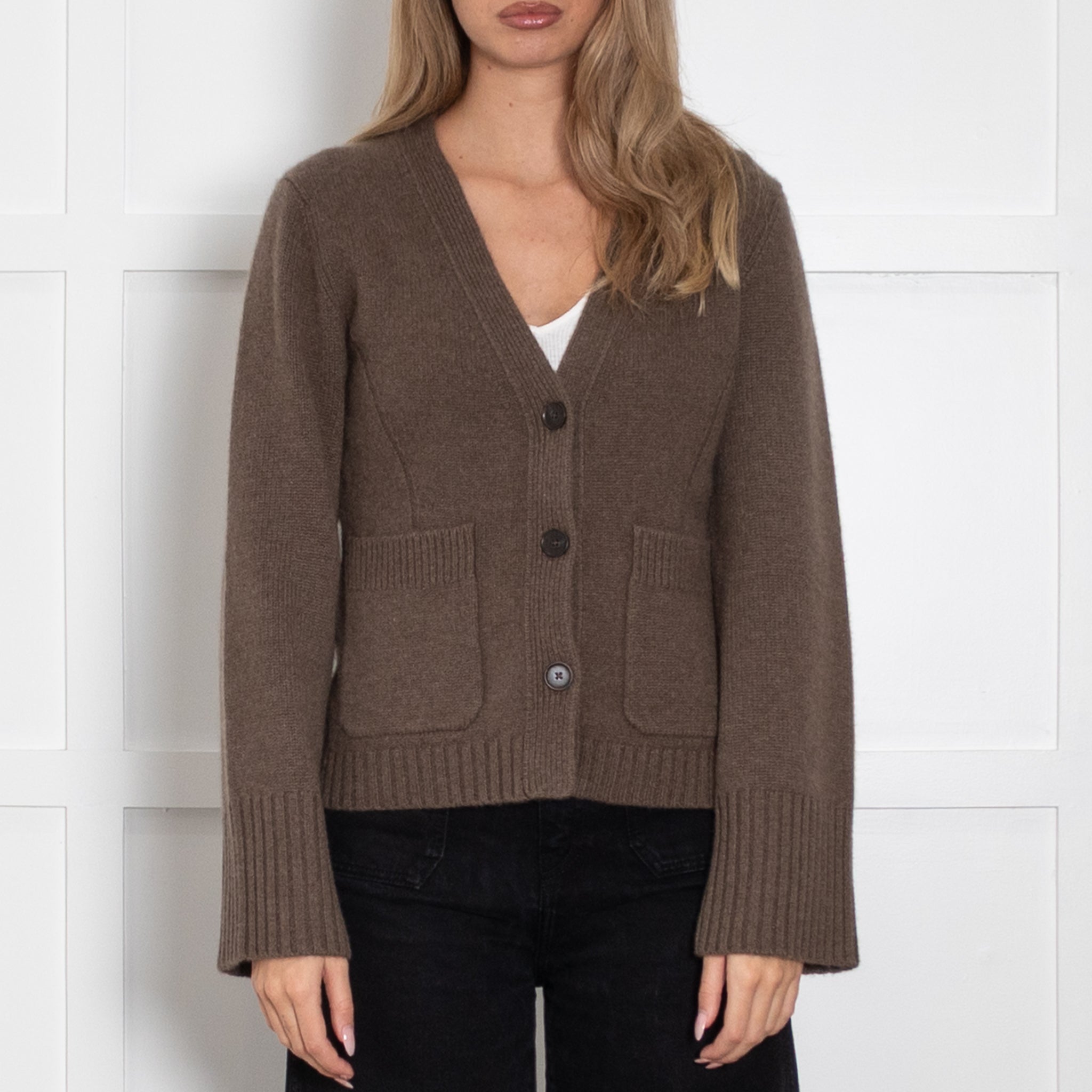 White + Warren long-sleeve brown cardigan, crafted with soft cashmere fabric, a large V-neckline, with a three-button up front closure design, and two front spacious pockets.