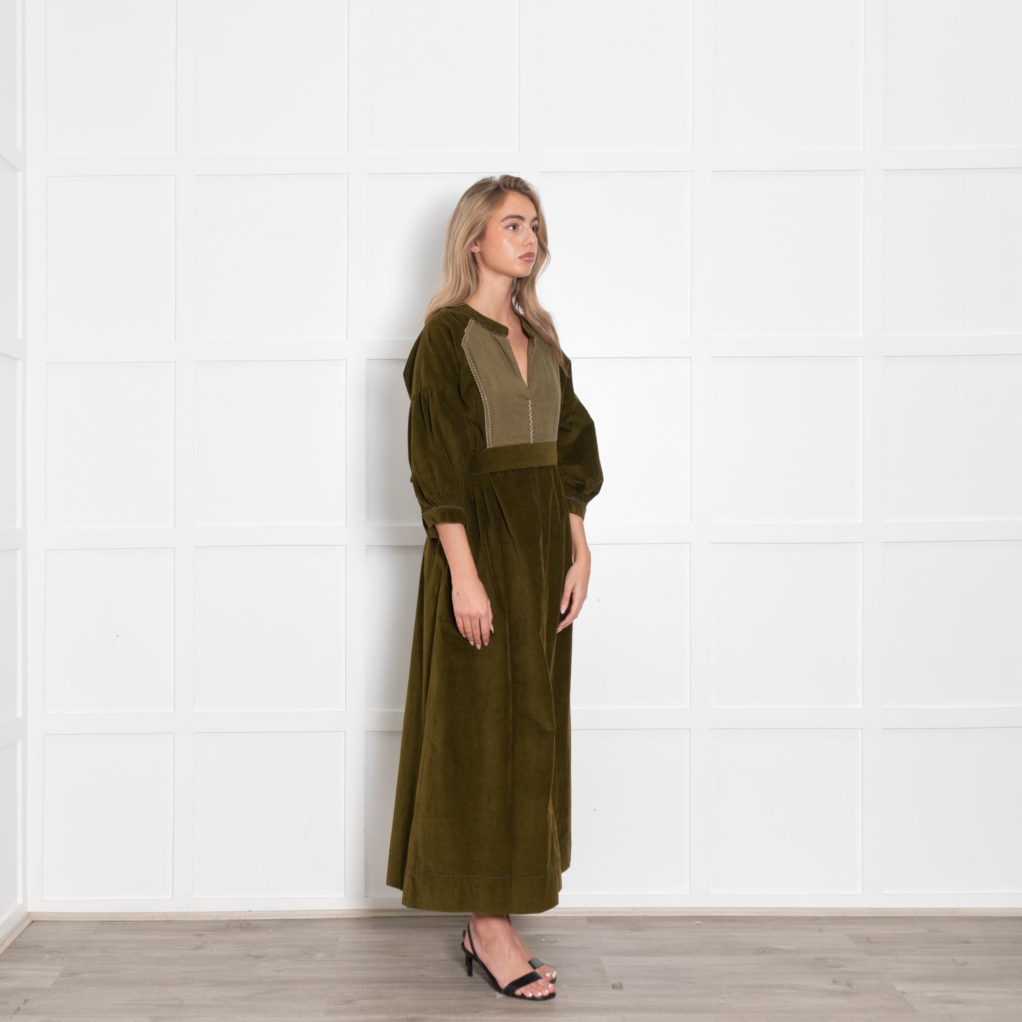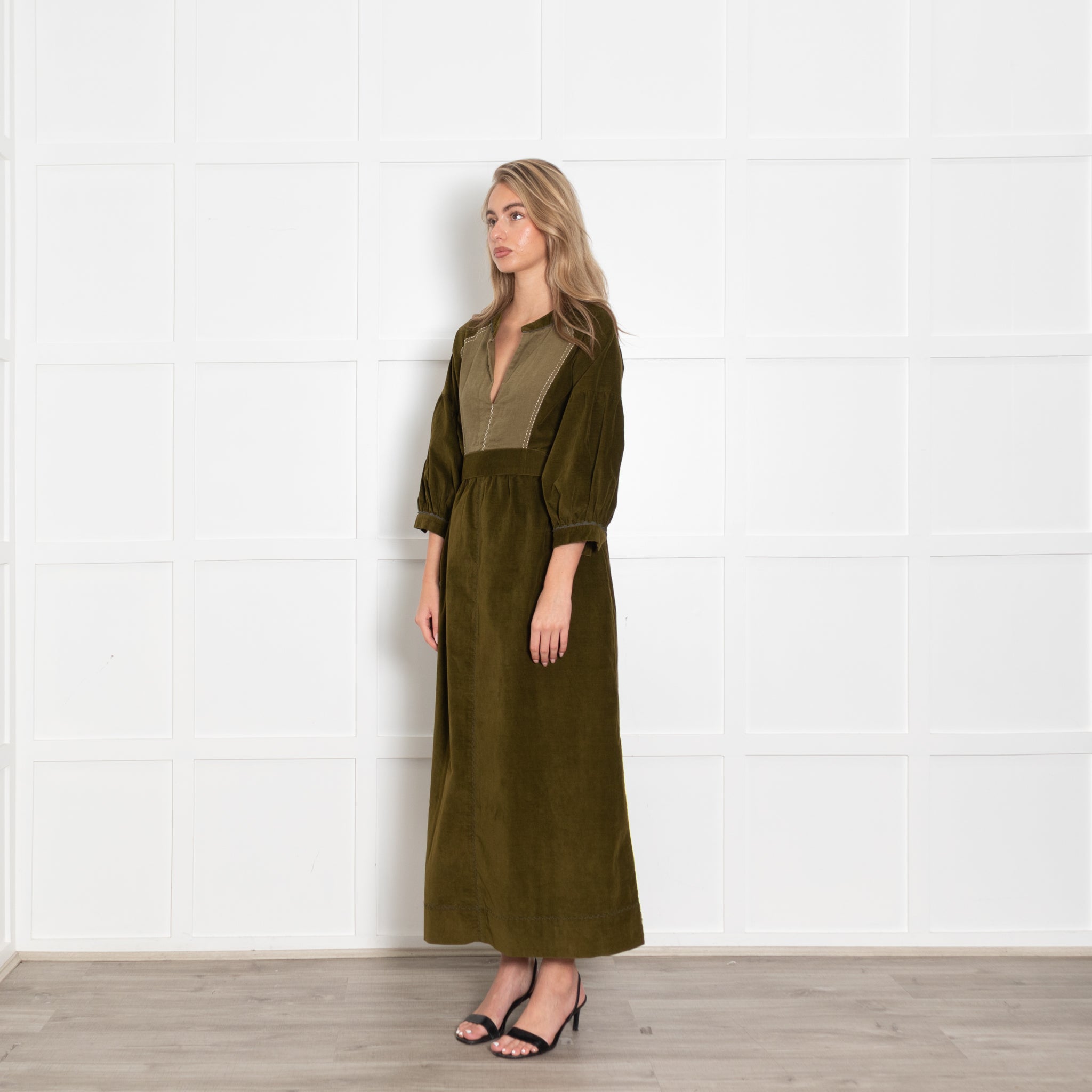 Wiggy Kit's olive-green New Market maxi dress with elbow-length sleeves, a belted-tye at the waist and a V-necked textural bib panel.