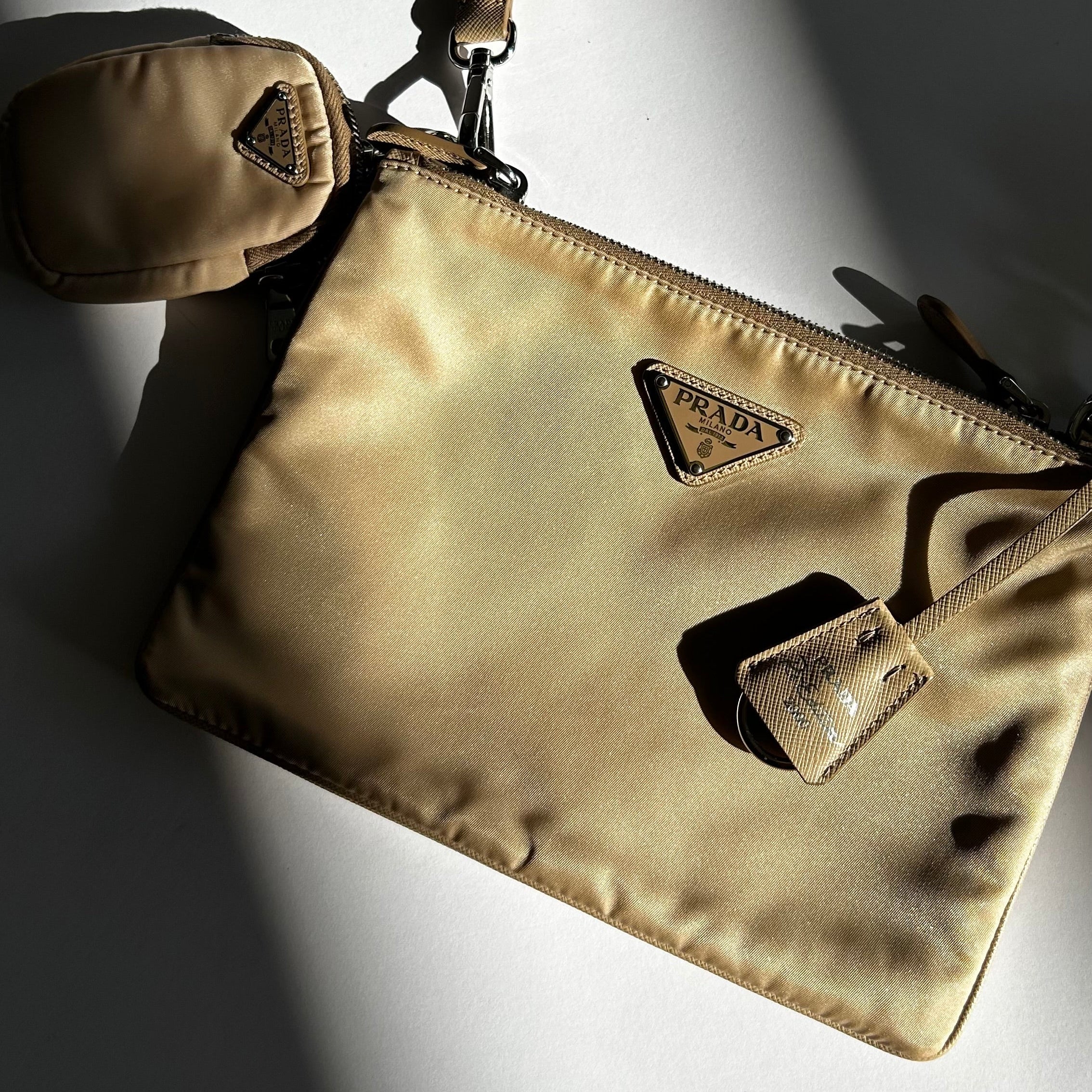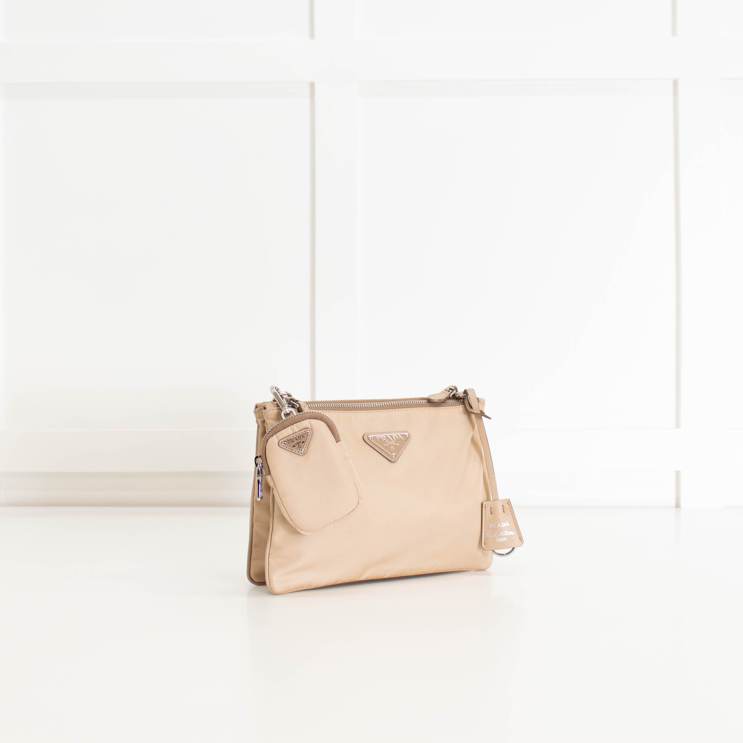 Prada beige nylon Re-Edition 2000 crossbody bag with an adjustable strap, clip on small accessories pouch, silver-tone hardware, and a front triangle Prada plaque. Finished with a top zip closure. With the original dust bag.
