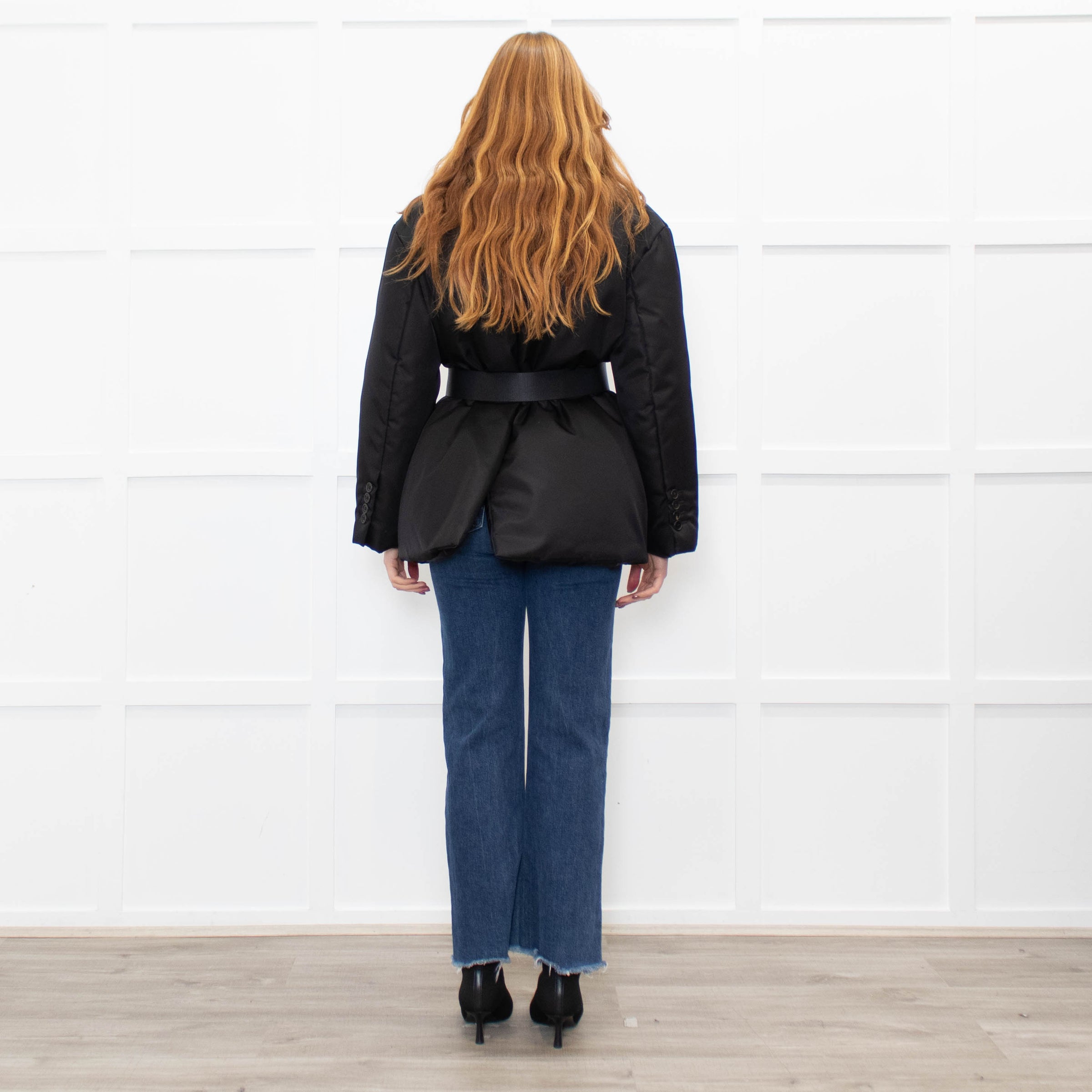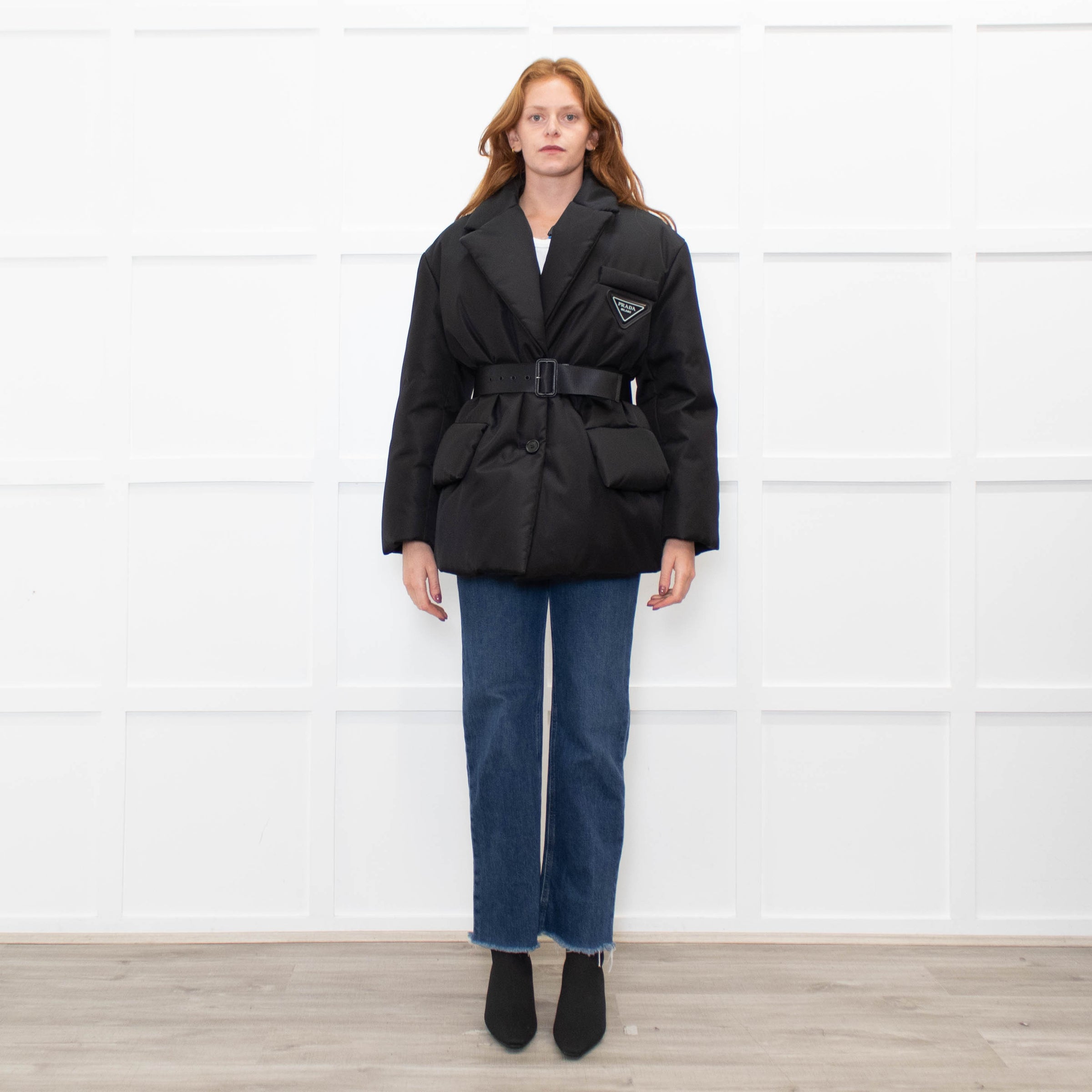 Prada black Re-Nylon down puffer jacket with an oversized pointed collar and lapel and iconic triangle logo feature on the breast pocket. This coat also features two large front flap pockets and has a detachable waist belt. Current season, RRP £2,650.