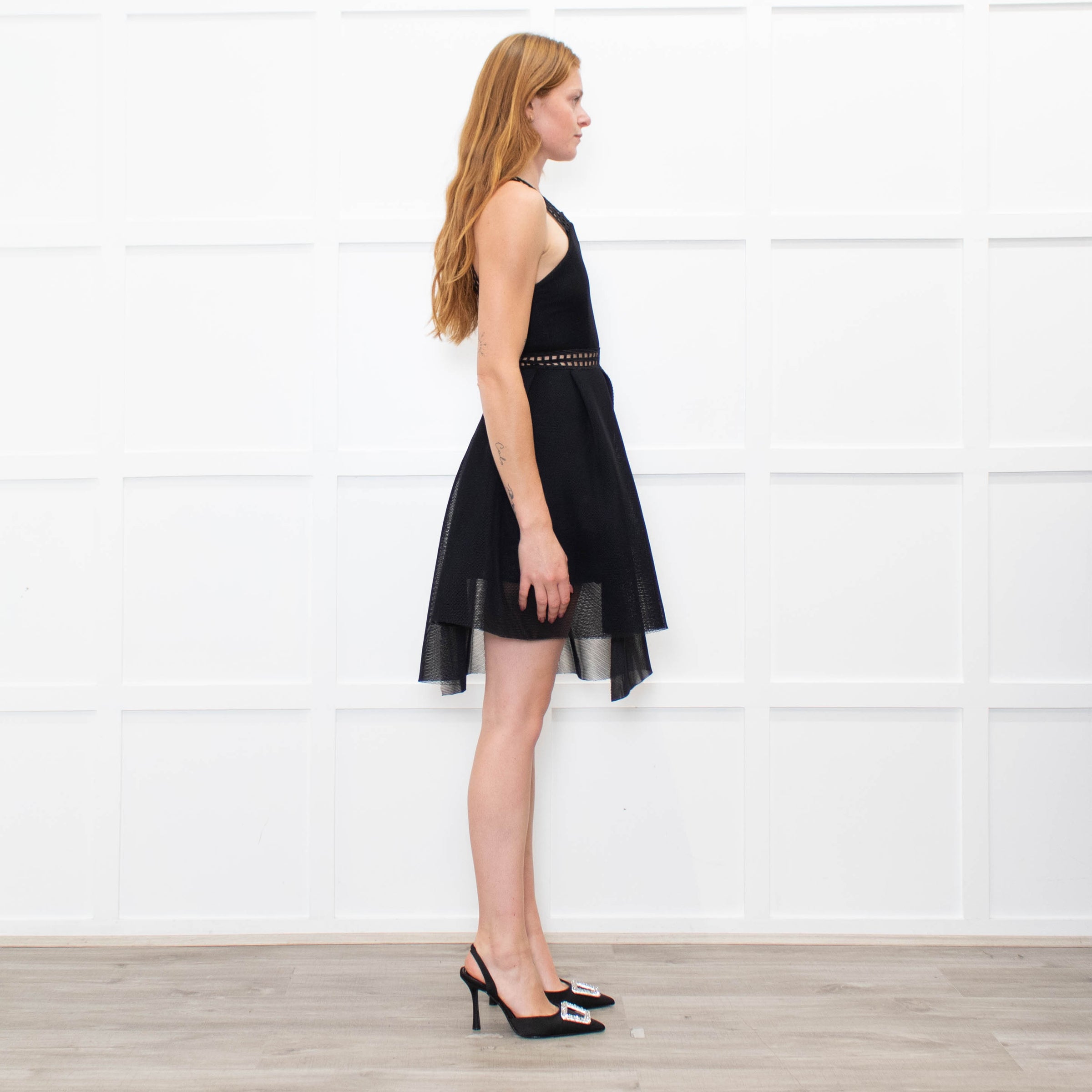 Self-Portrait black net lace shoulder mini dress with an asymmetrical skirt and a lace waistband.