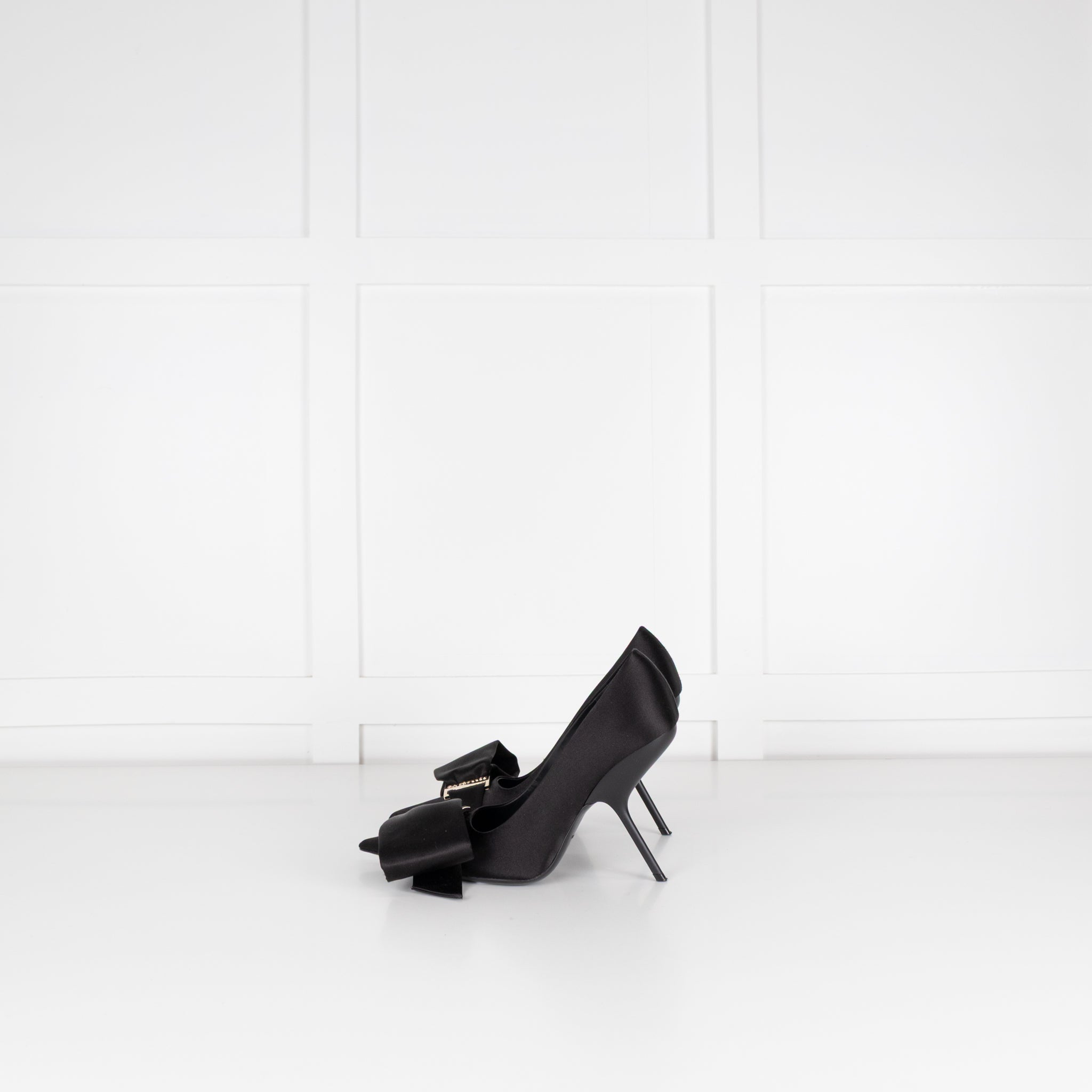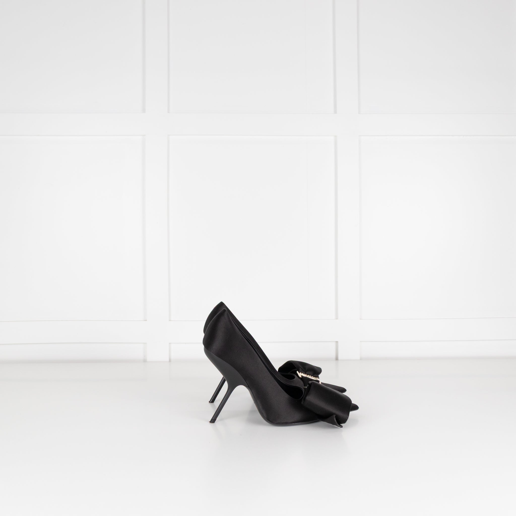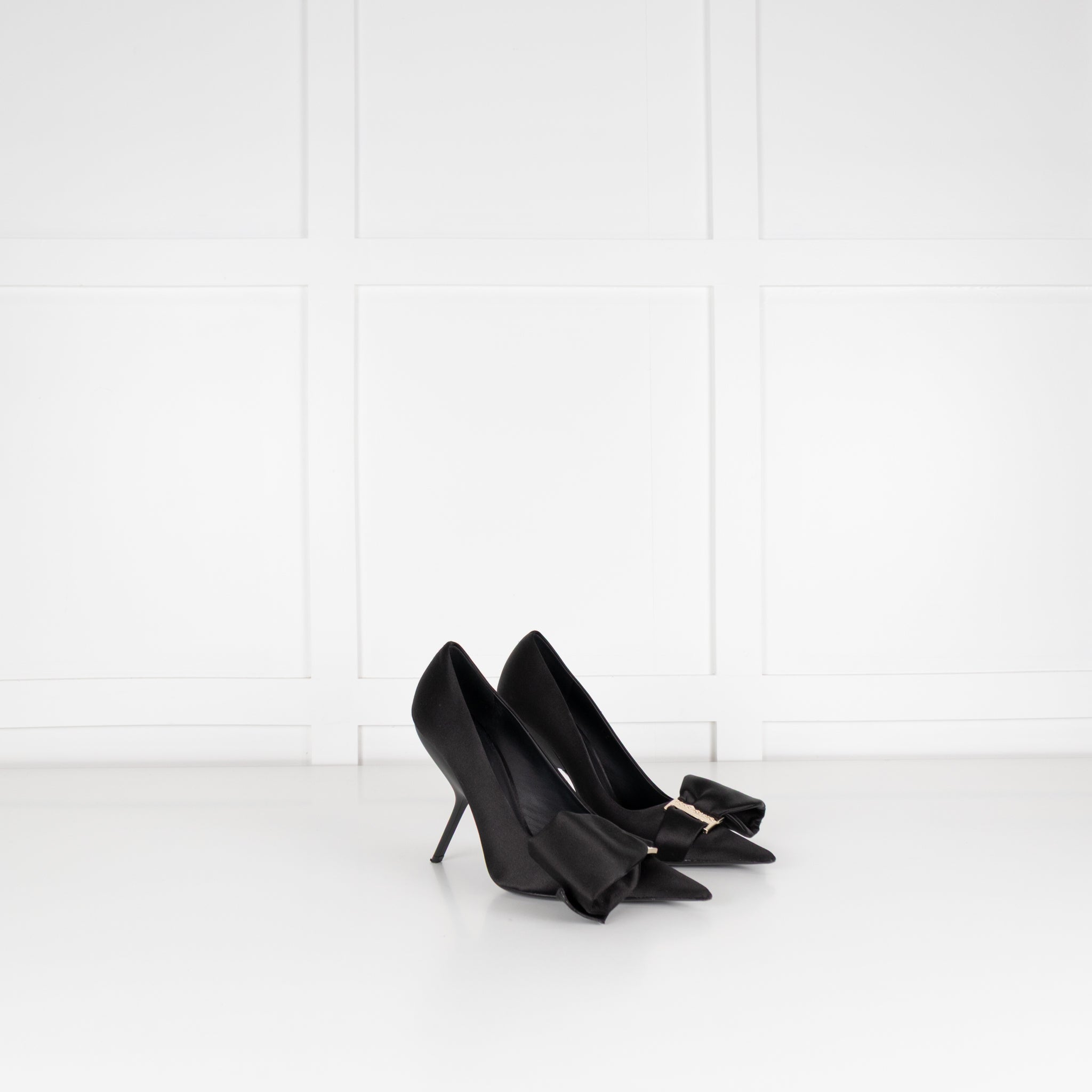Ferragamo Erica x5 Heels with dramatic bow. These black satin pointed heels are very unique with the angular heel. Accompanied by original box and dust bag.