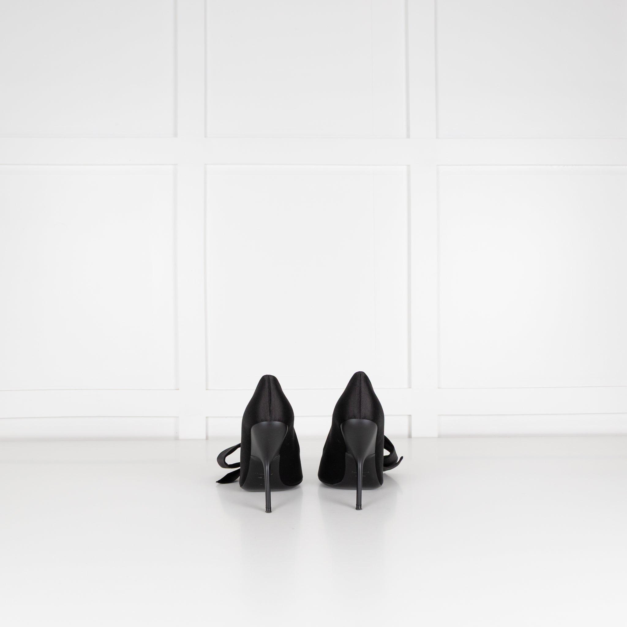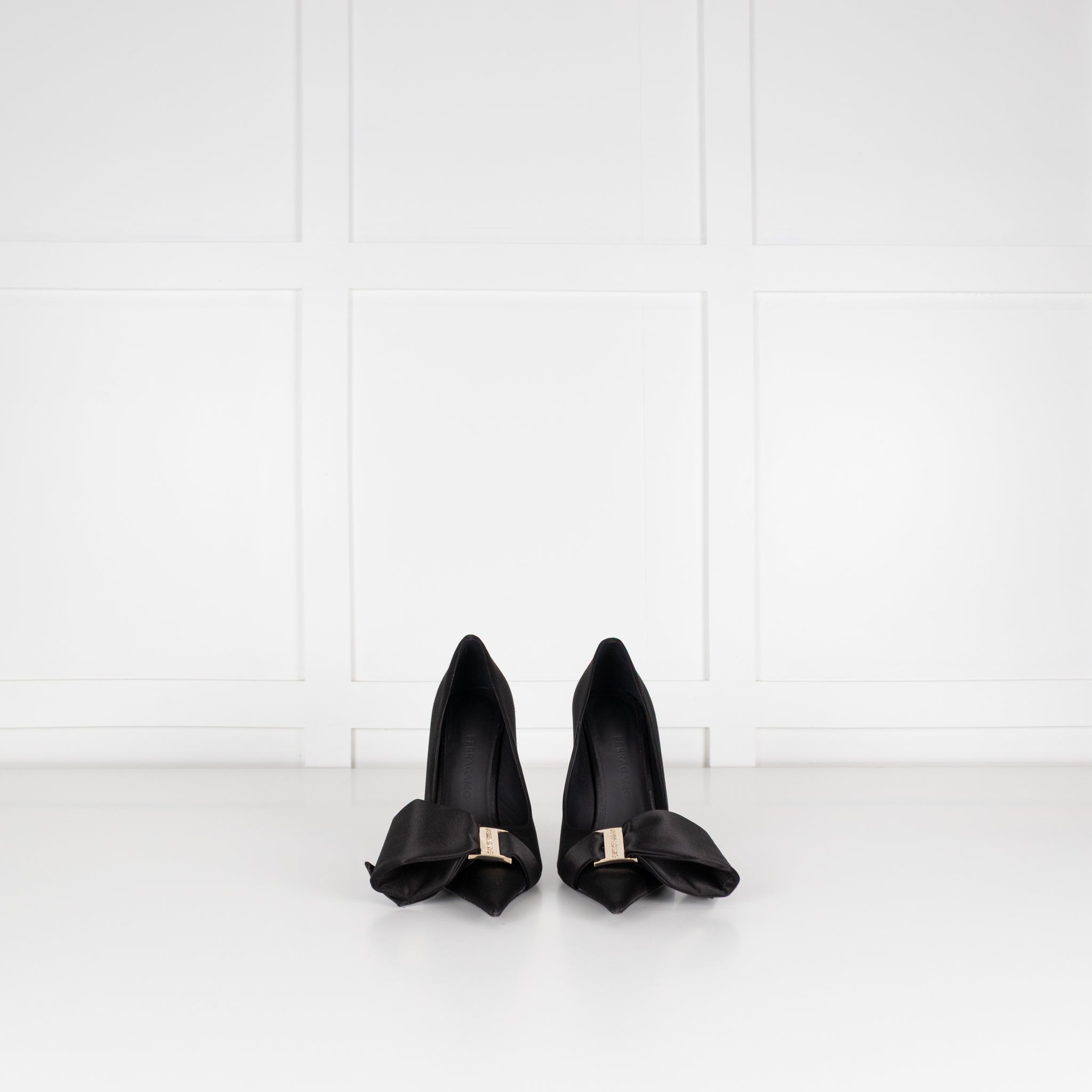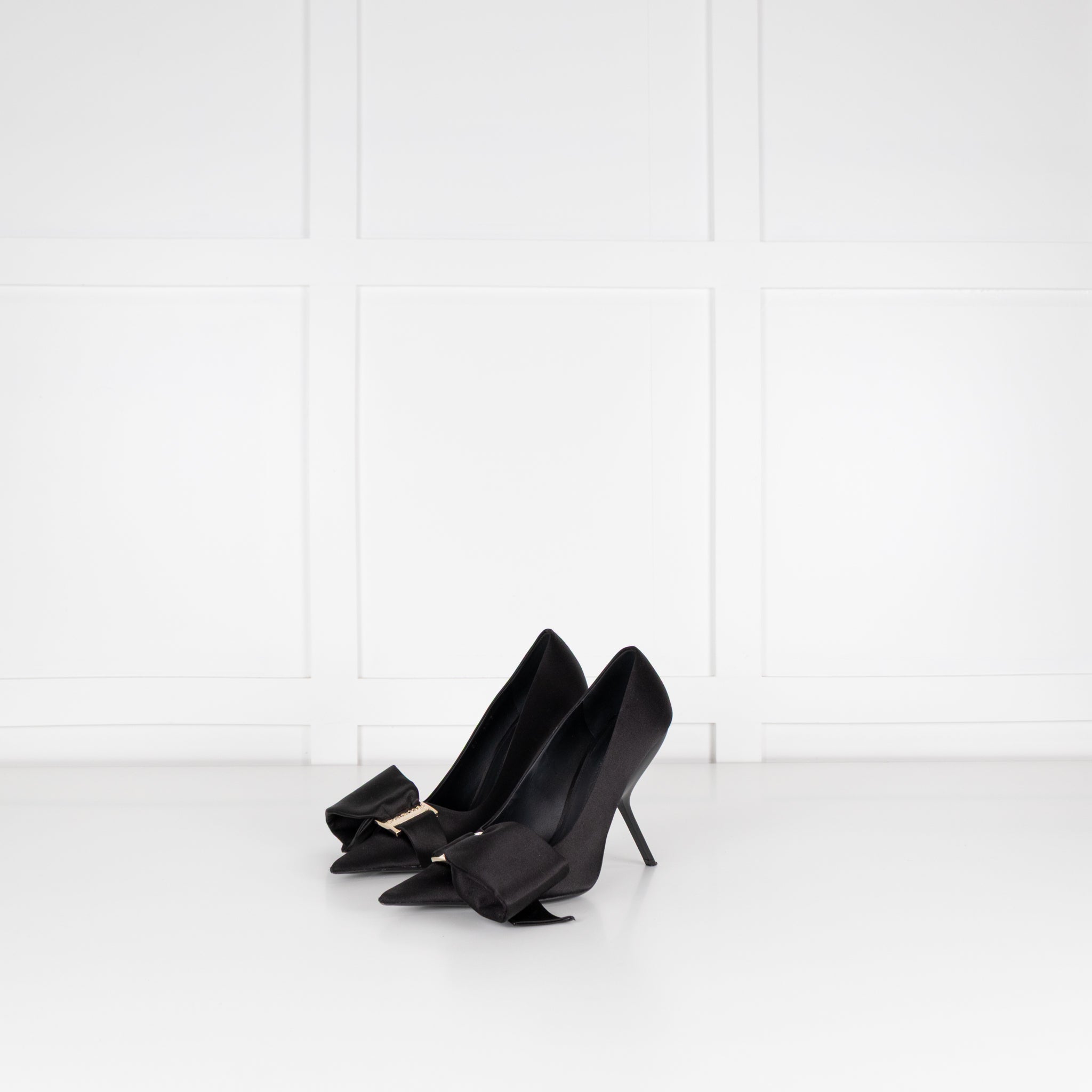 Ferragamo Erica x5 Heels with dramatic bow. These black satin pointed heels are very unique with the angular heel. Accompanied by original box and dust bag.