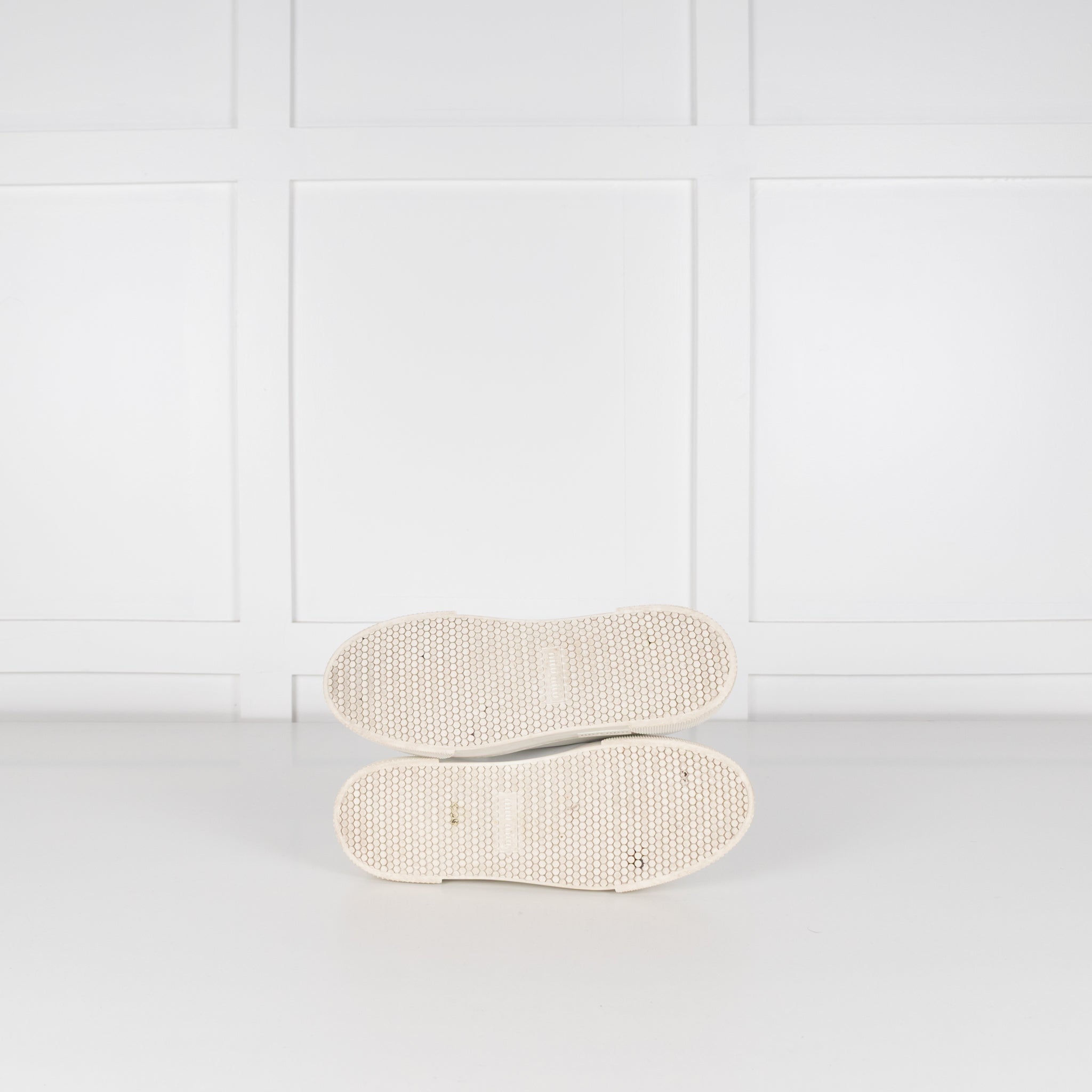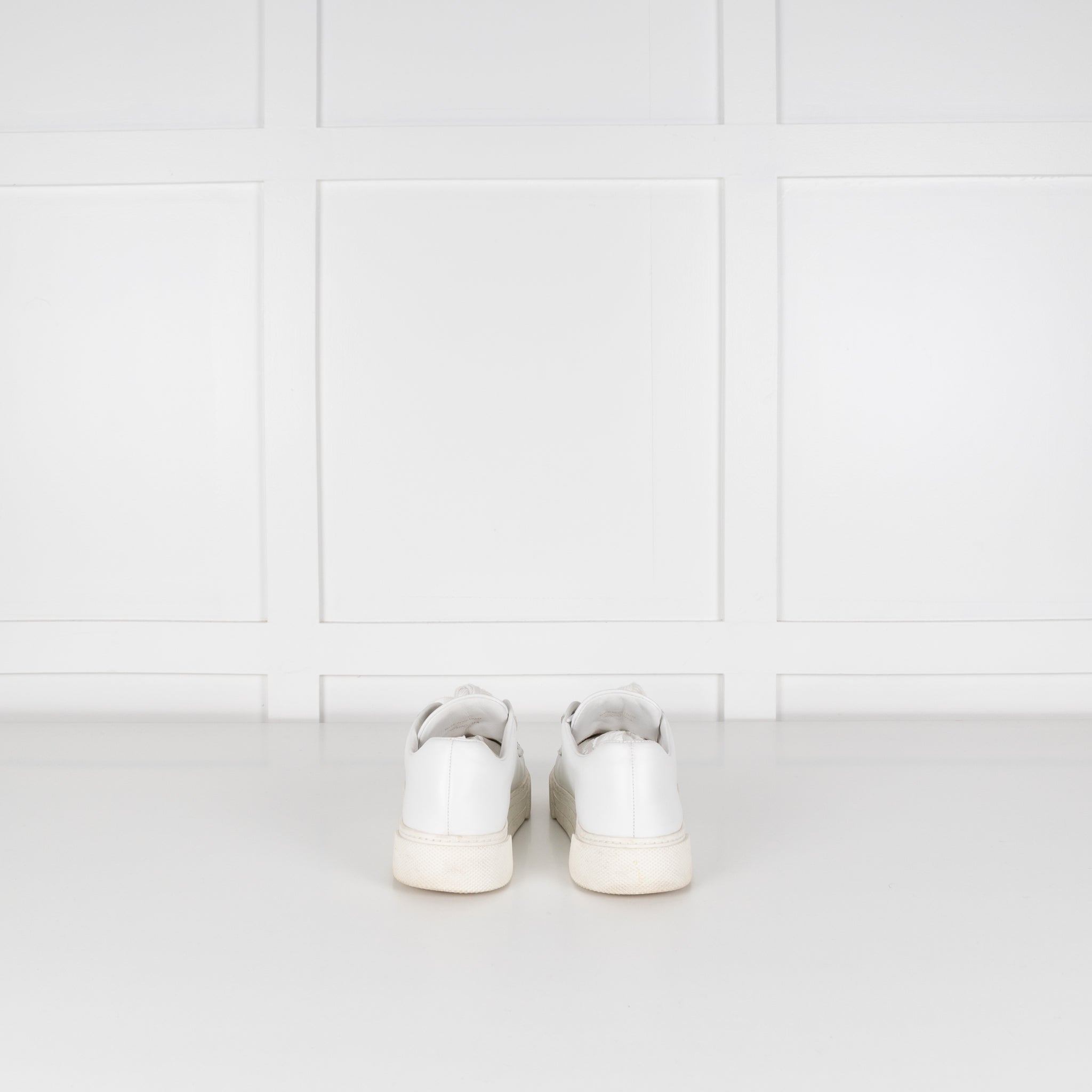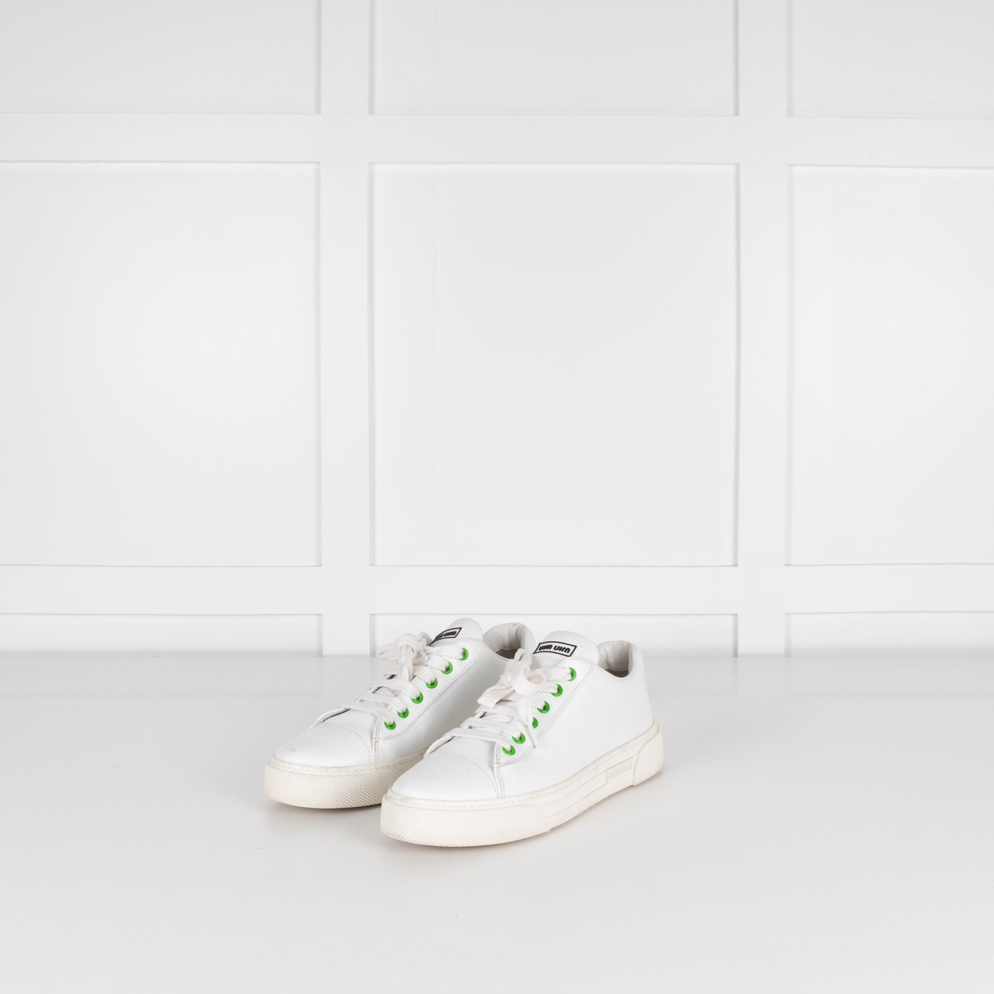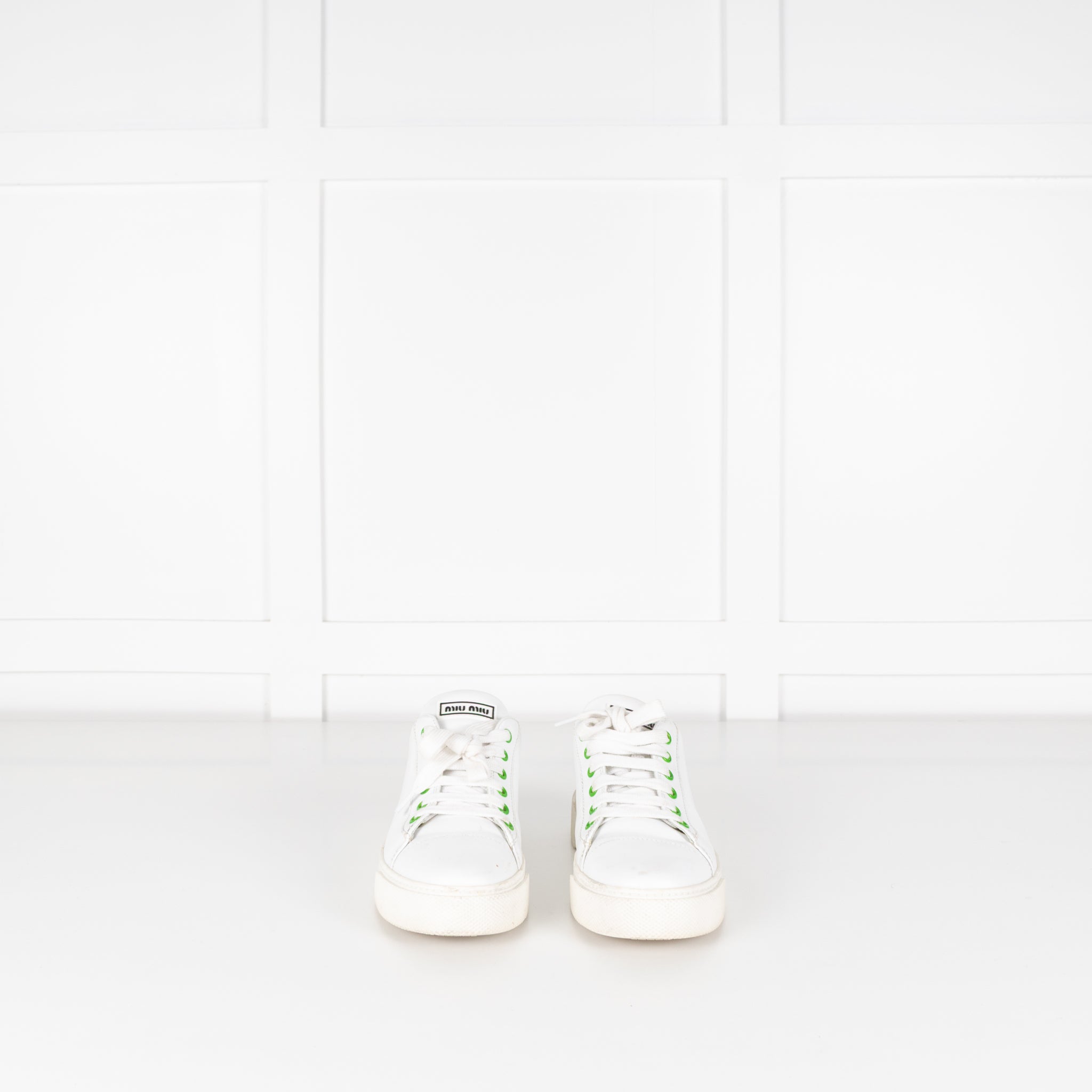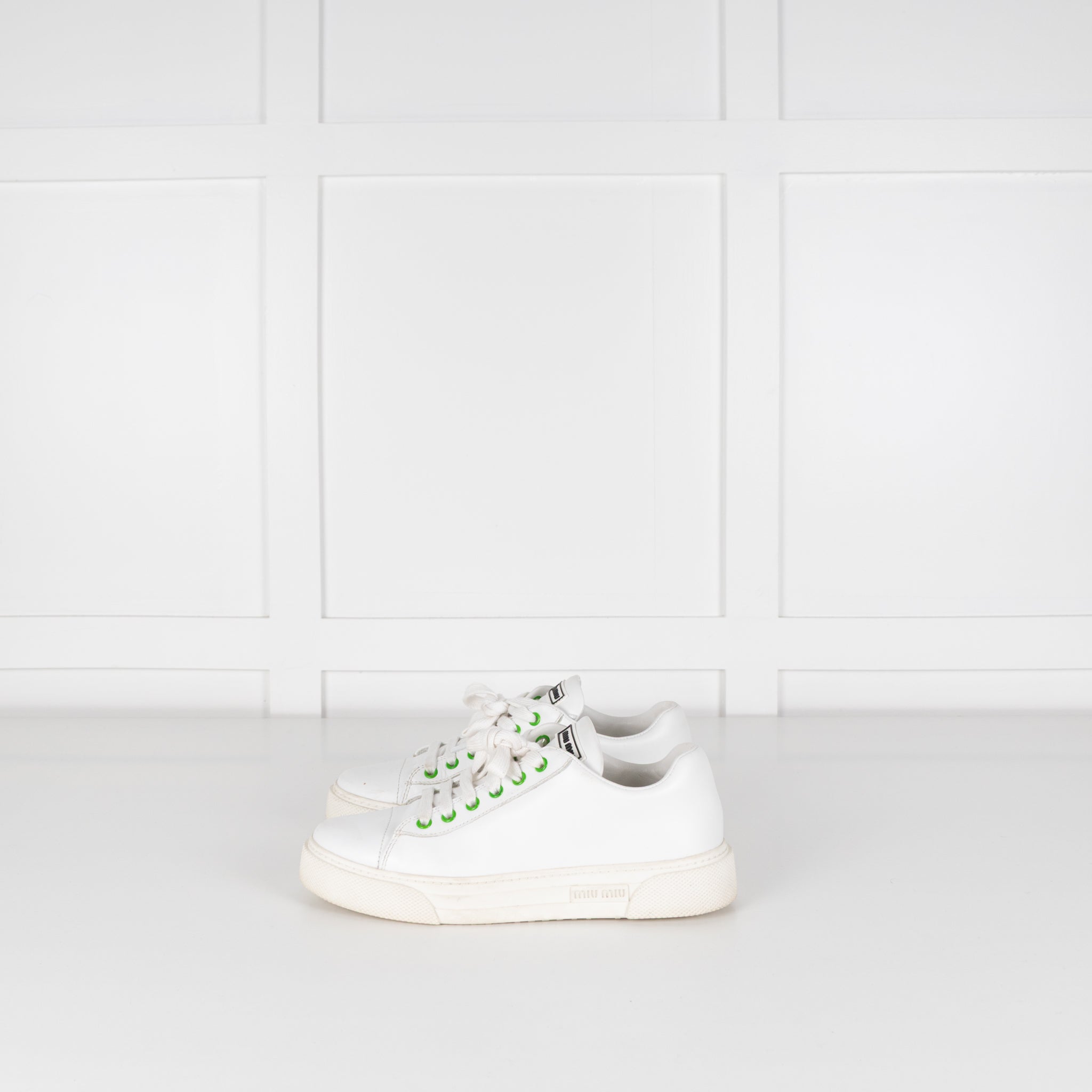 Miu Miu white leather trainers with green eyelet detailing. 'MIU MIU' on the tongue of the shoe. Original box included.