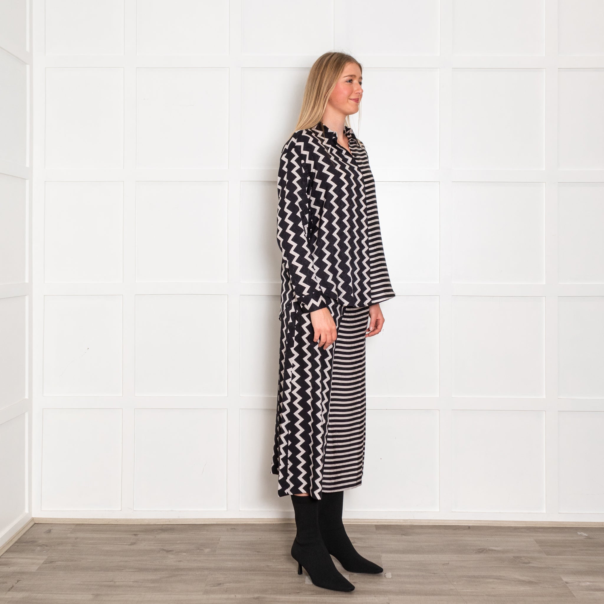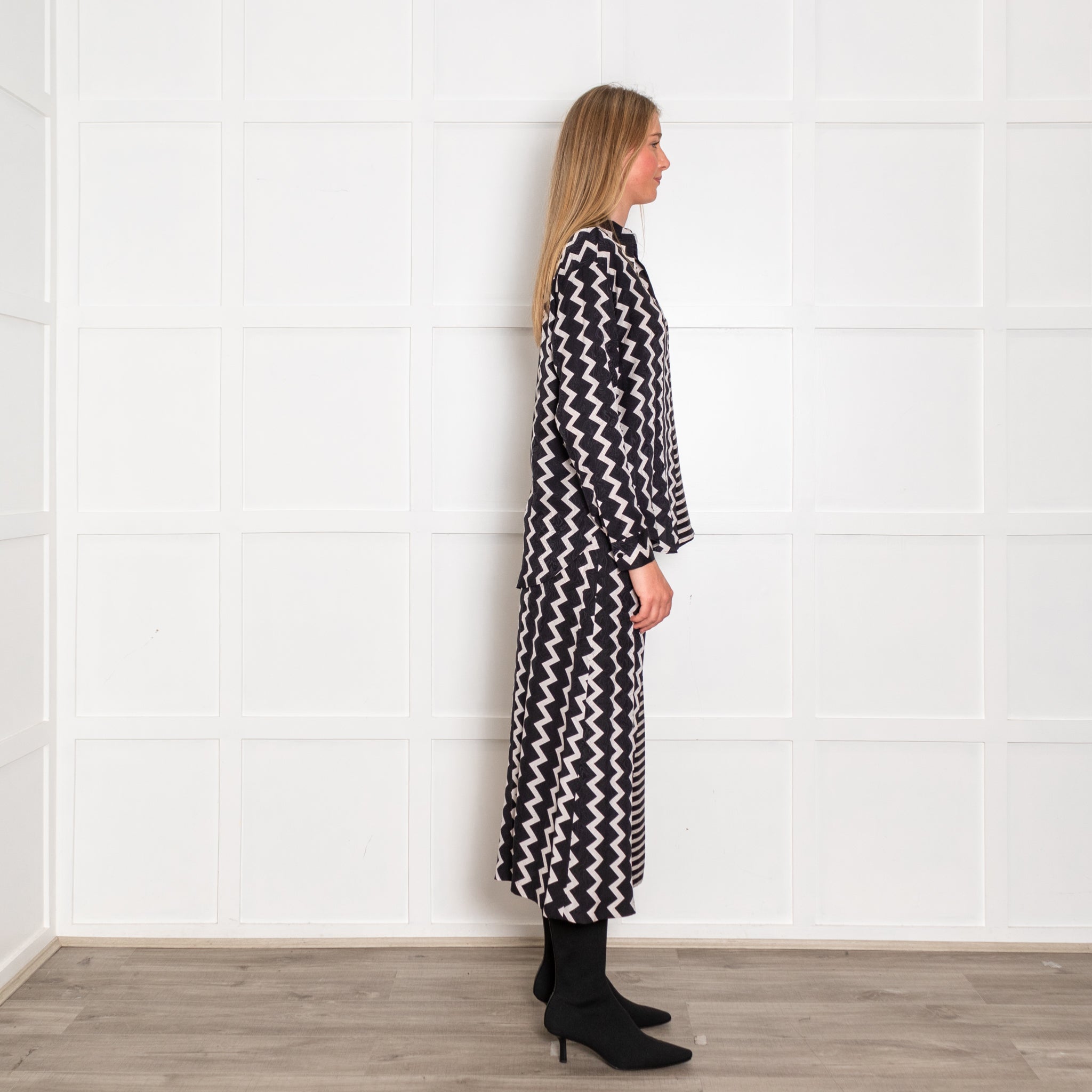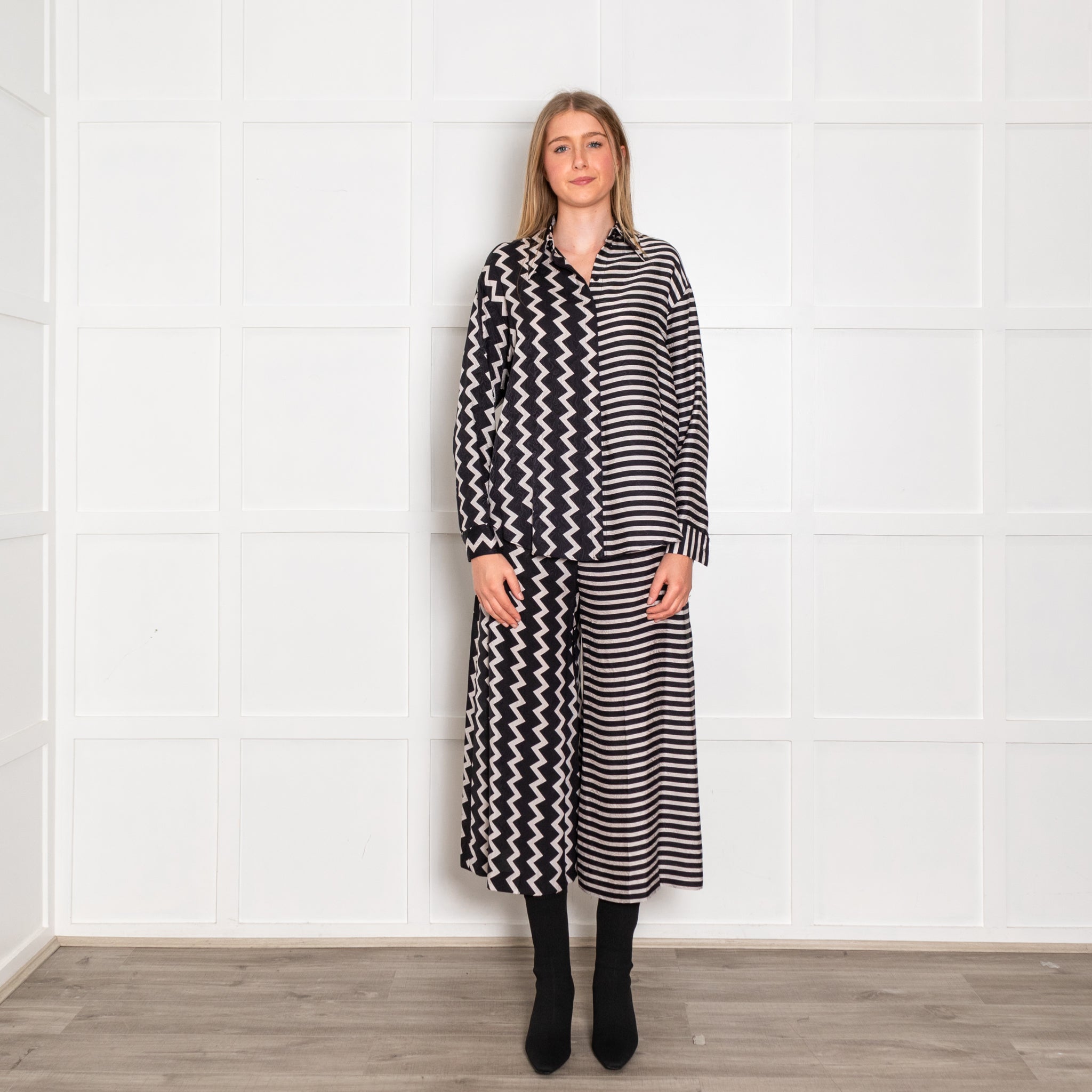 Stella McCartney all-silk black and white co-ord, featuring a gorgeous zig-zag striped design. A front button closure with a classic folded collar. The trousers also feature a front zip and button closure.