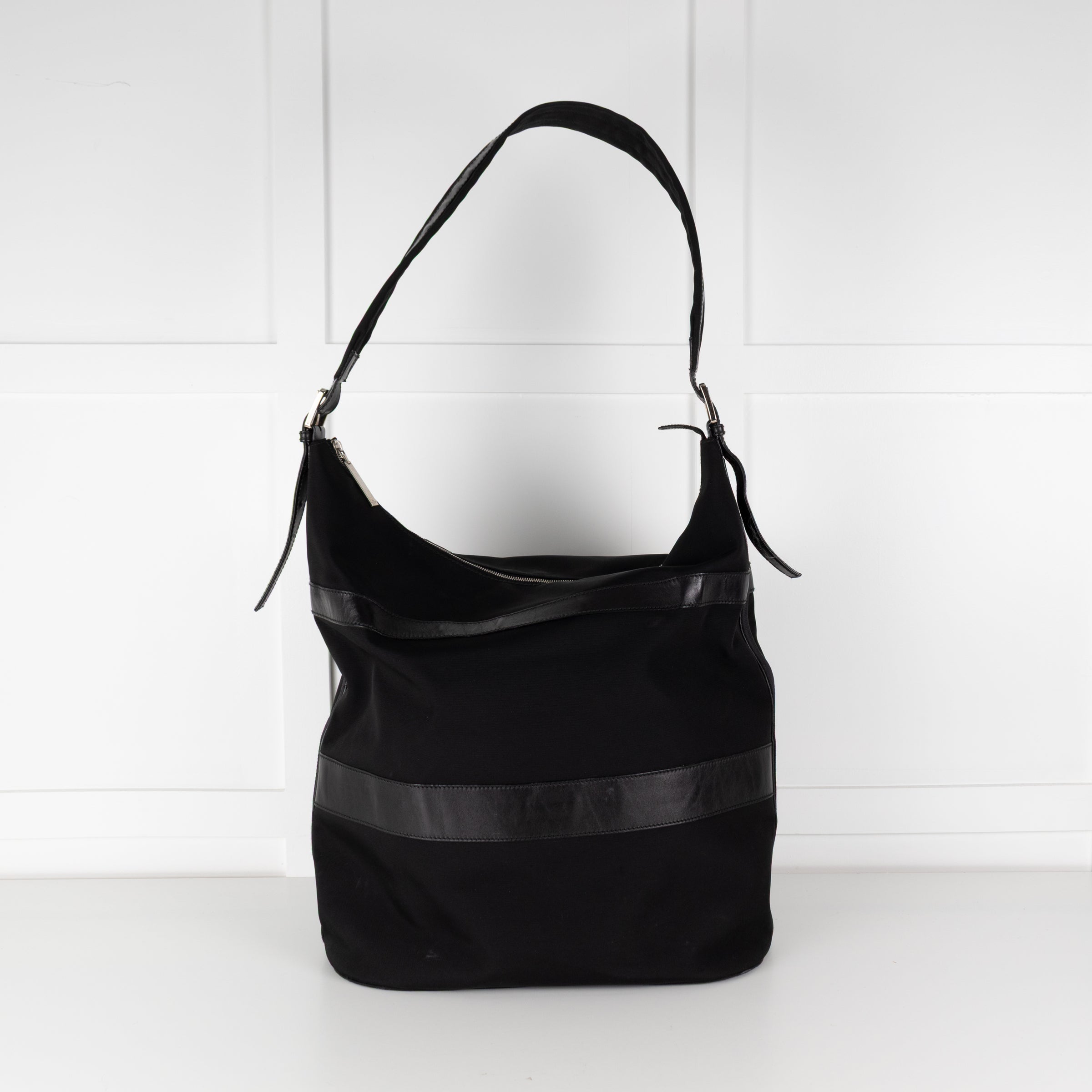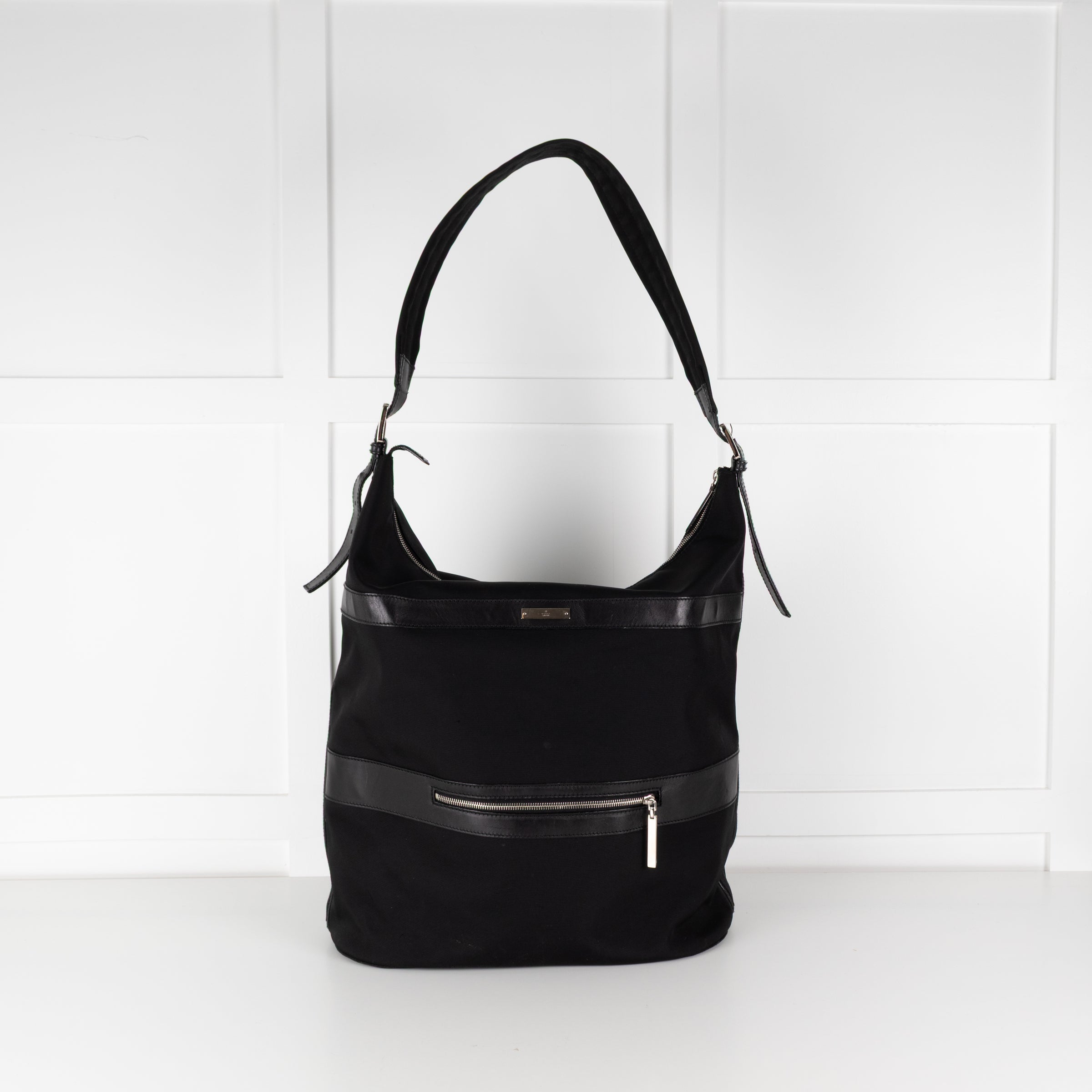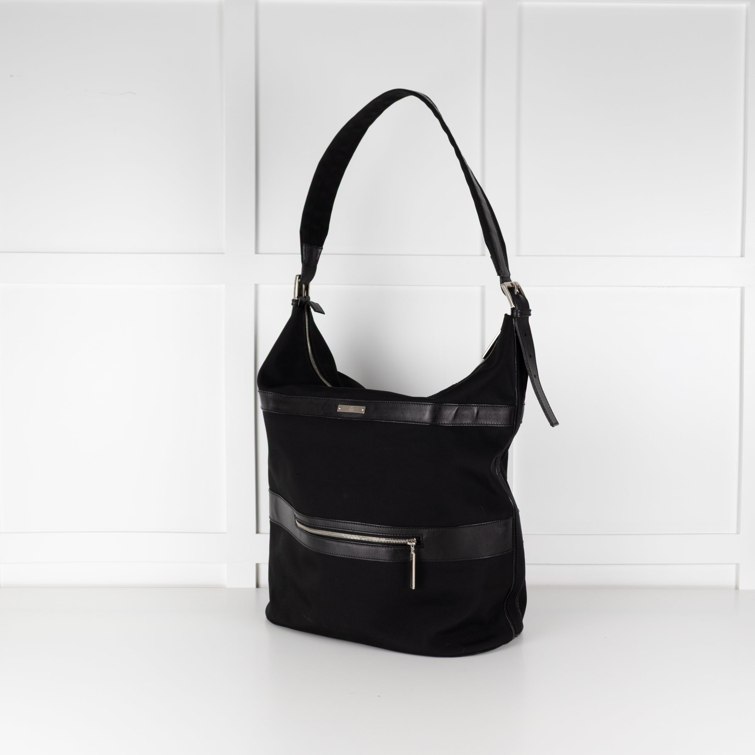 Gucci black nylon large shoulder travel bag with an adjustable strap, silver-tone hardware, a top zip closure, leather trims, a small branded plaque on the front, and a front zipped pocket. With the original dust bag.