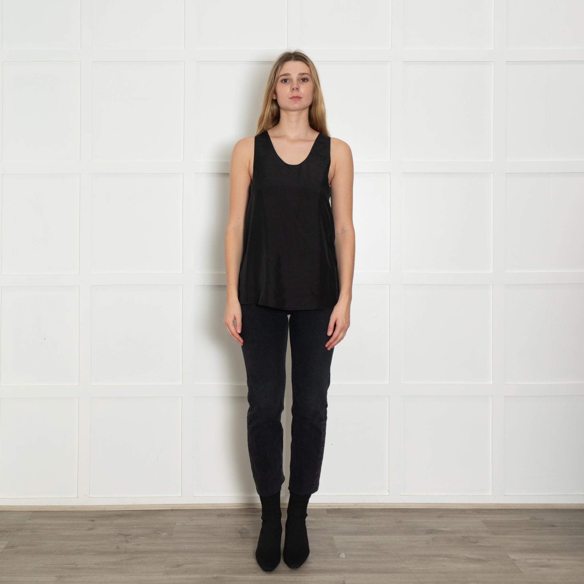 Chloe black silk vest top with a rounded neckline and an A-line cut.